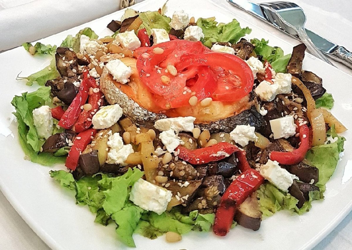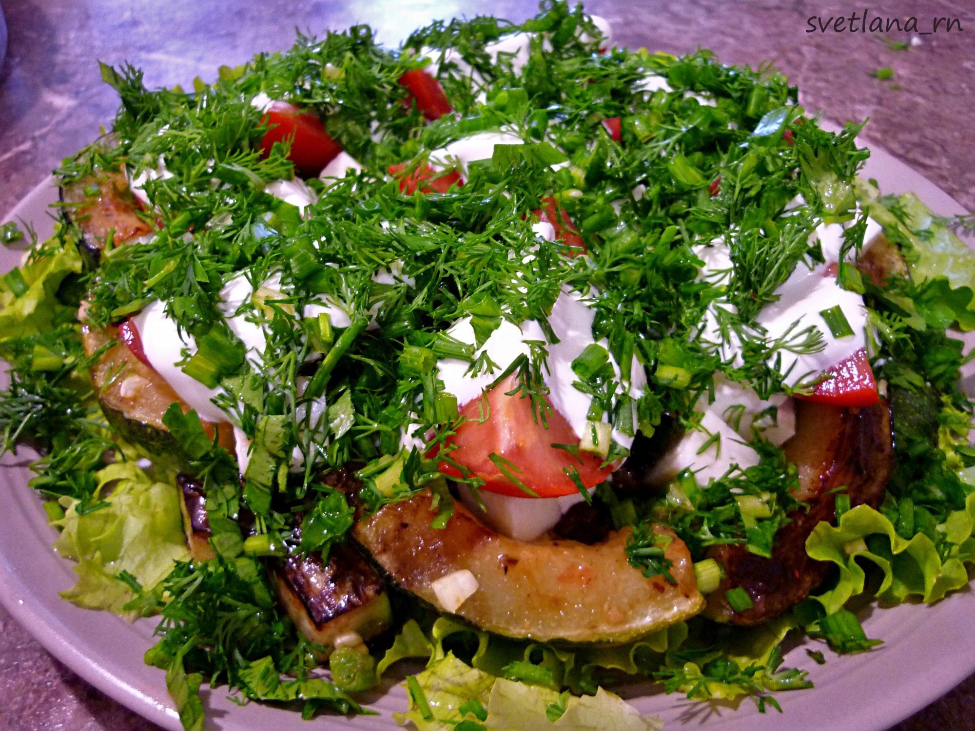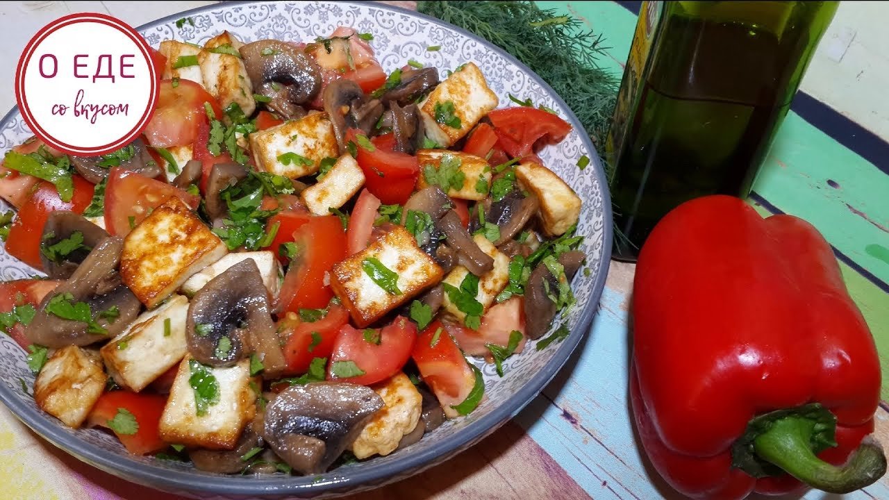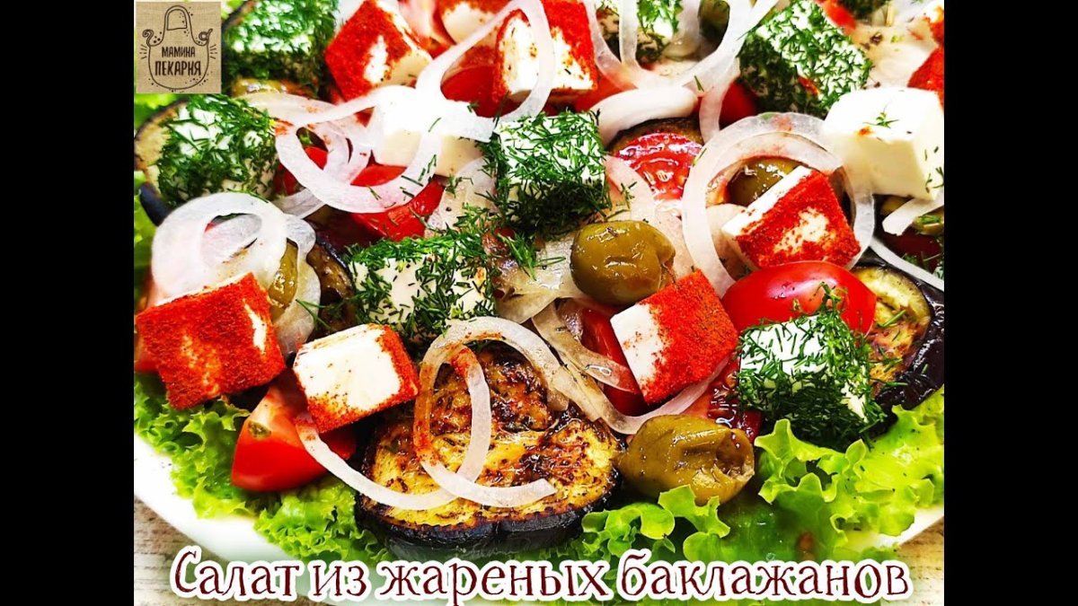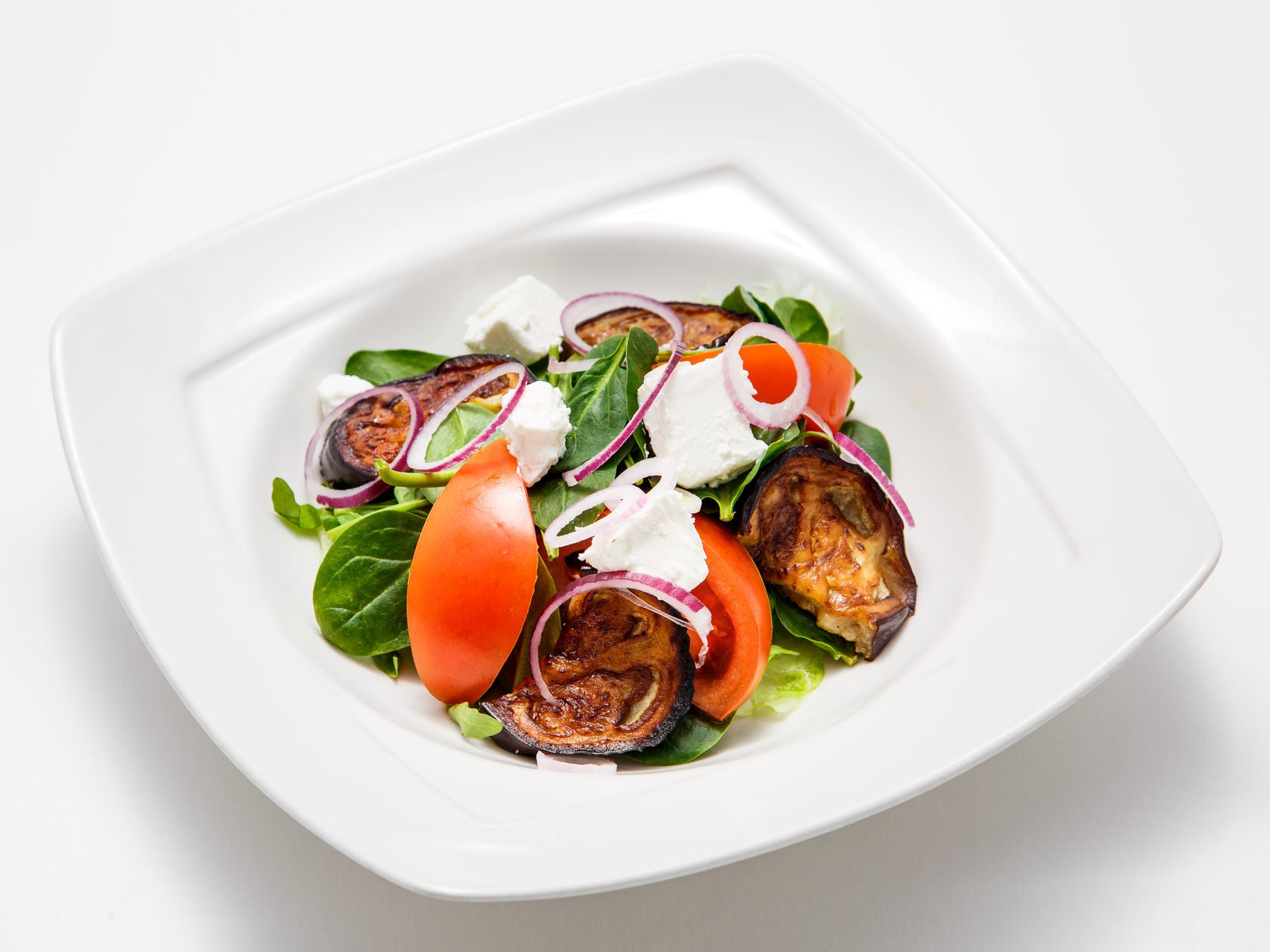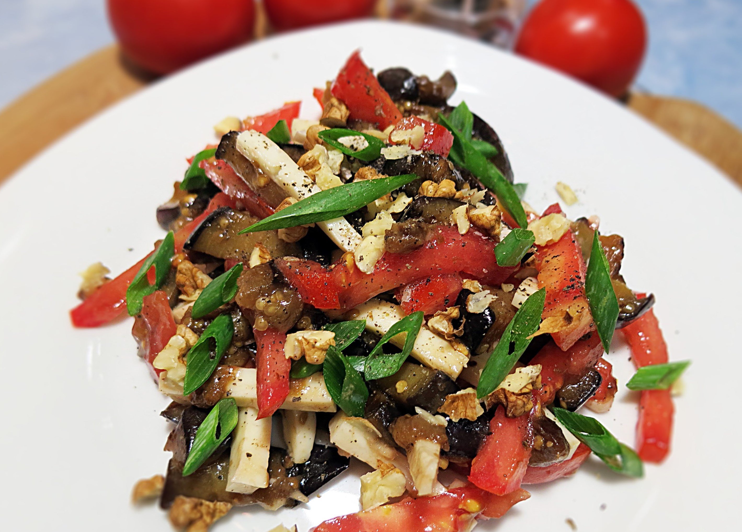 Салат с жареными баклажанами и помидорами, зеленью,брынзой