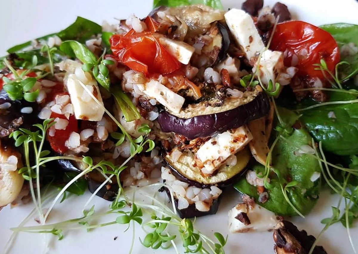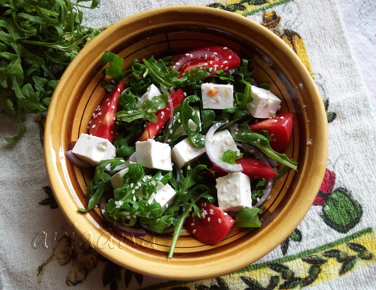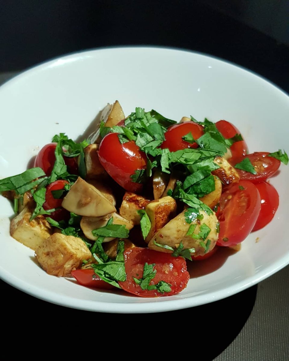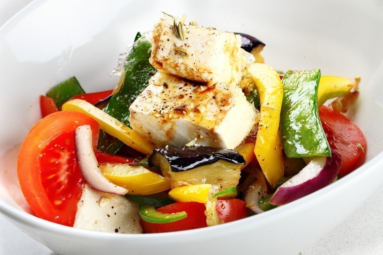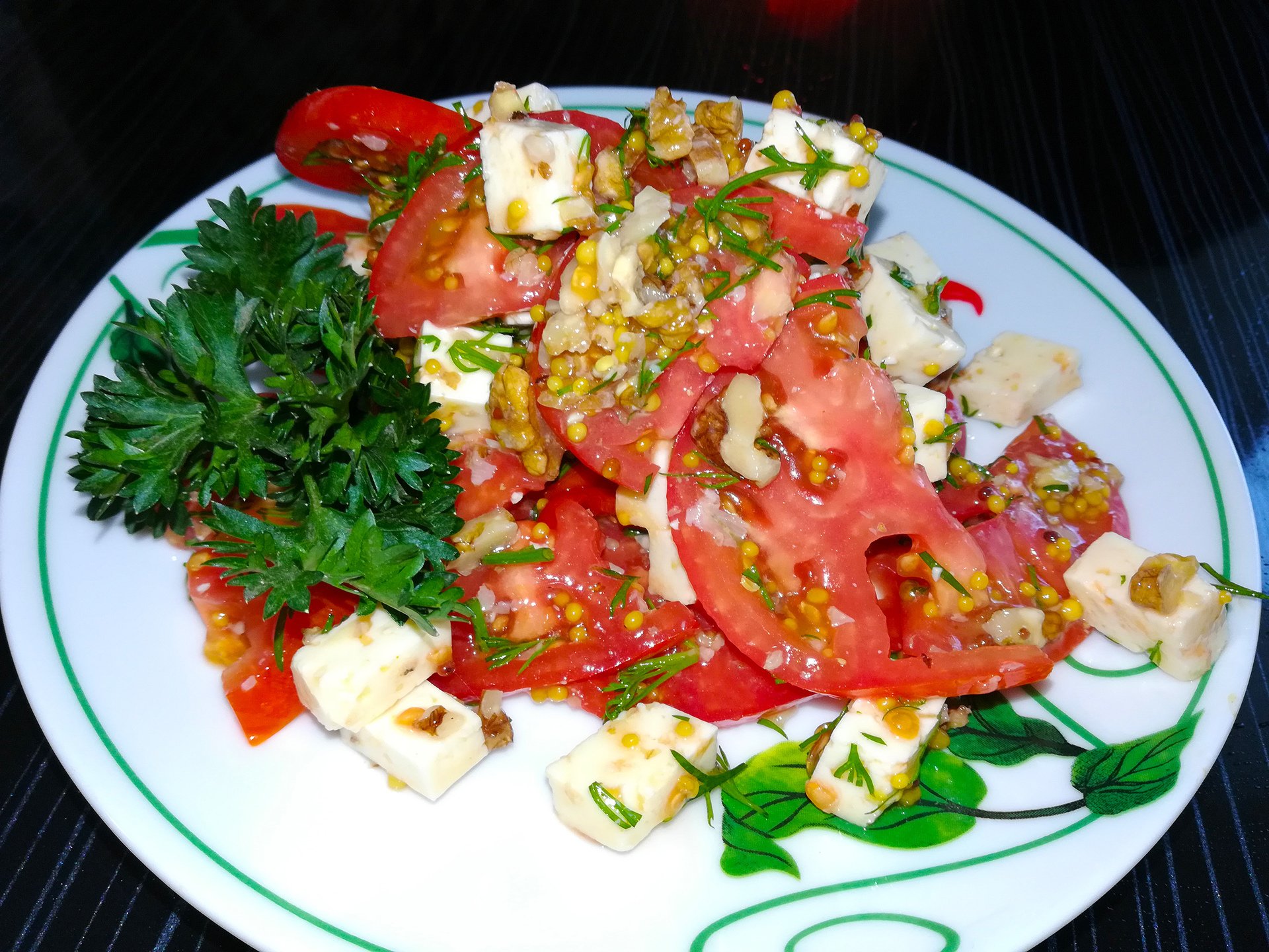 Салат с жареными баклажанами и помидорами, зеленью,брынзой