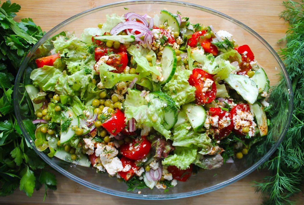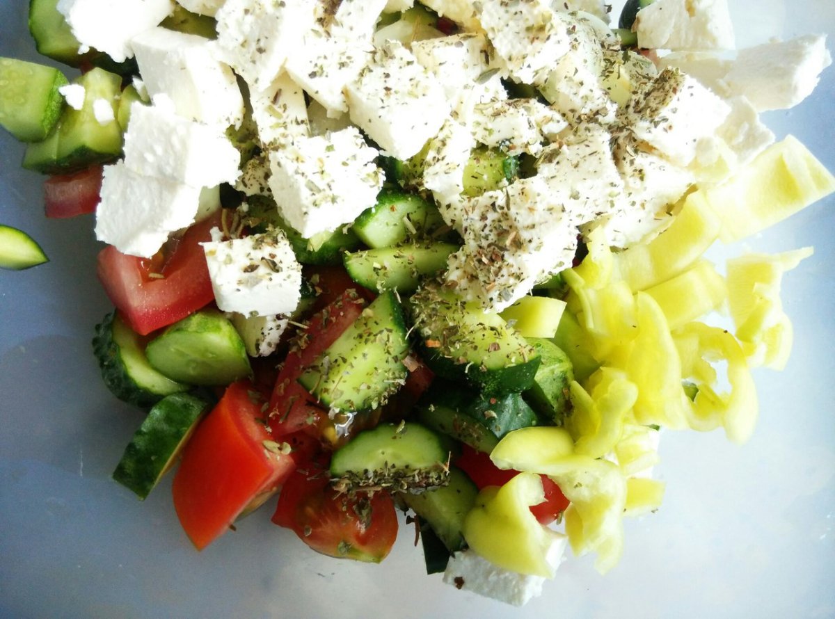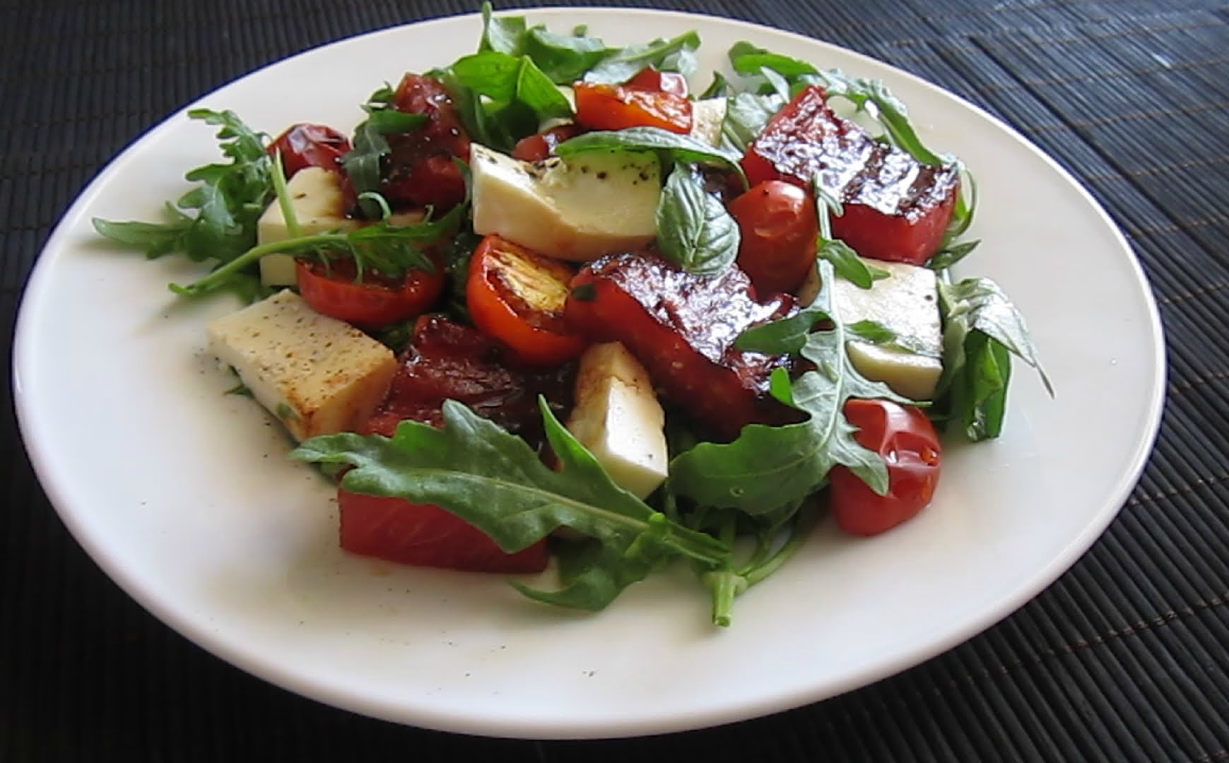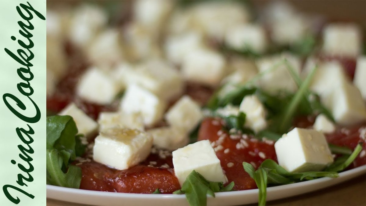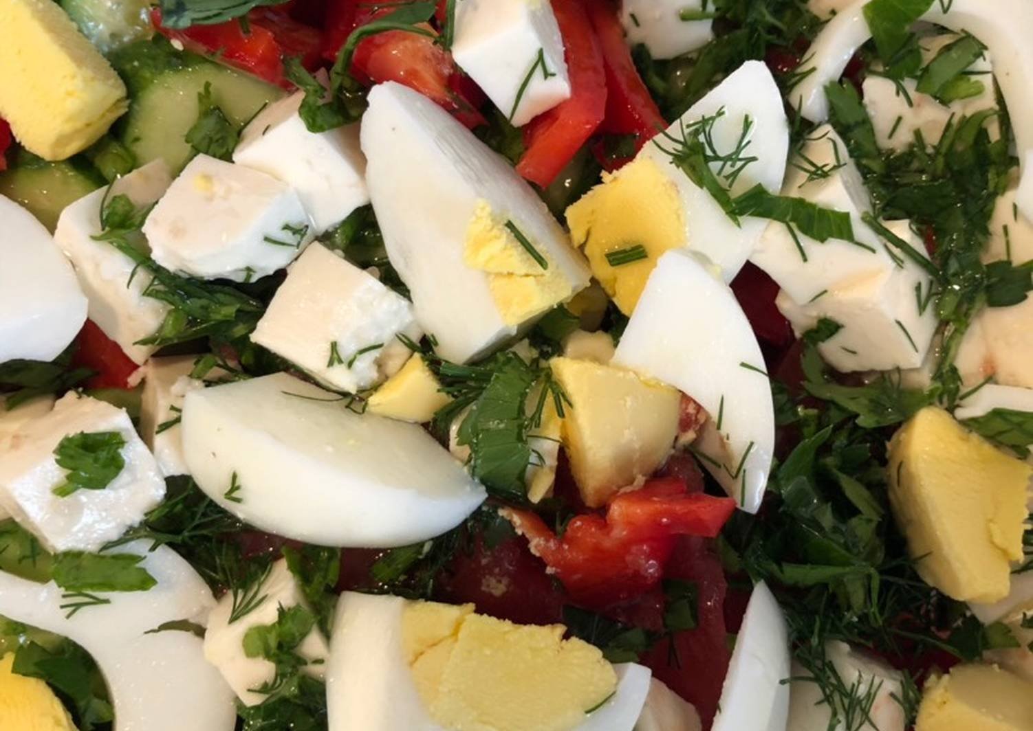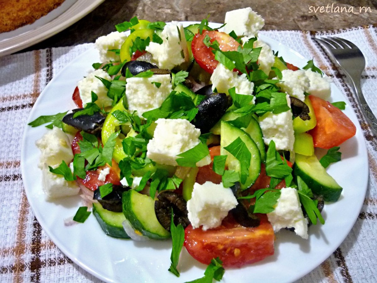 Салат с жареными баклажанами и помидорами, зеленью,брынзой