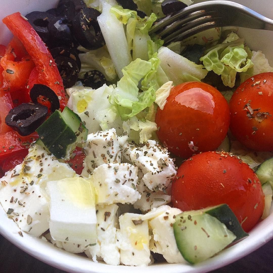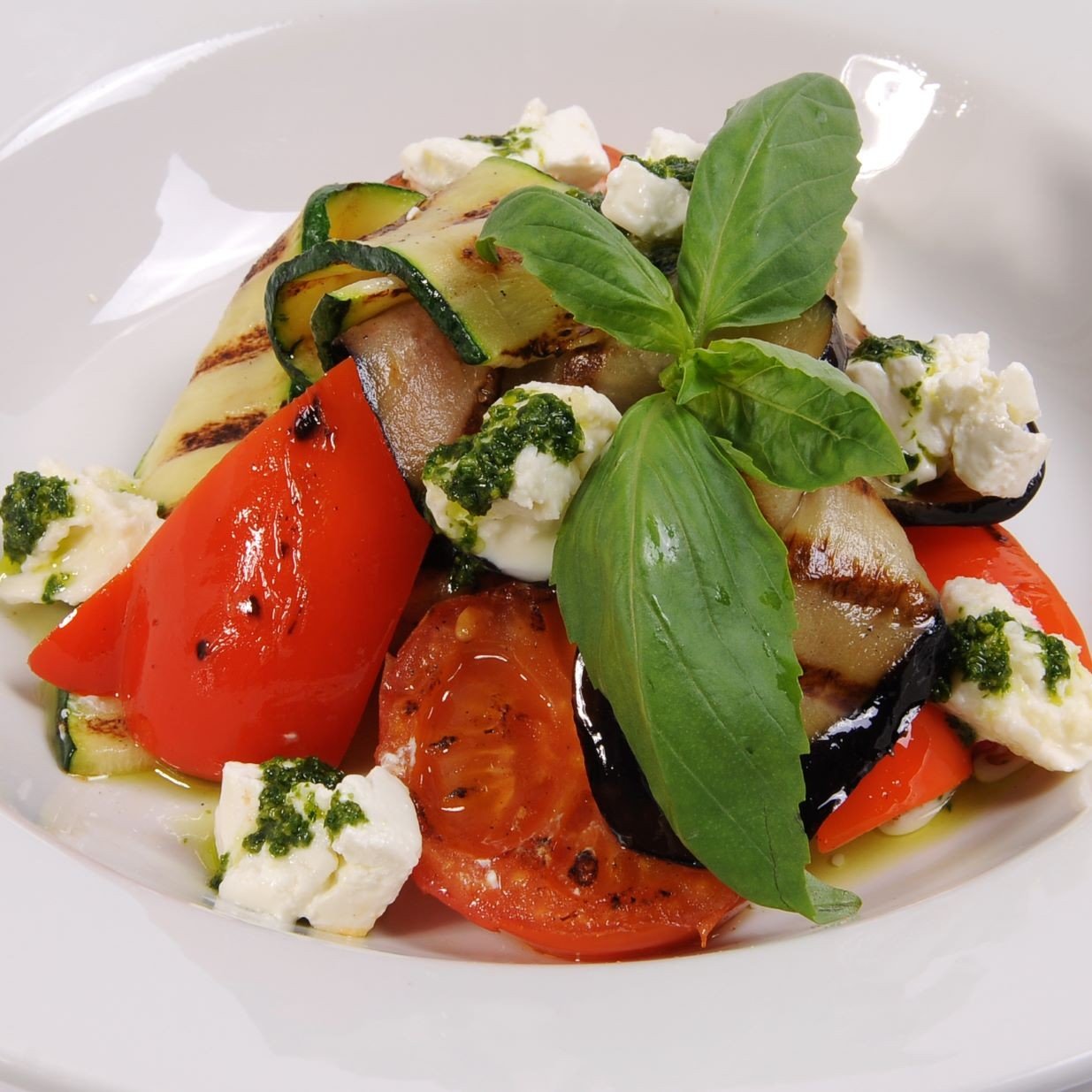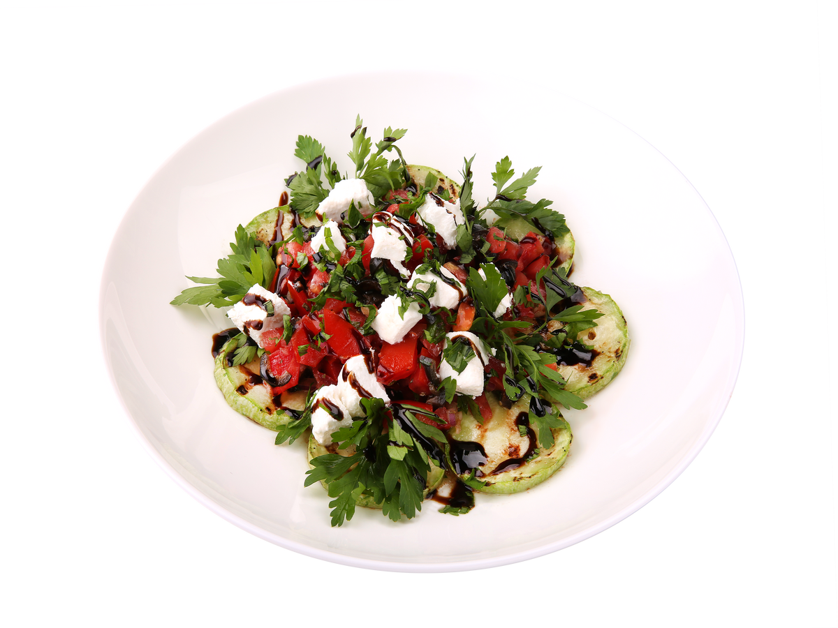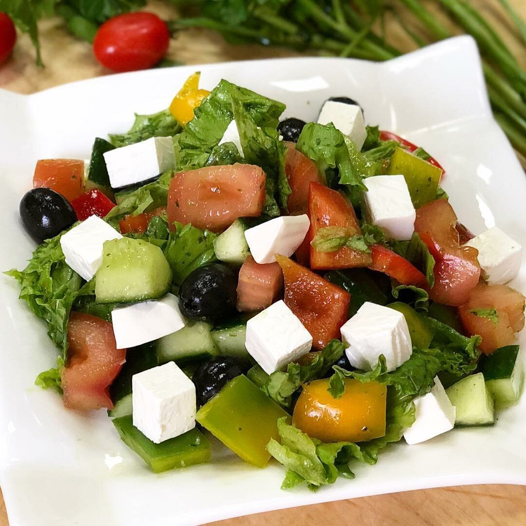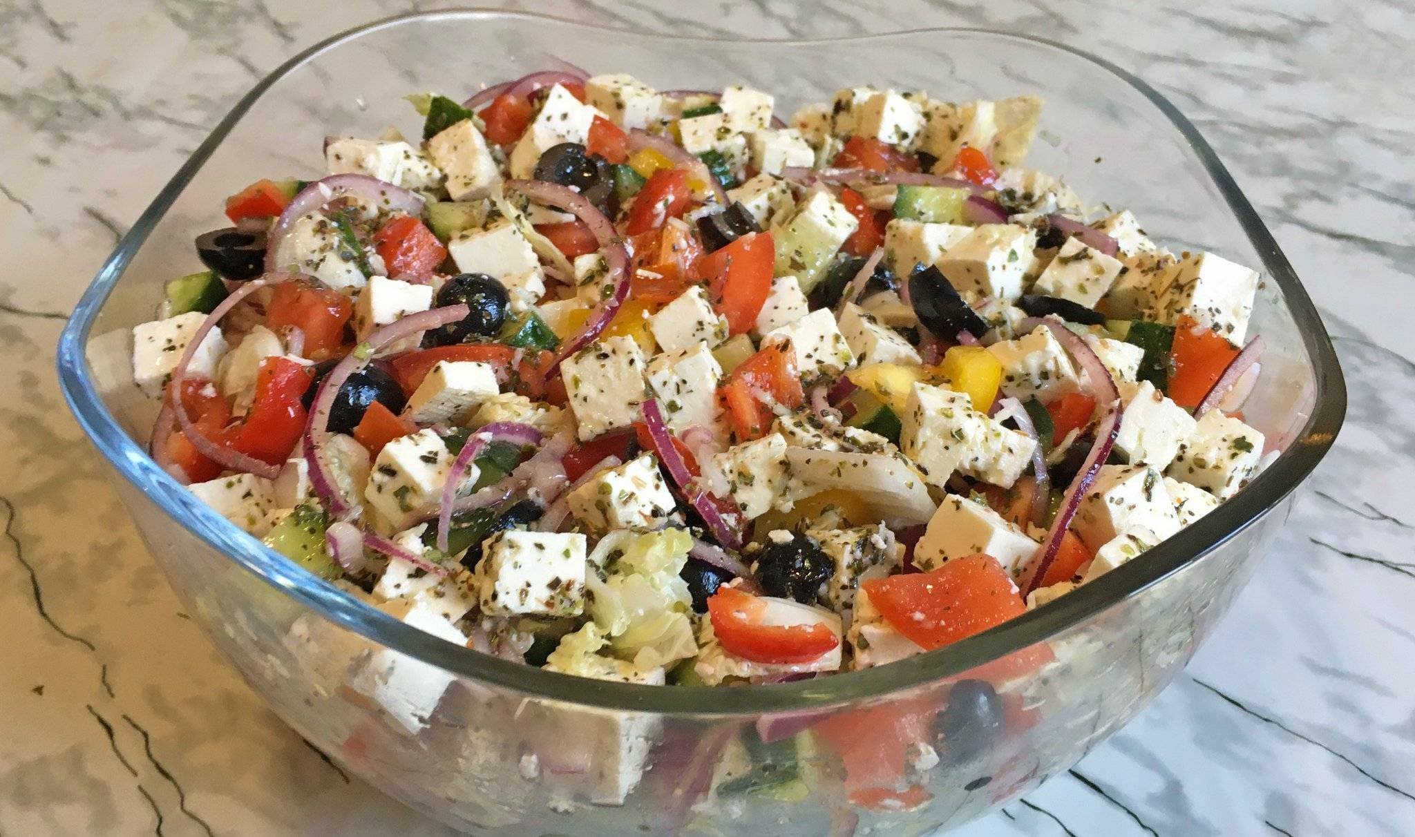 Салат с жареными баклажанами и помидорами, зеленью,брынзой