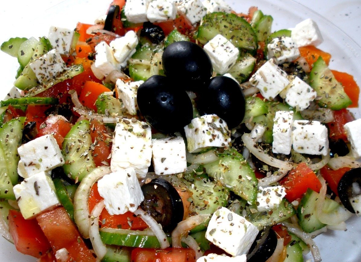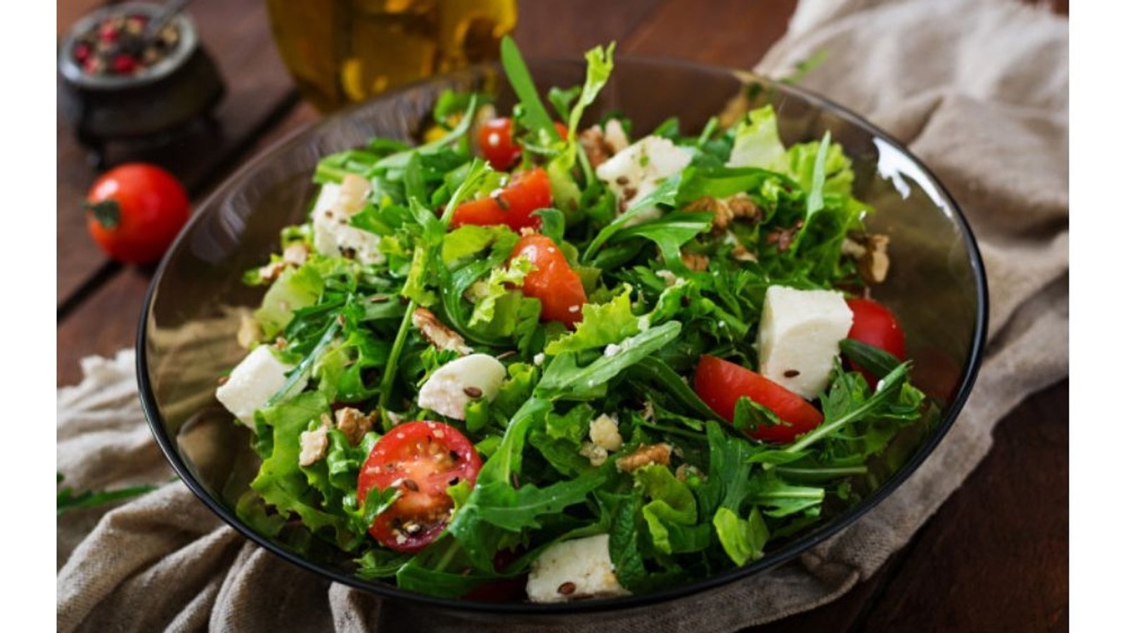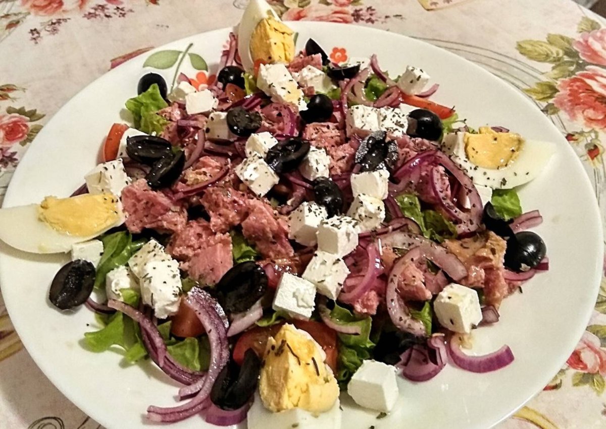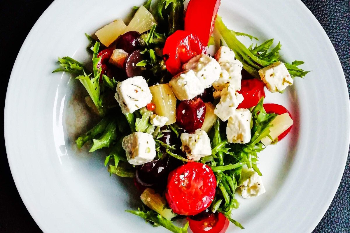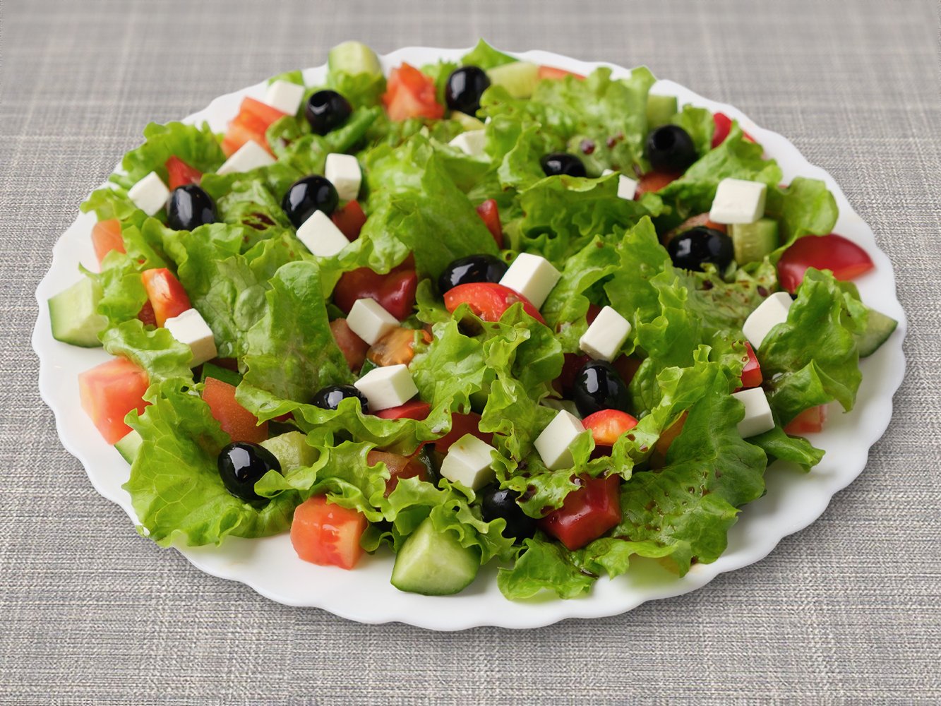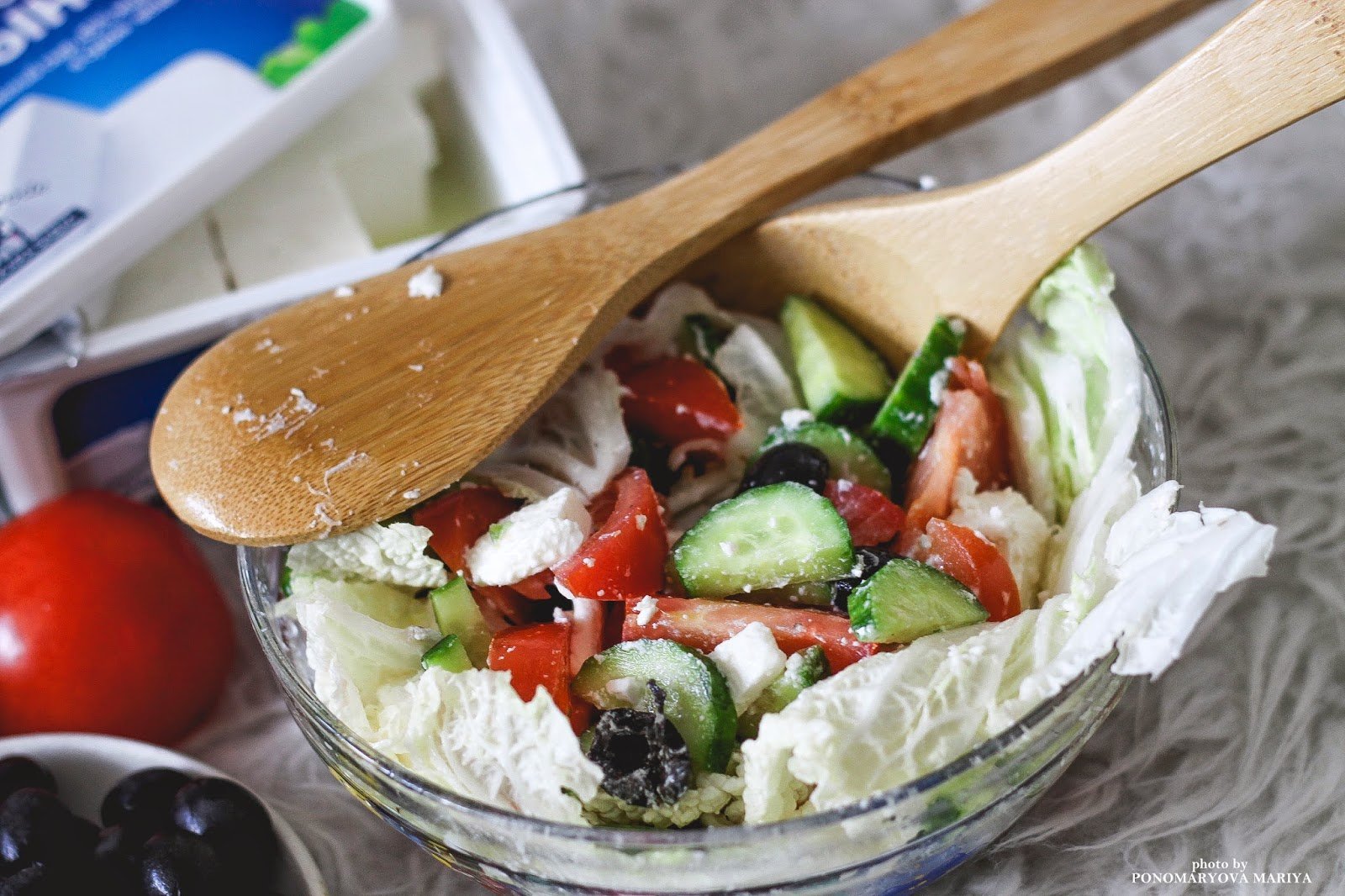 Салат с жареными баклажанами и помидорами, зеленью,брынзой
