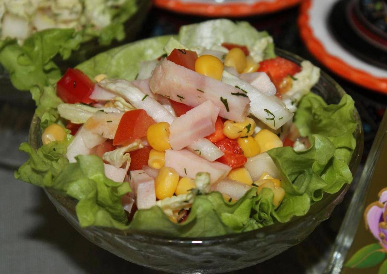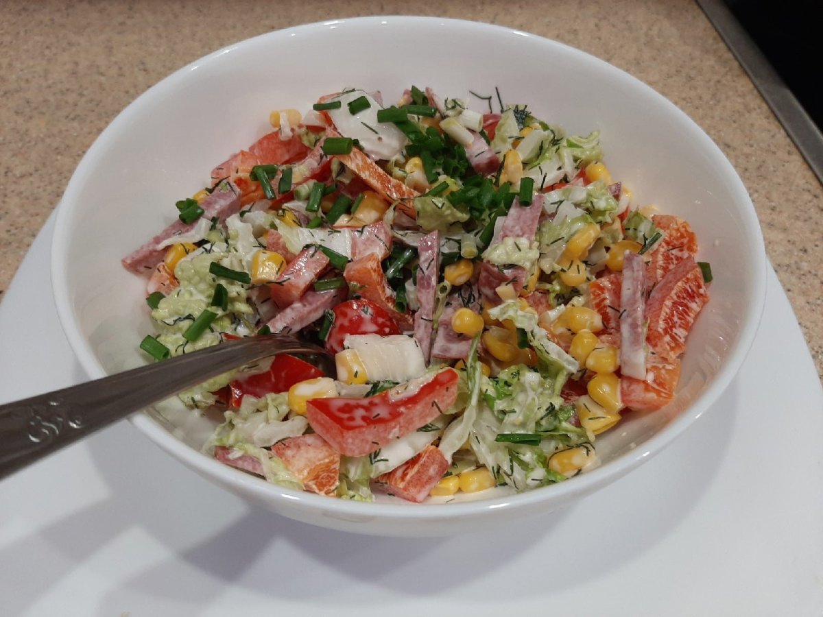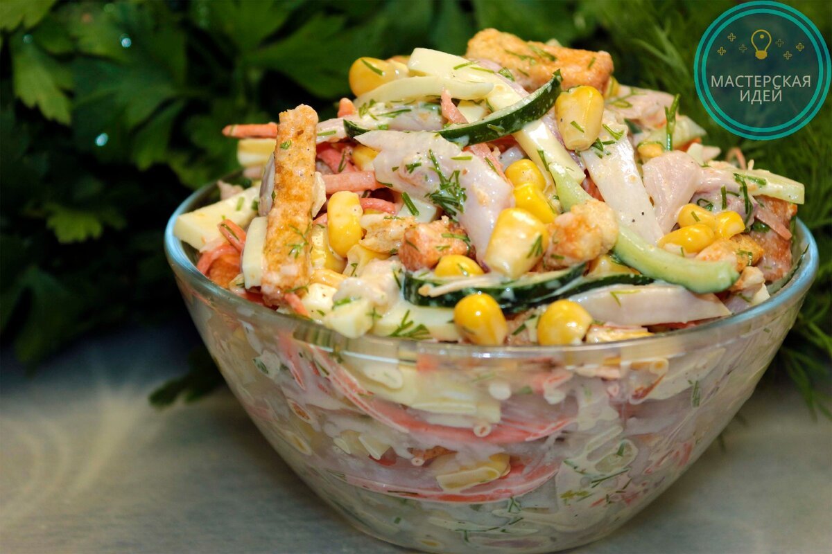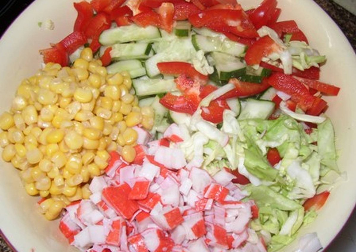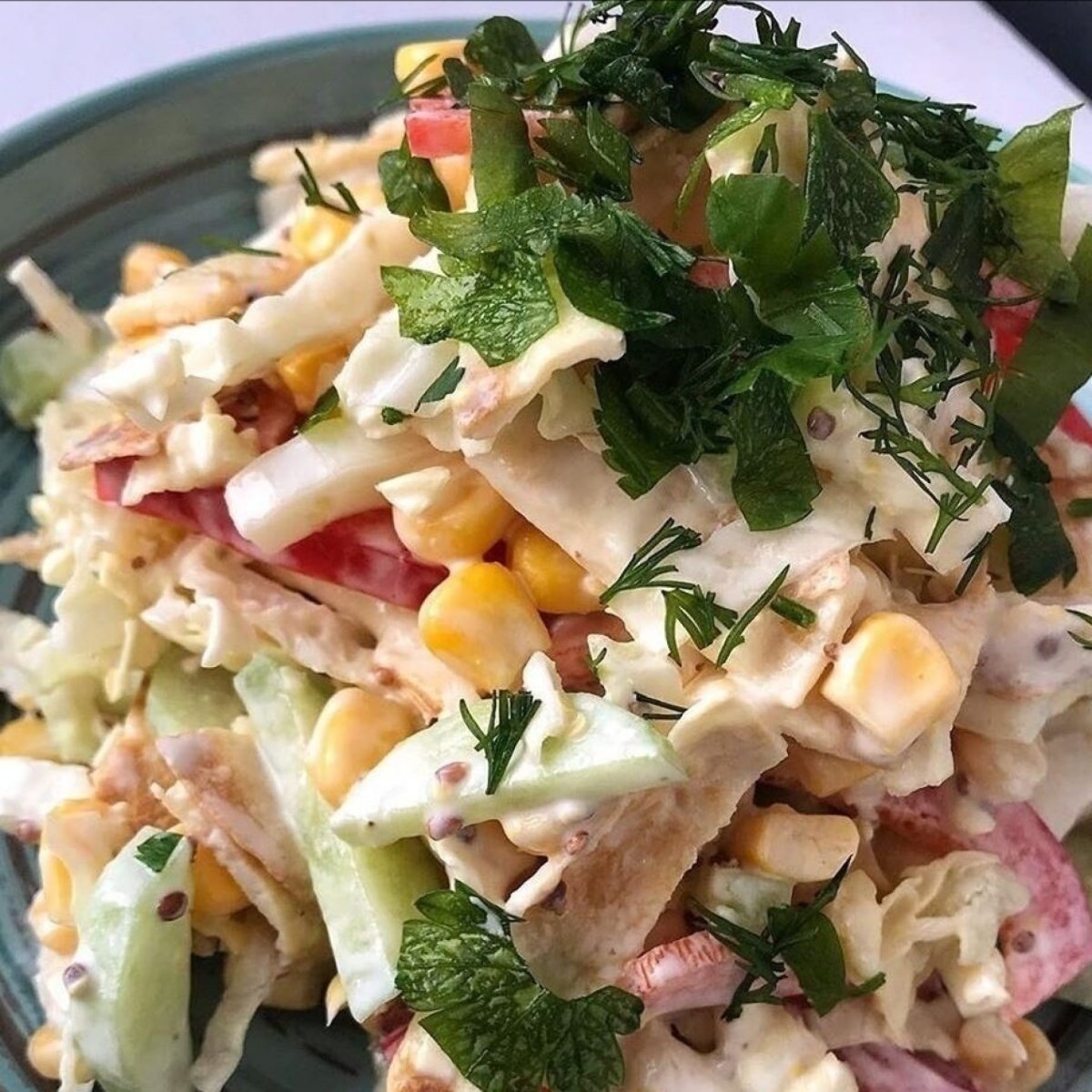 Салат с крабовыми палочками и кукурузой и капустой и огурцом