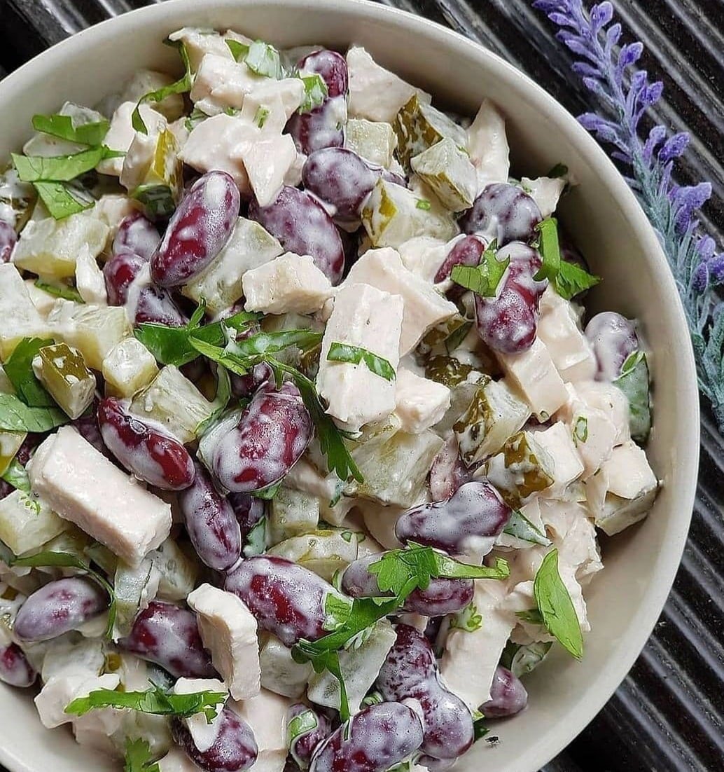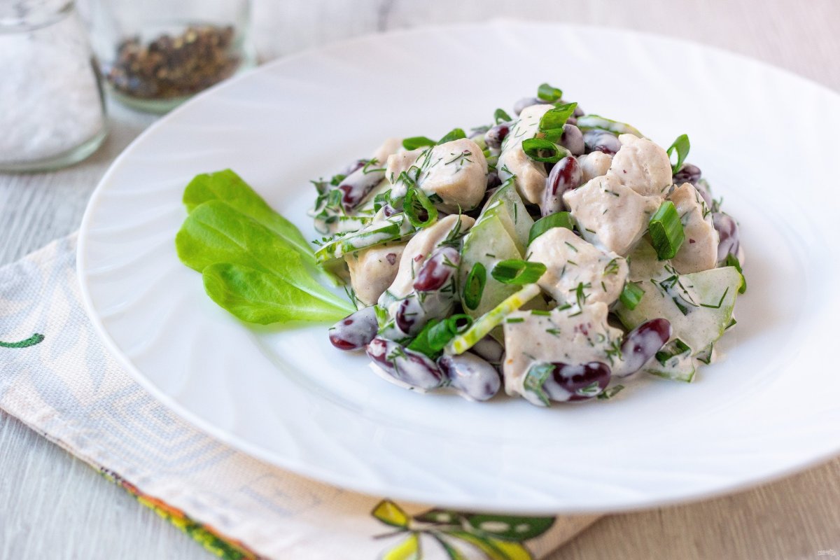 Салат с фасолью и курицей и огурцом