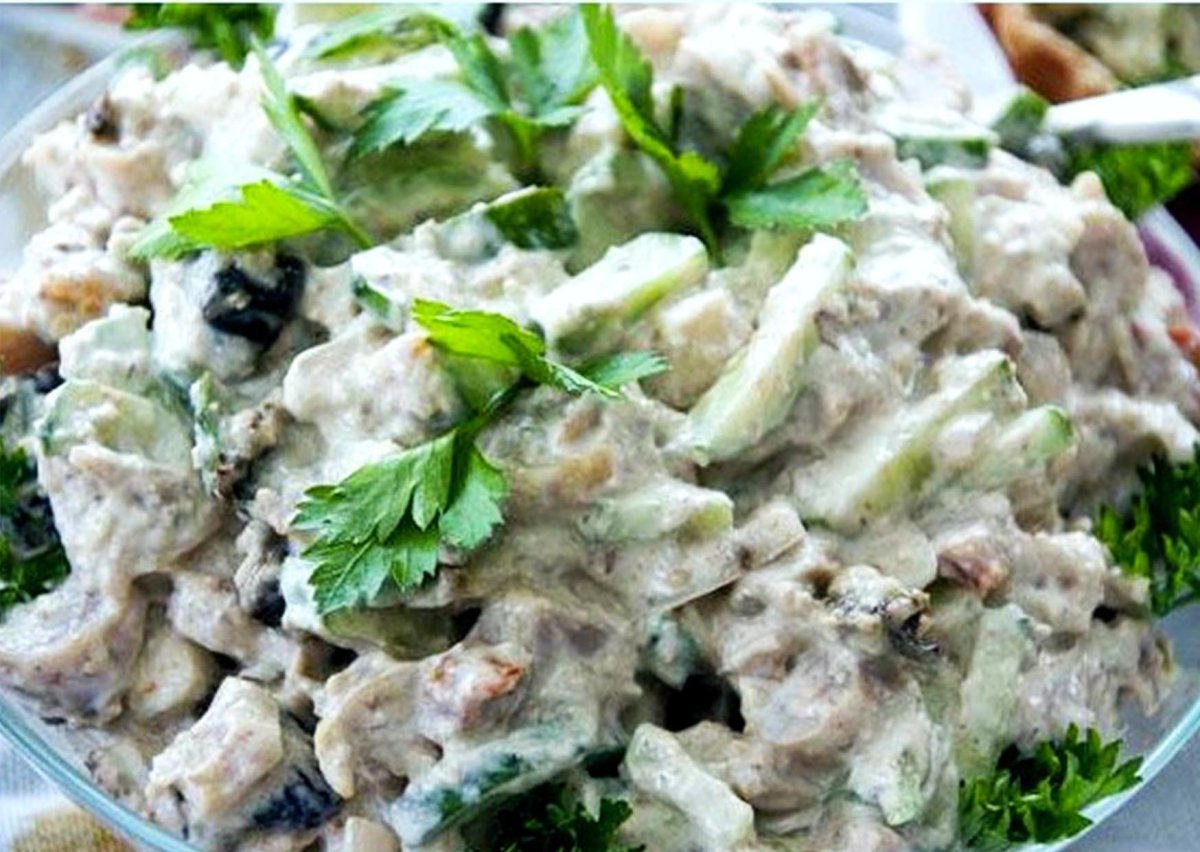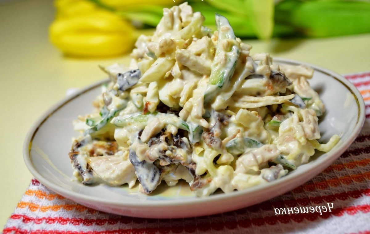 Салат с черносливом и куриной грудкой и свежим огурцом