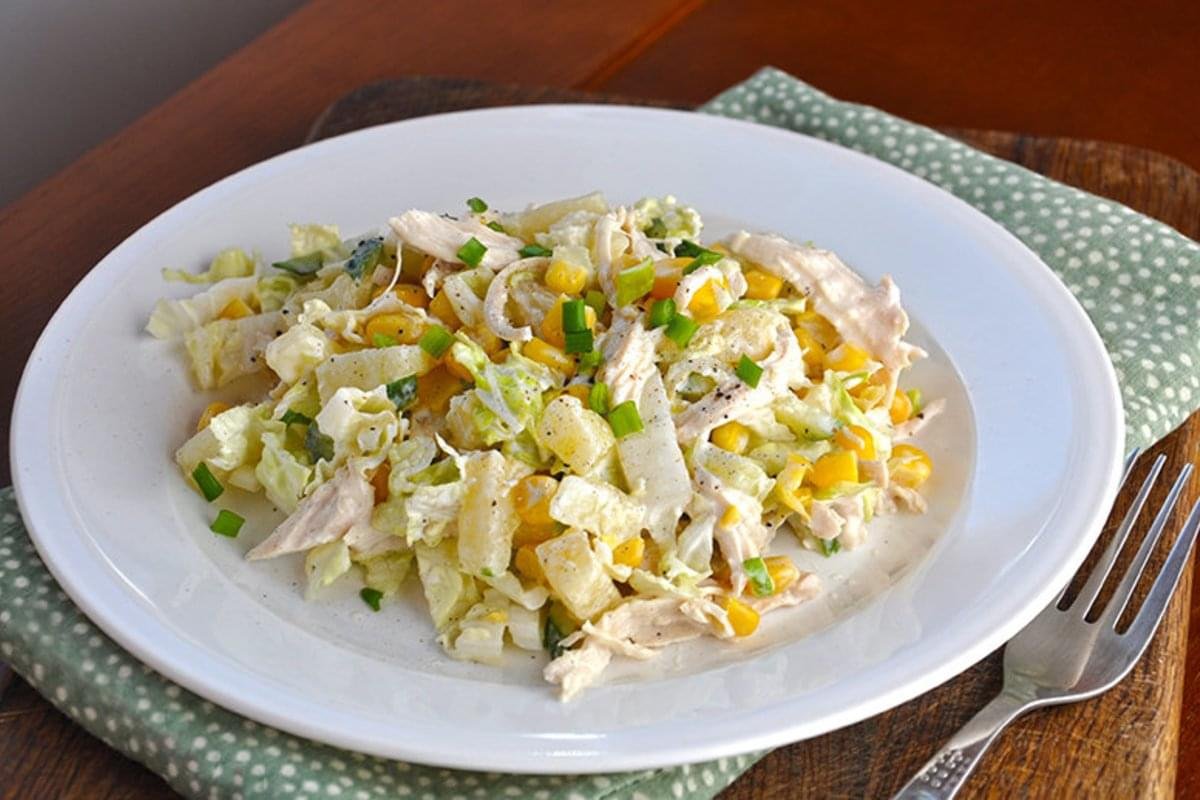 Салат из пекинской капусты с ананасом и курицей и кукурузой