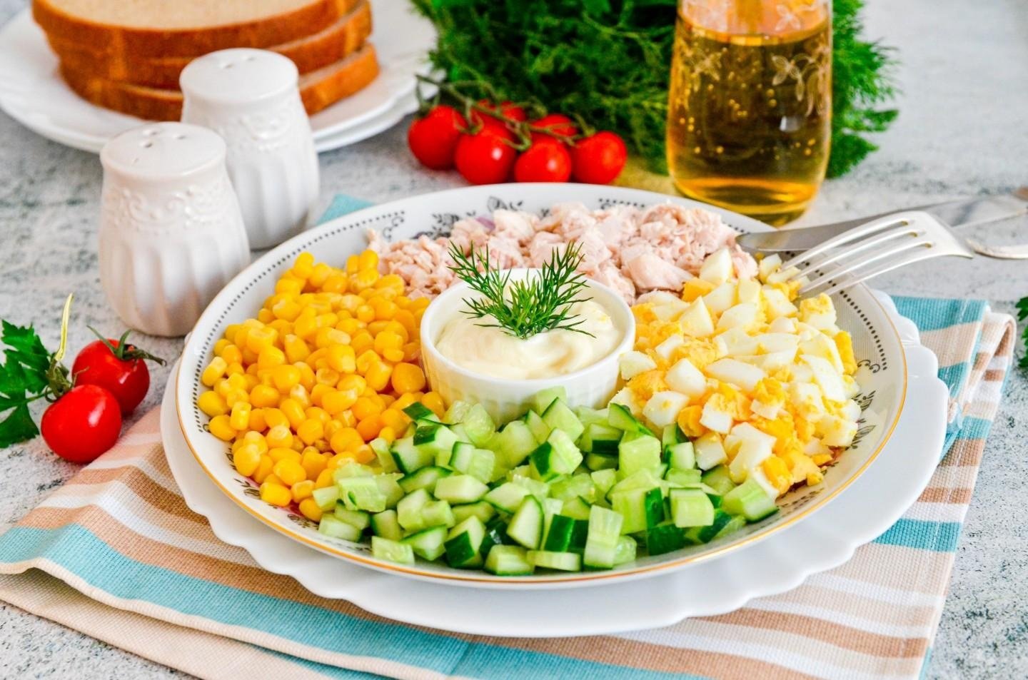 Салат с курицей и кукурузой и огурцом