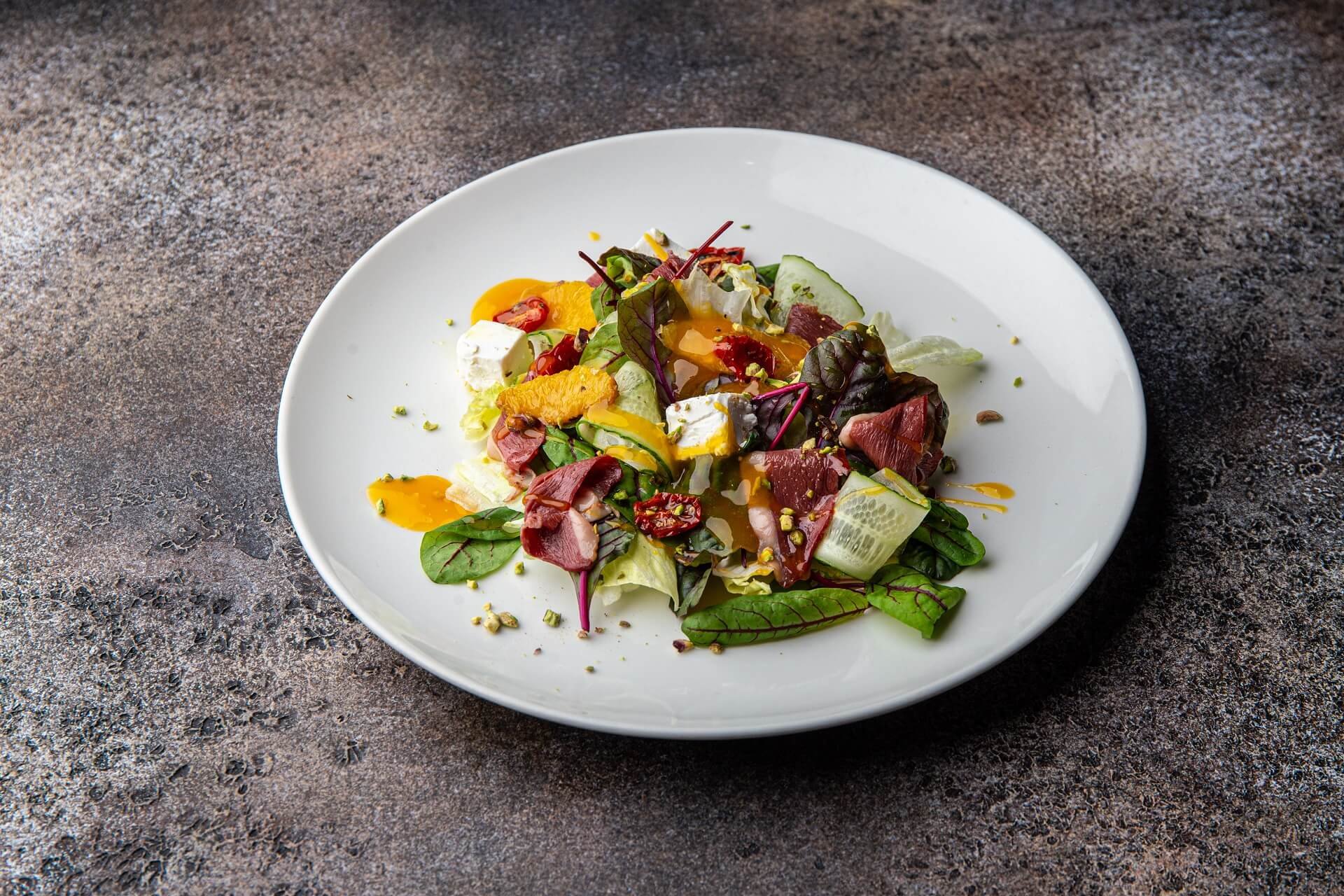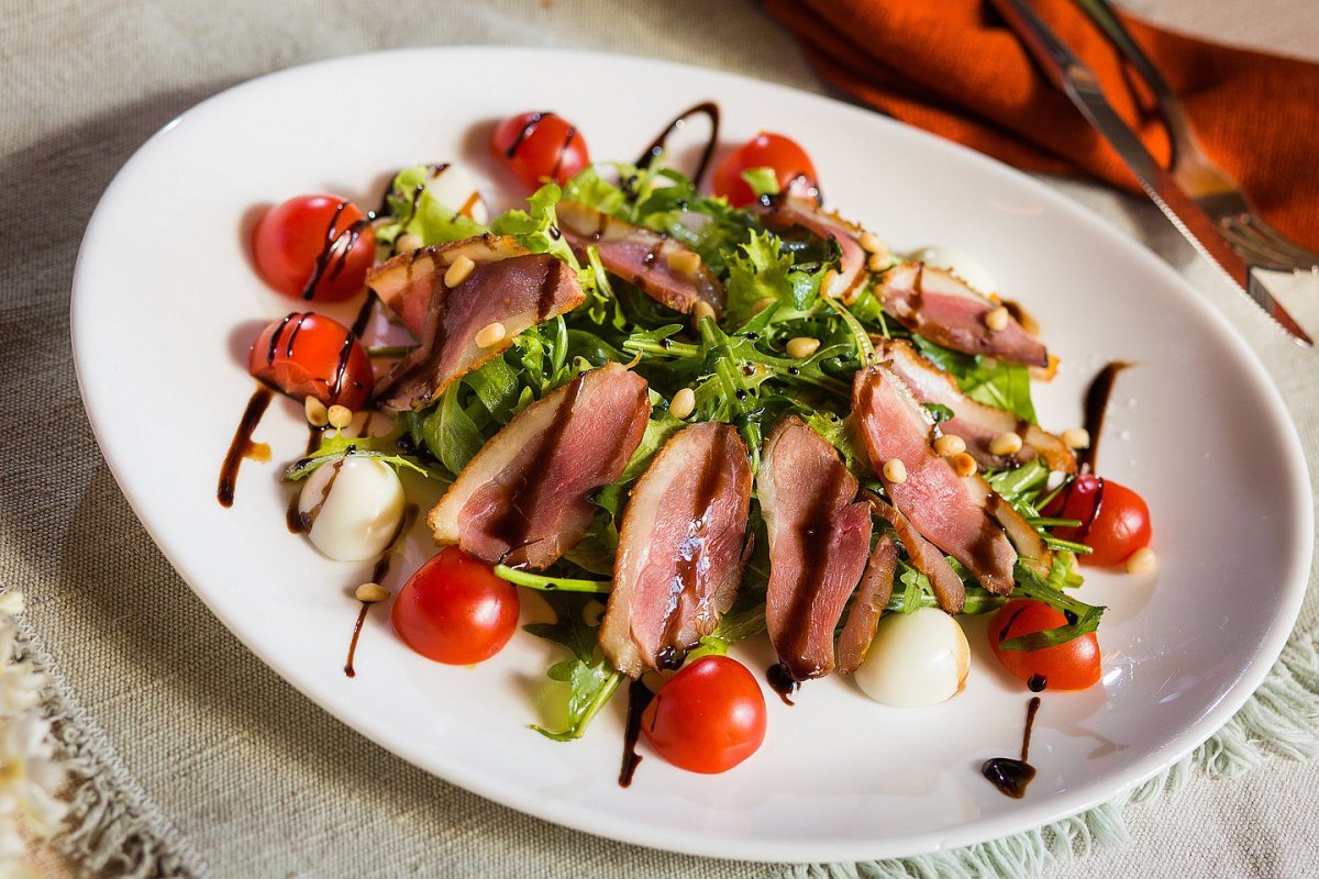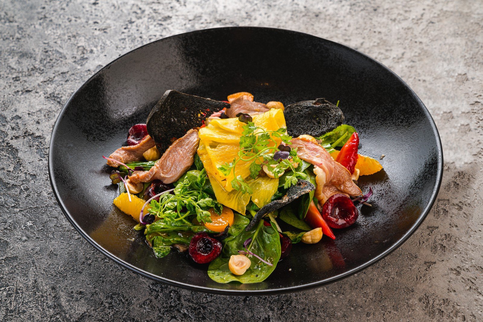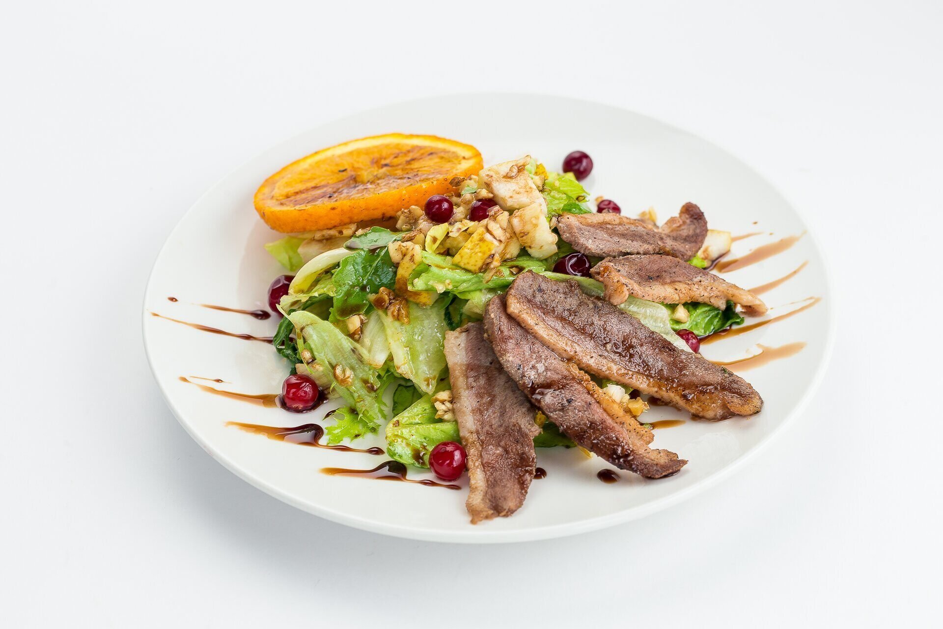 Тёплый салат с утиной грудкой и вишнёвым конфи