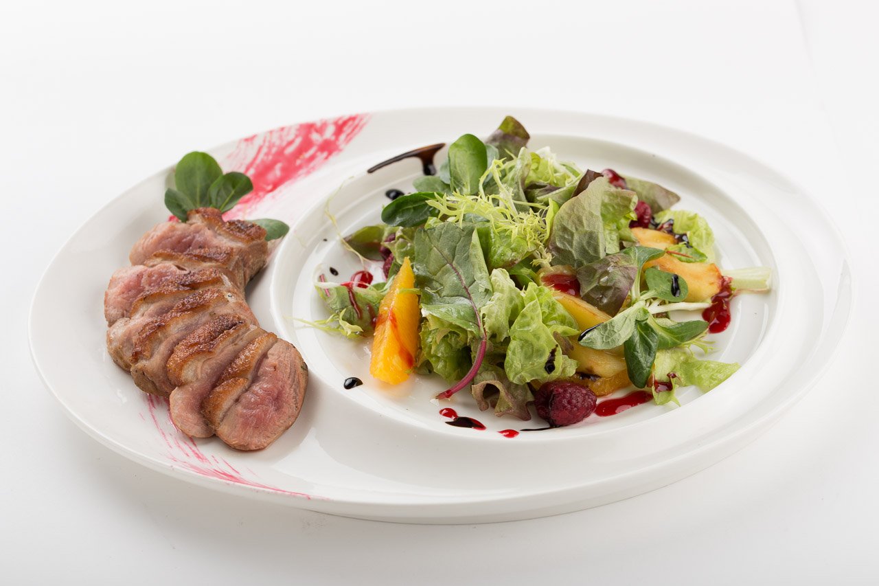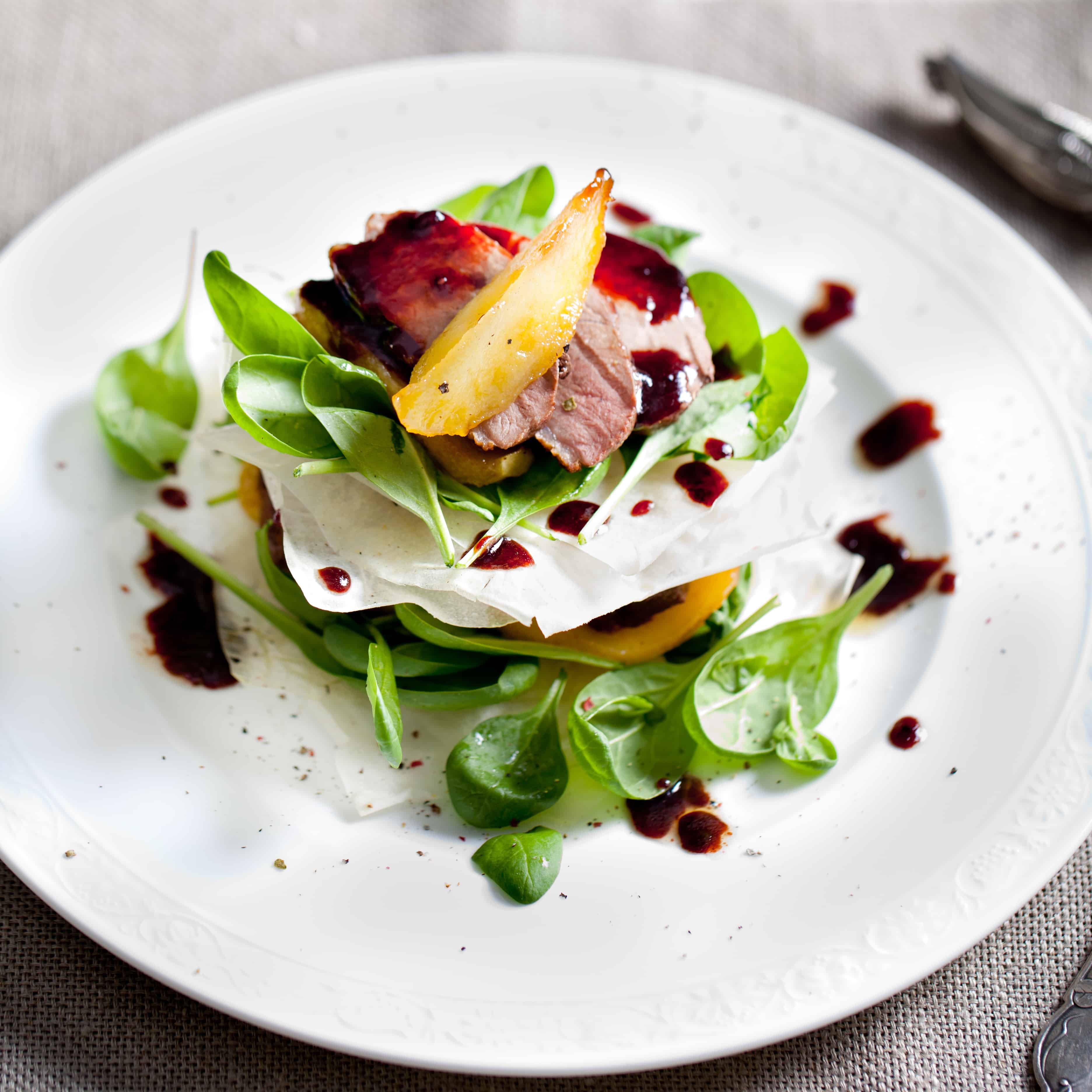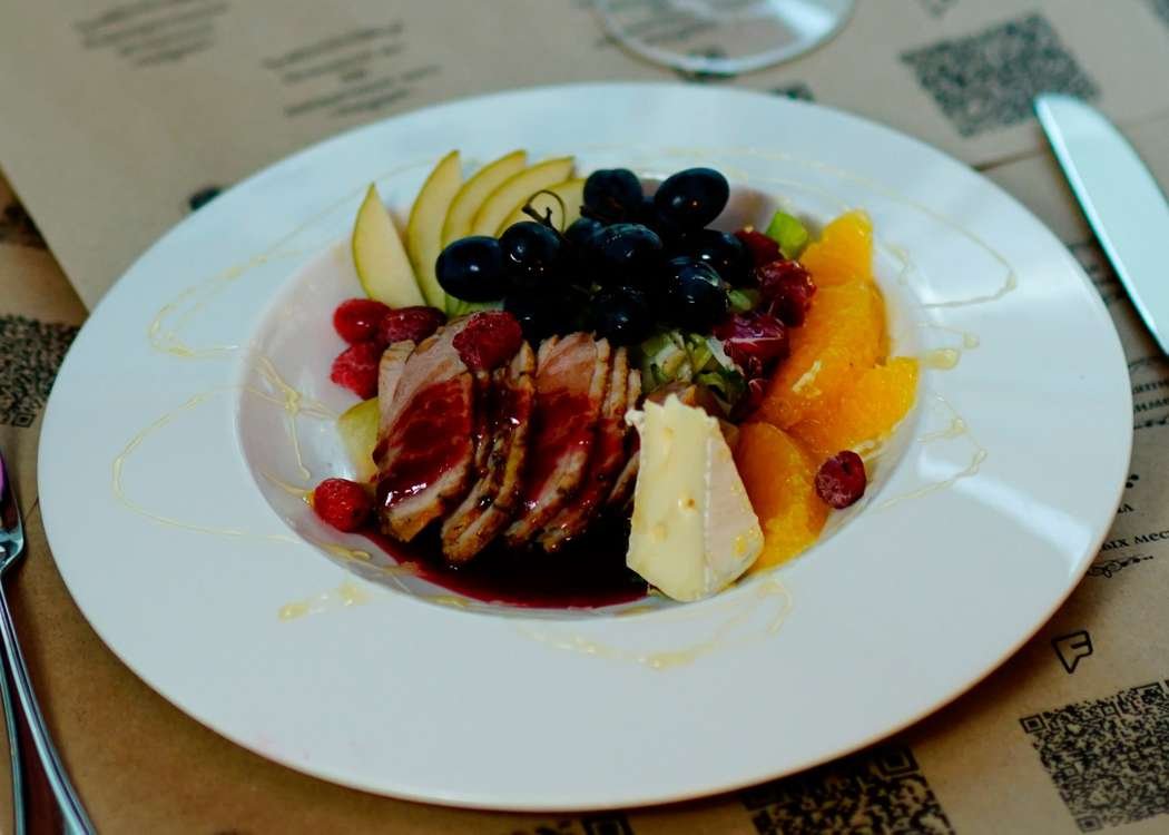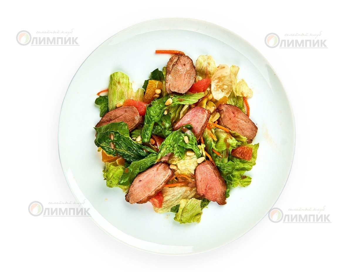 Тёплый салат с утиной грудкой и вишнёвым конфи