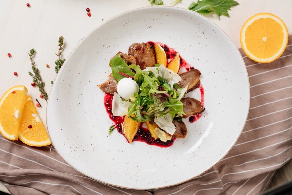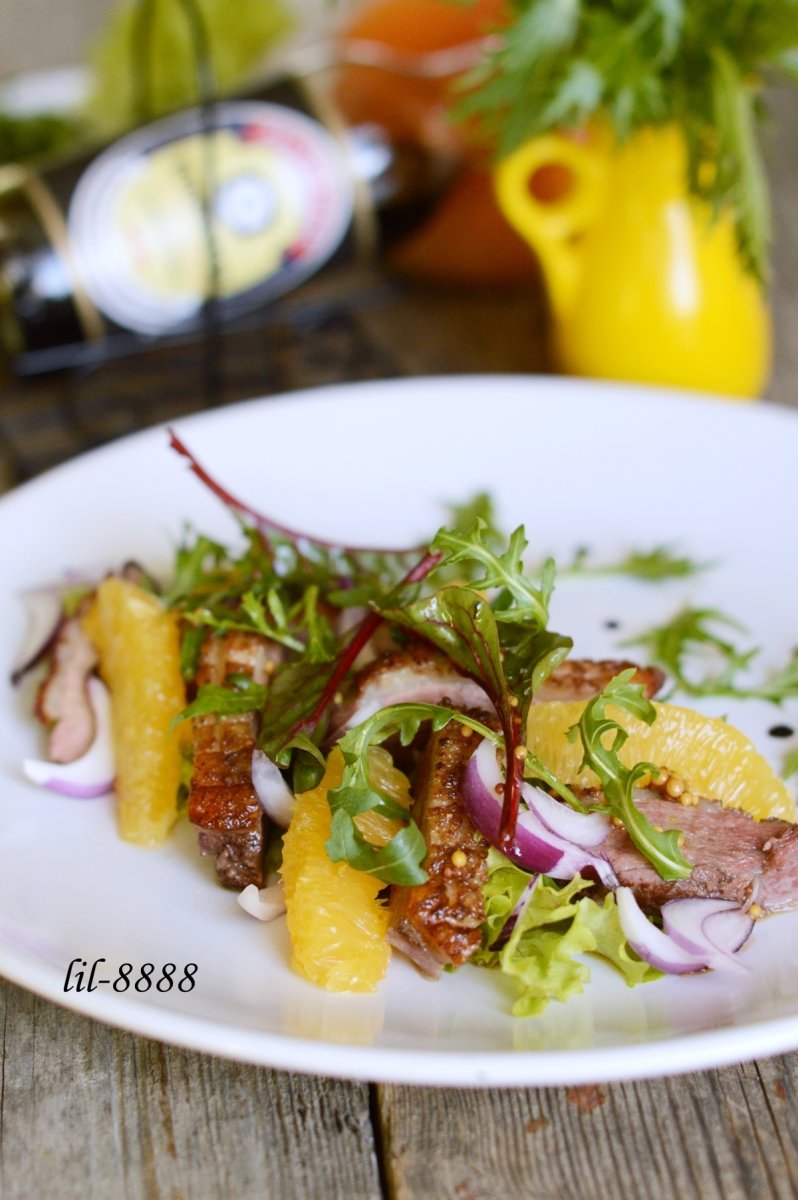 Тёплый салат с утиной грудкой картошкой и апельсинами