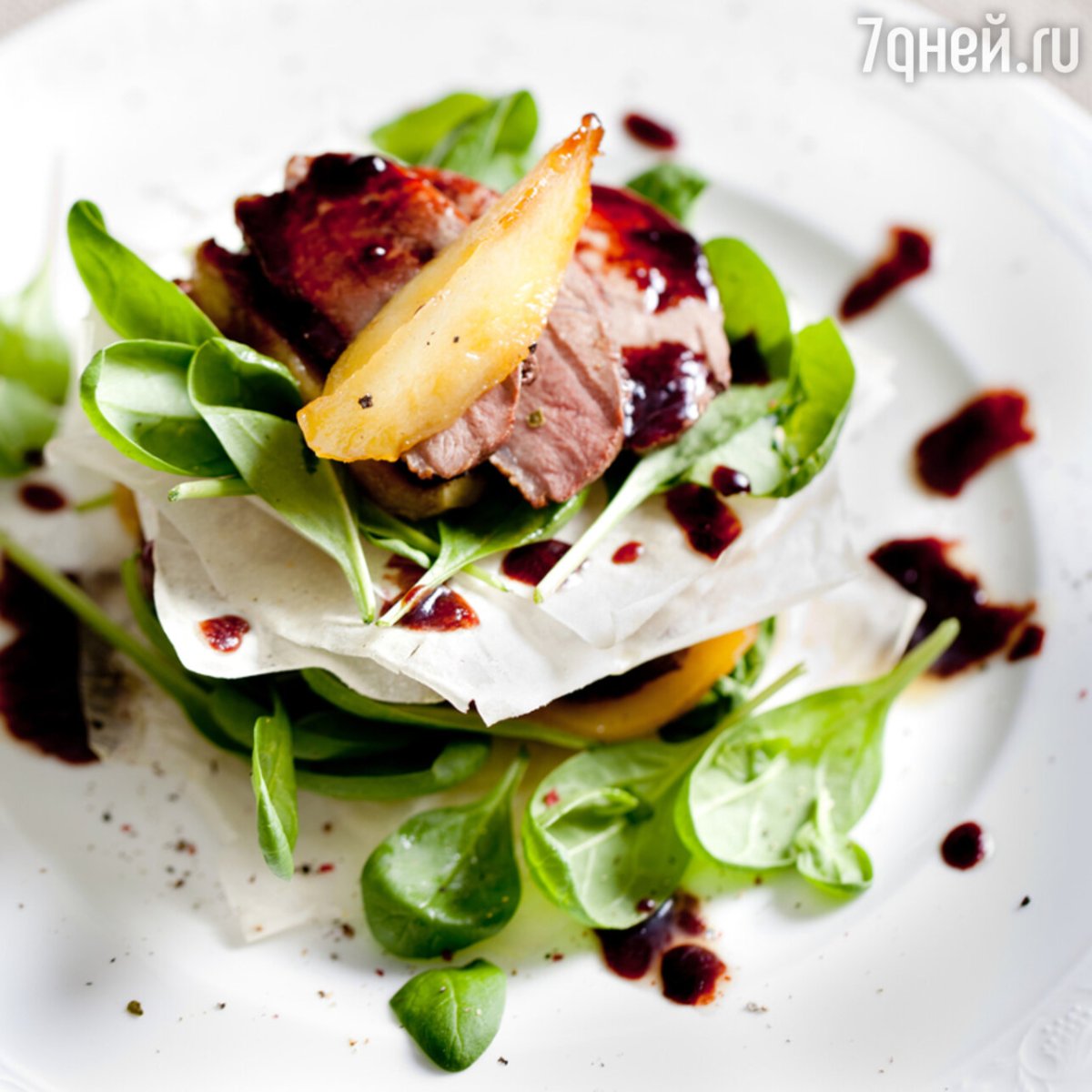 Салат с копчёной уткой и свежей грушей с соусом терияки