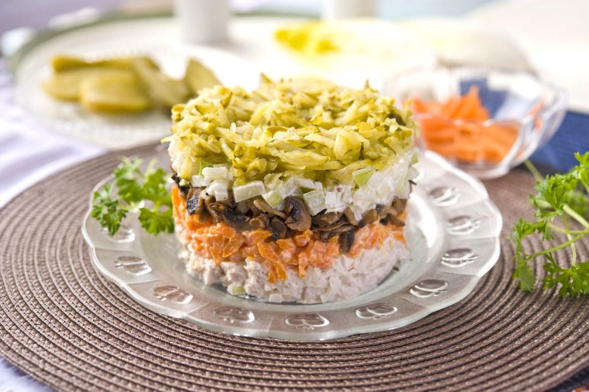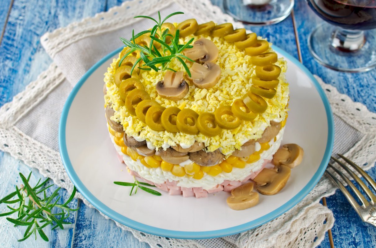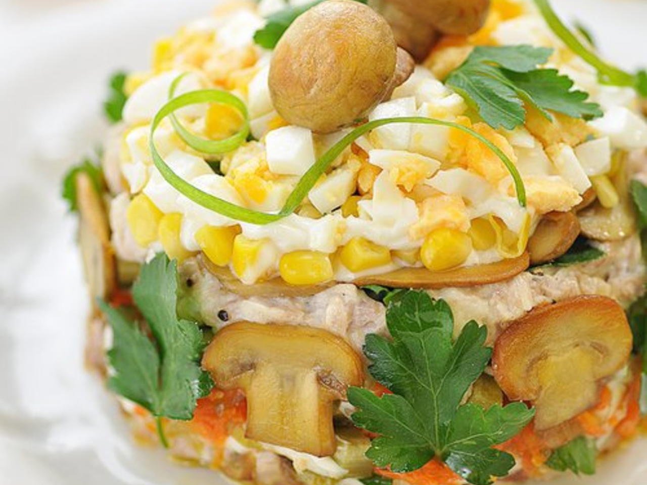 Салат с шампиньонами и крабовыми палочками и кукурузой