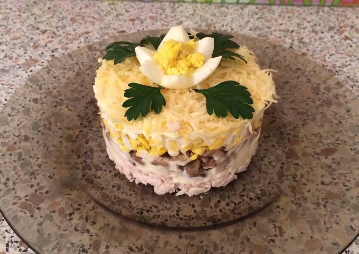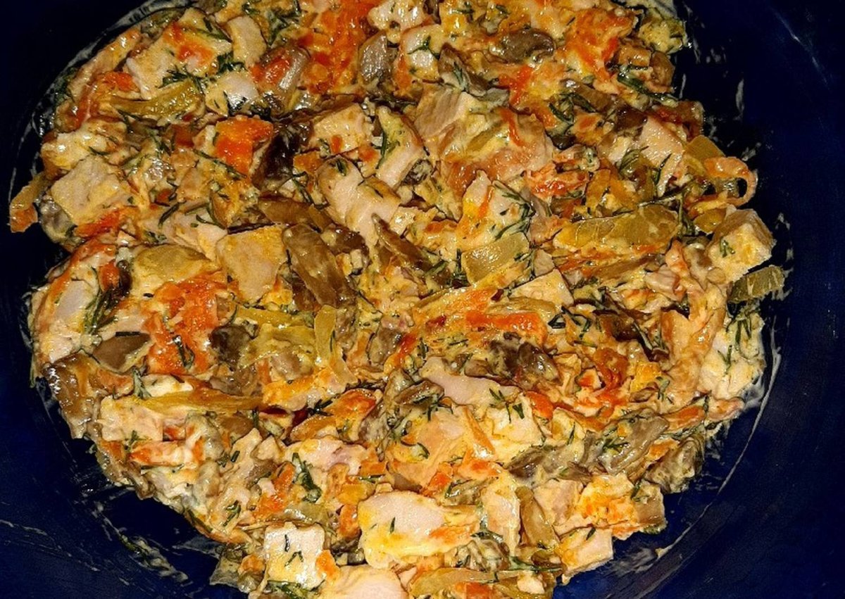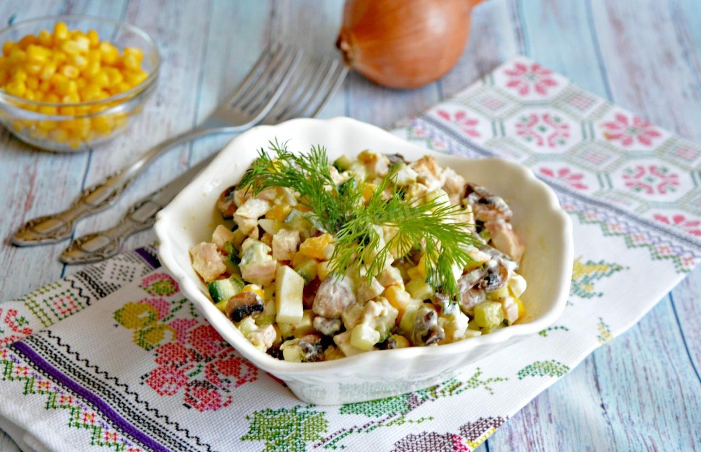 Салат с копчёной курицей и грибами шампиньонами жареными