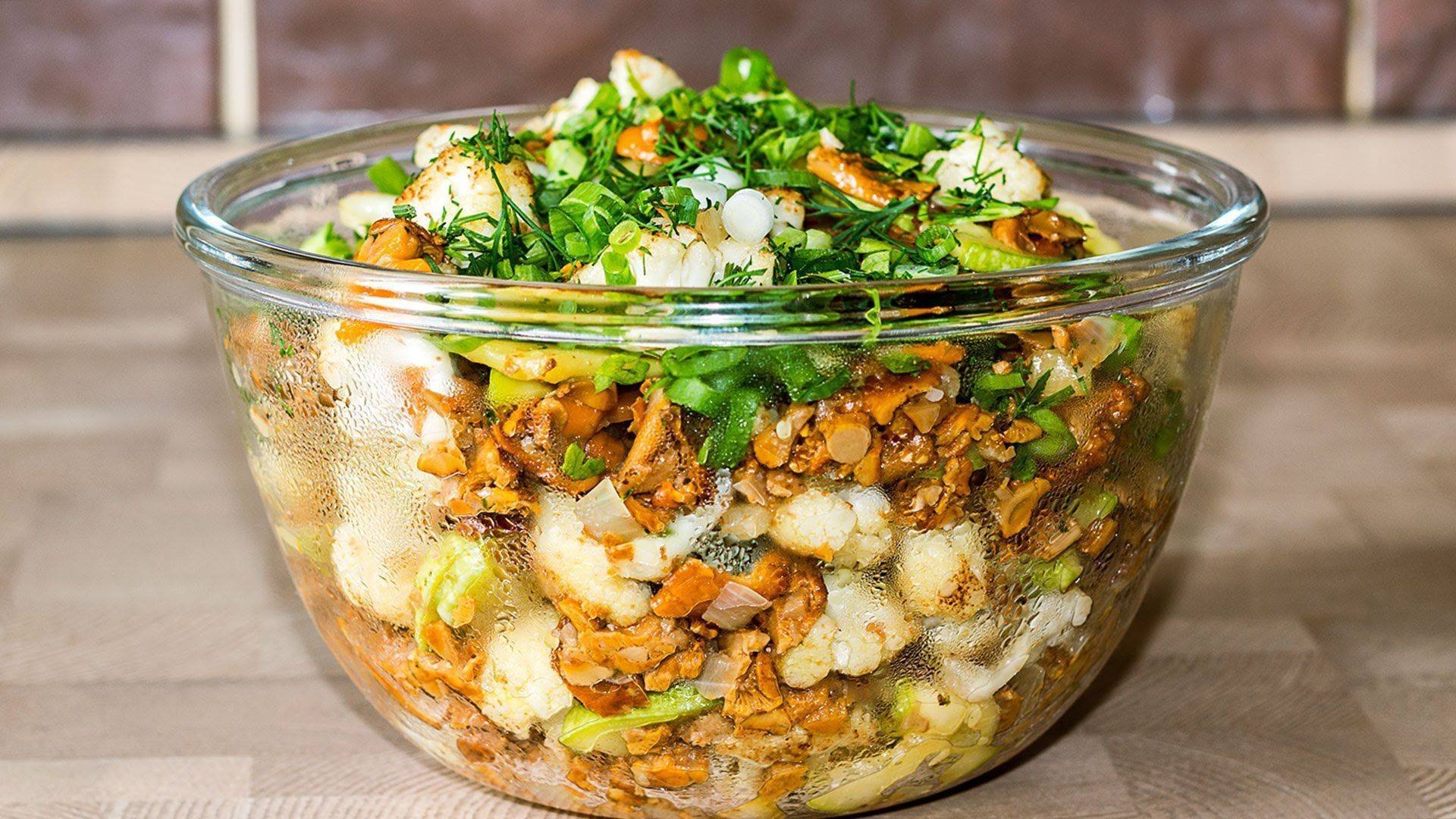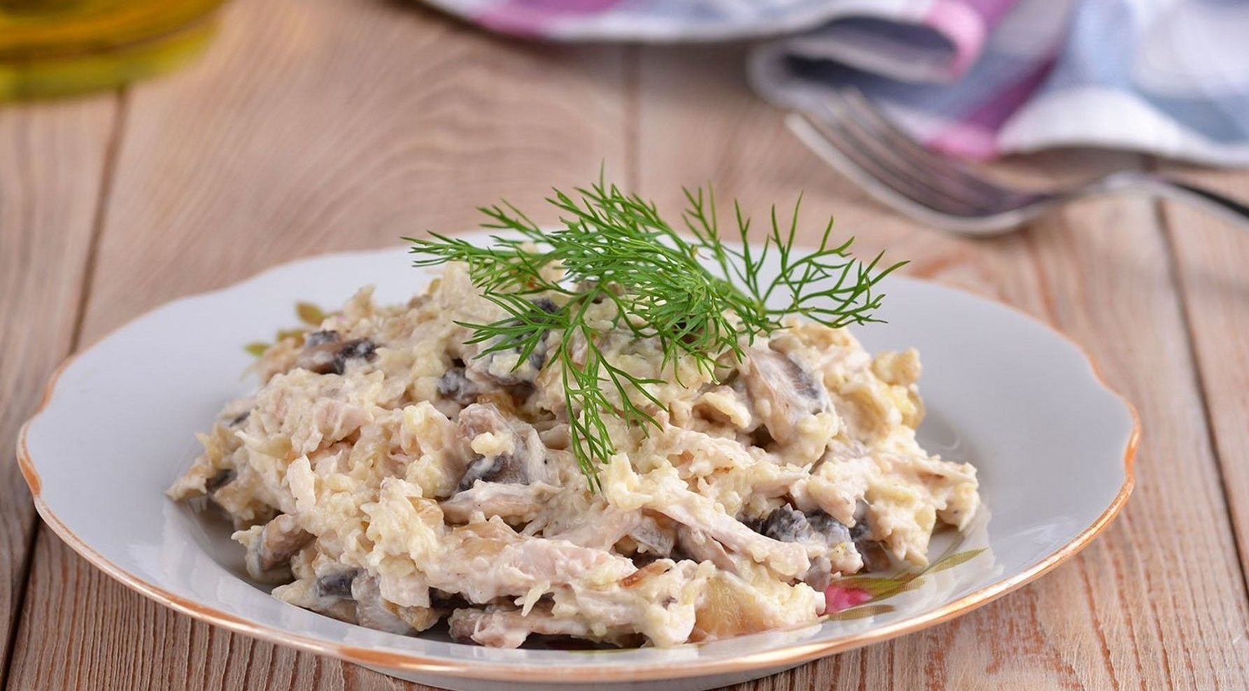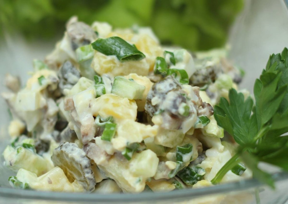 Салат с копчёной курицей и грибами шампиньонами жареными