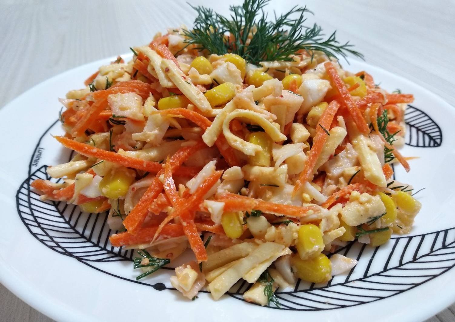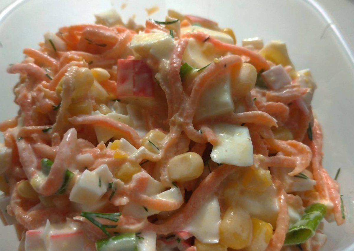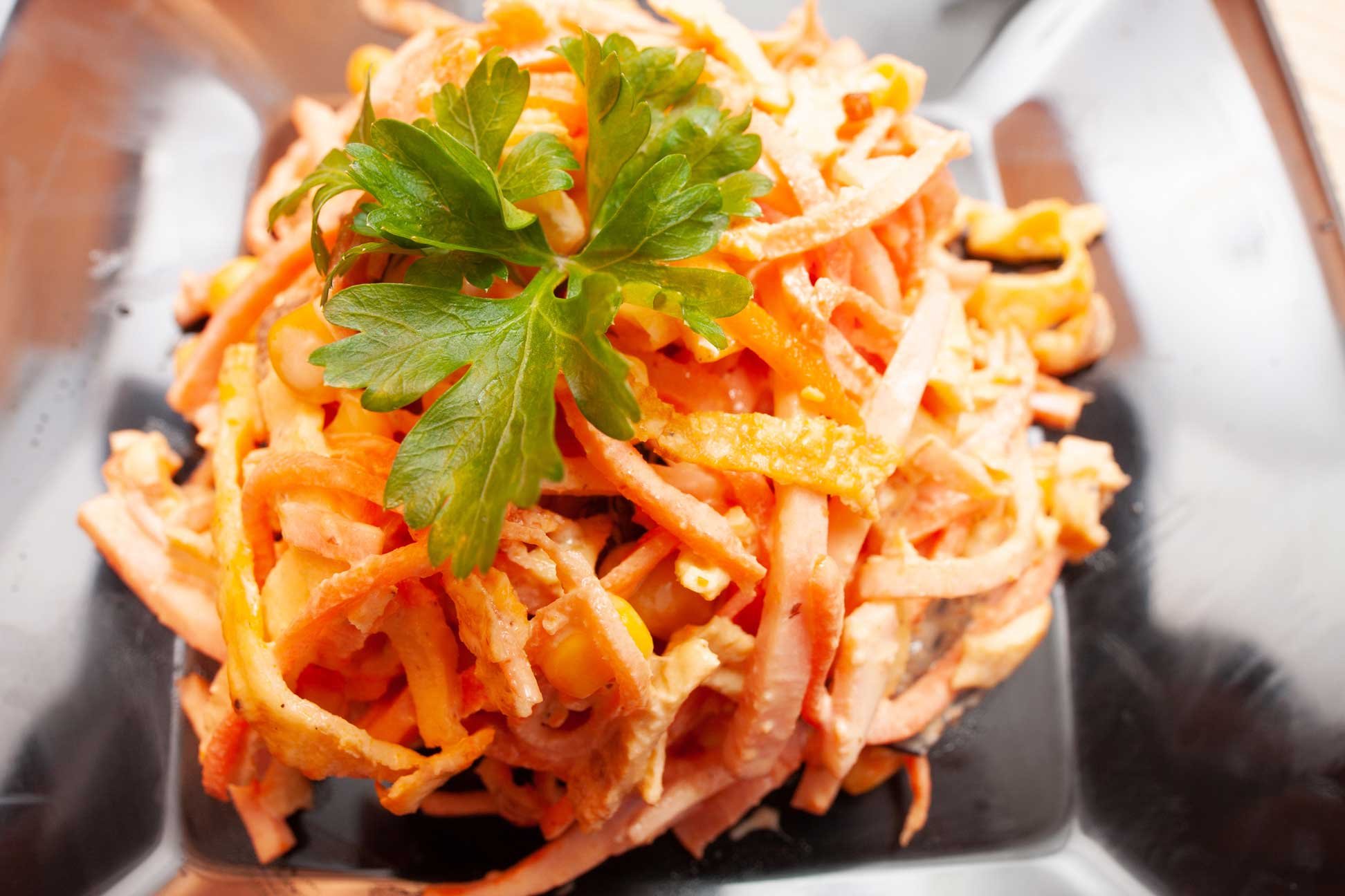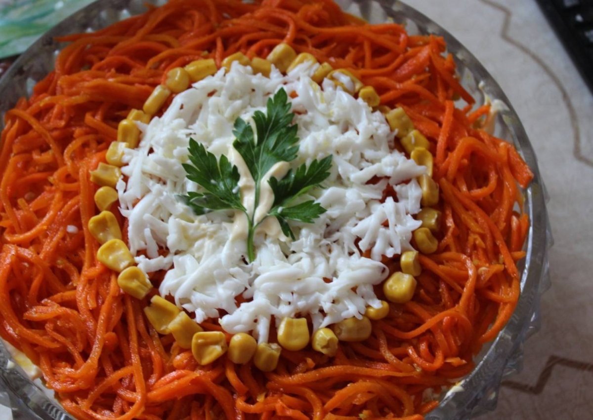 Салат с корейской морковью и крабовыми палочками и кукурузой