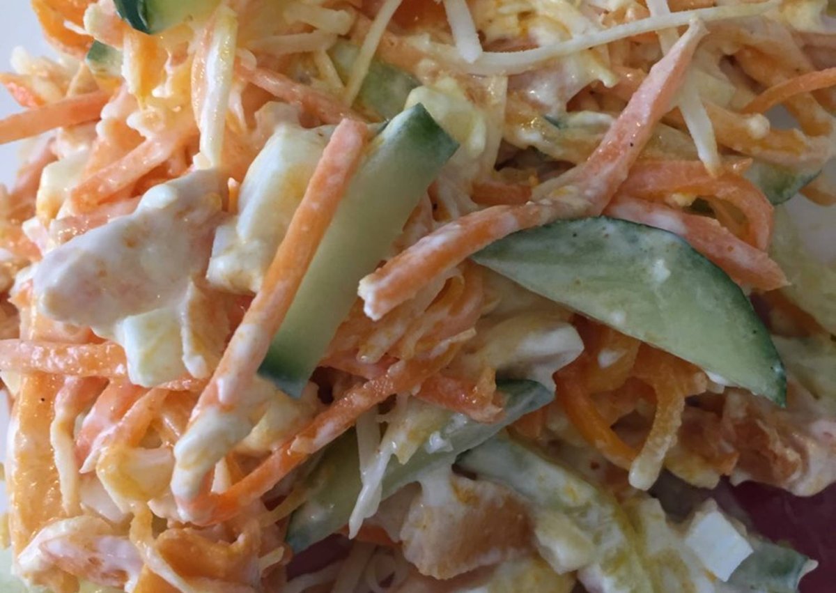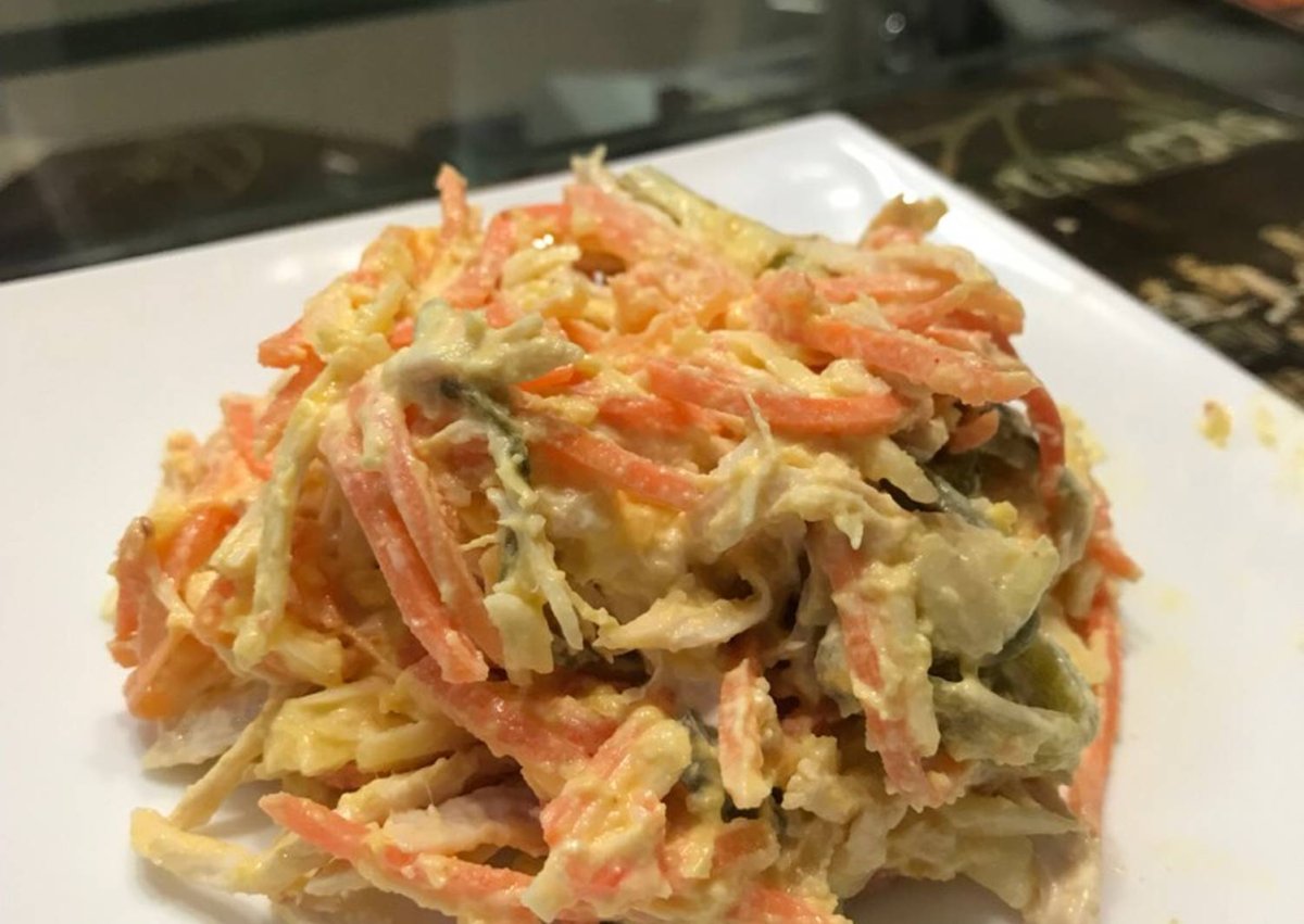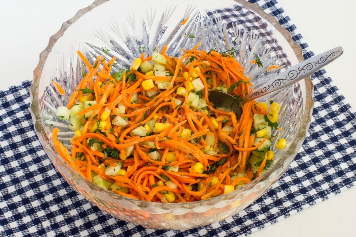 Салат с корейской морковью и курицей и кукурузой и огурцом