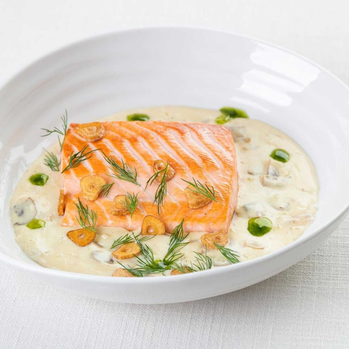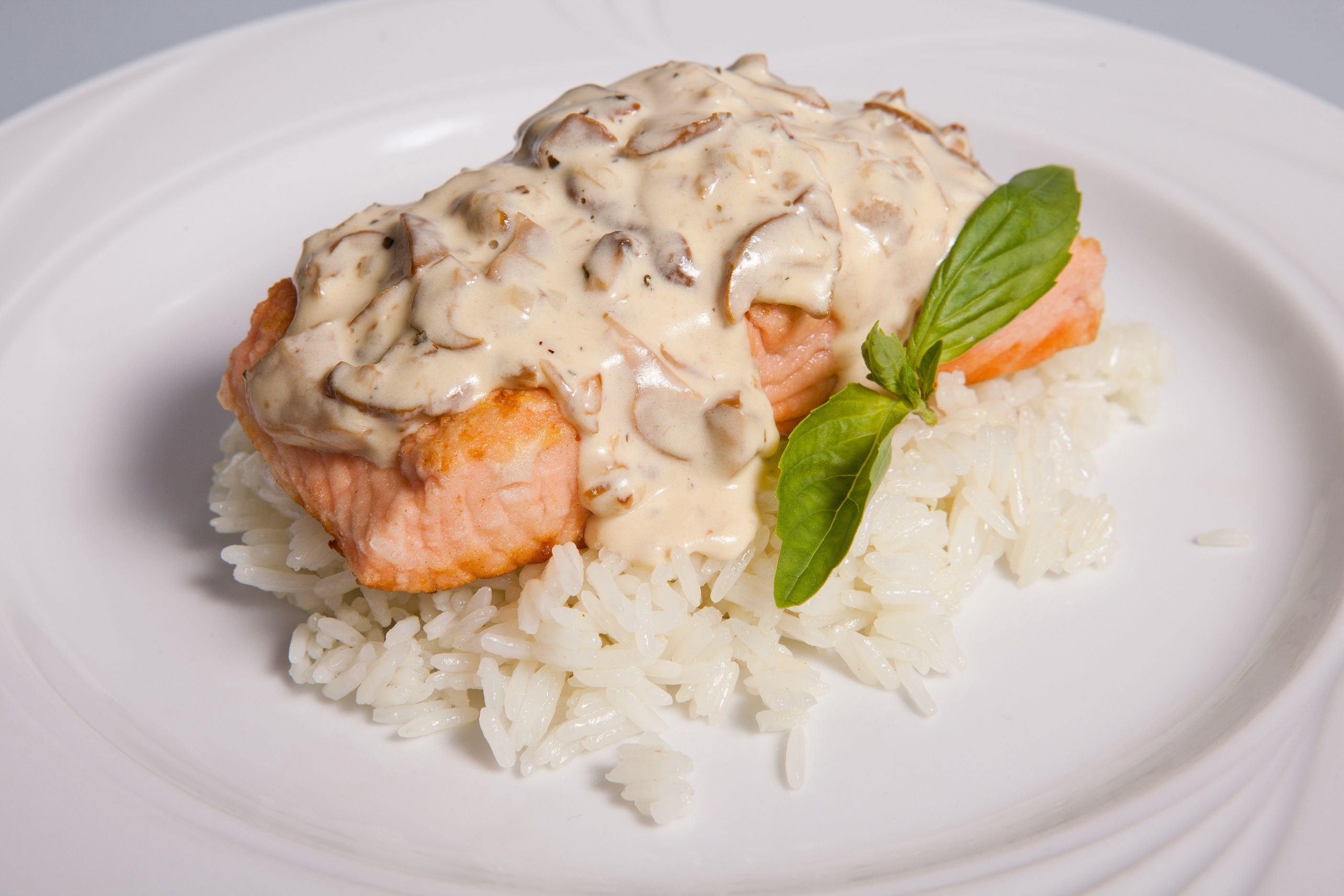 Филе лосося в сливочном соусе со шпинатом и грибами