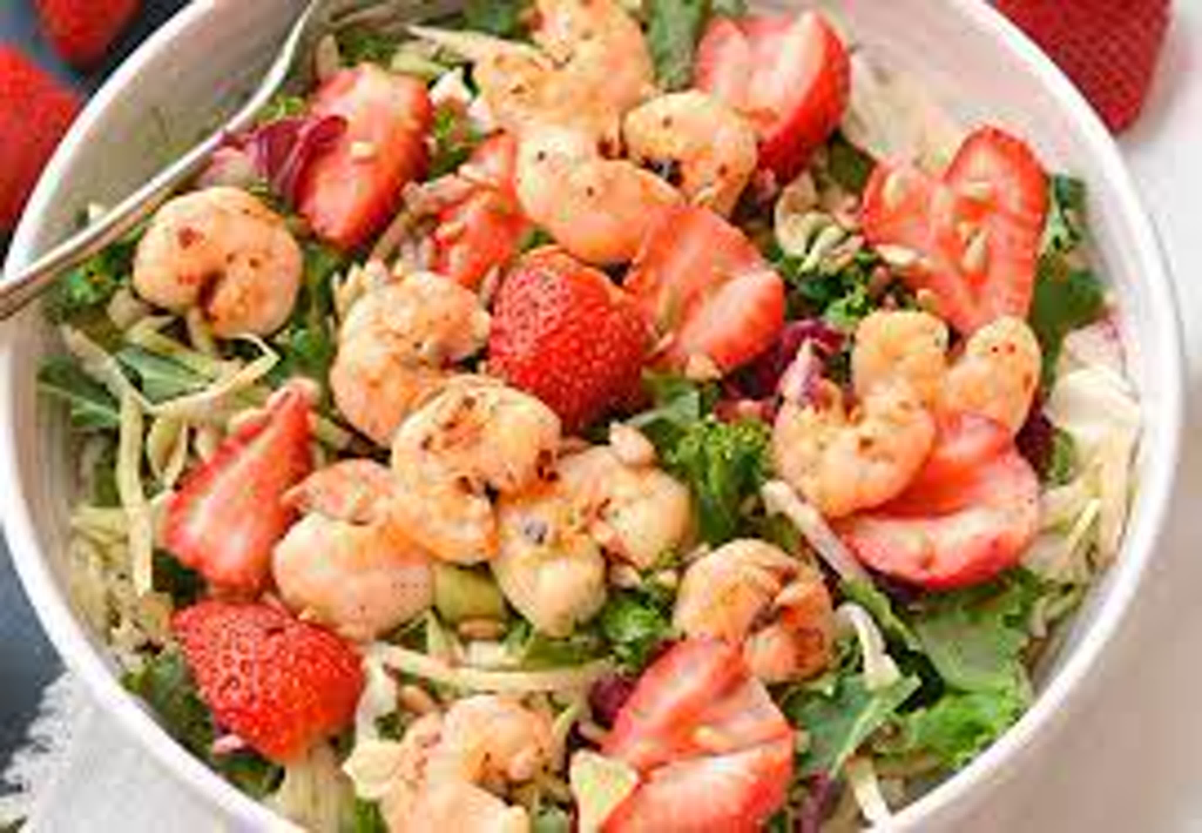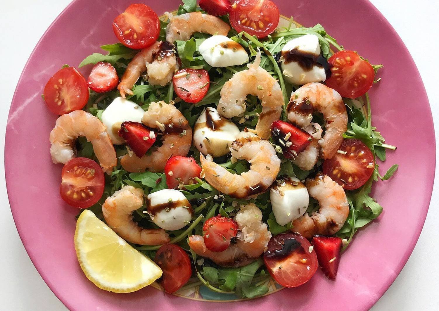 Салат с креветками и клубникой и рукколой