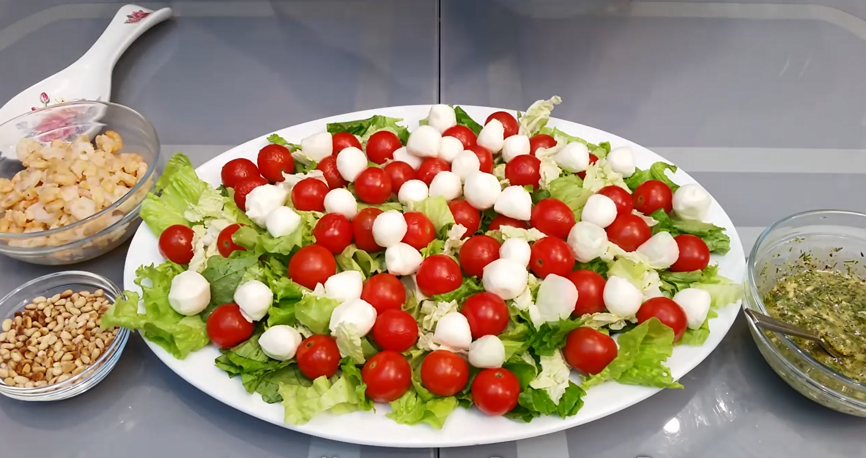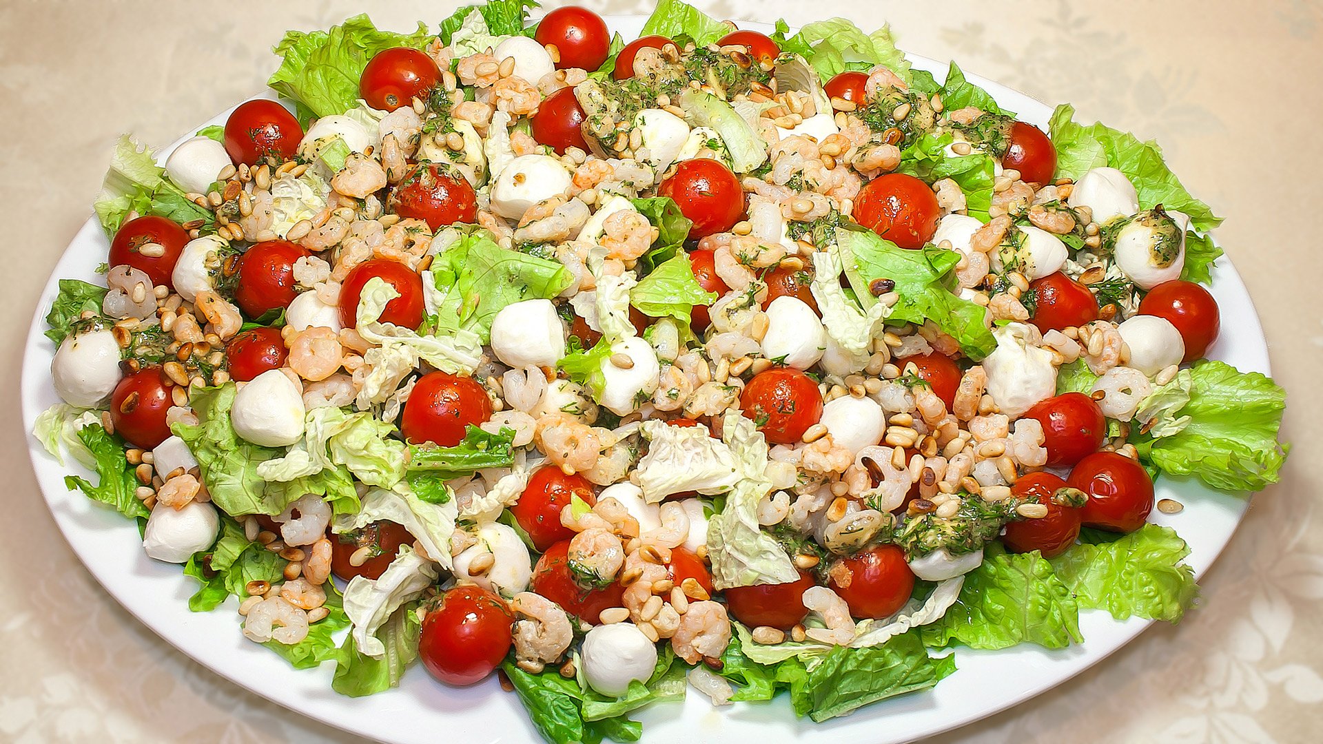 Салат с креветками и моцареллой и помидорами