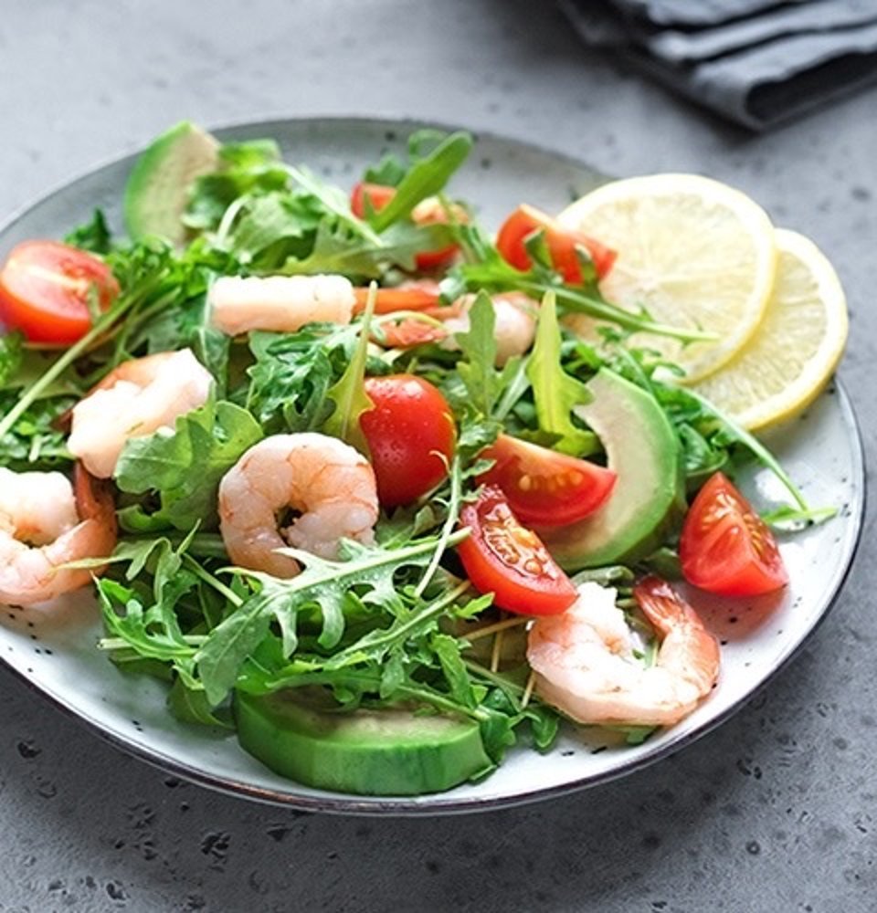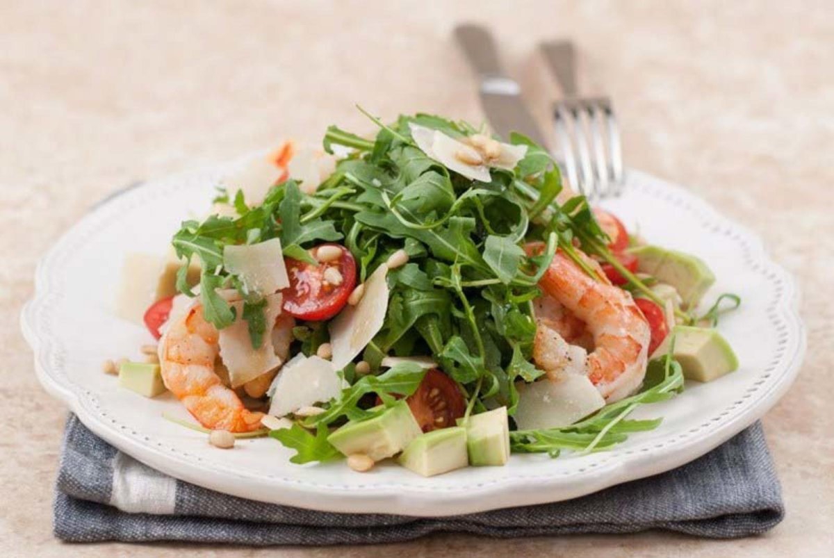 Руккола с креветками и авокадо