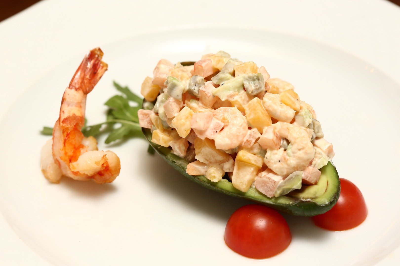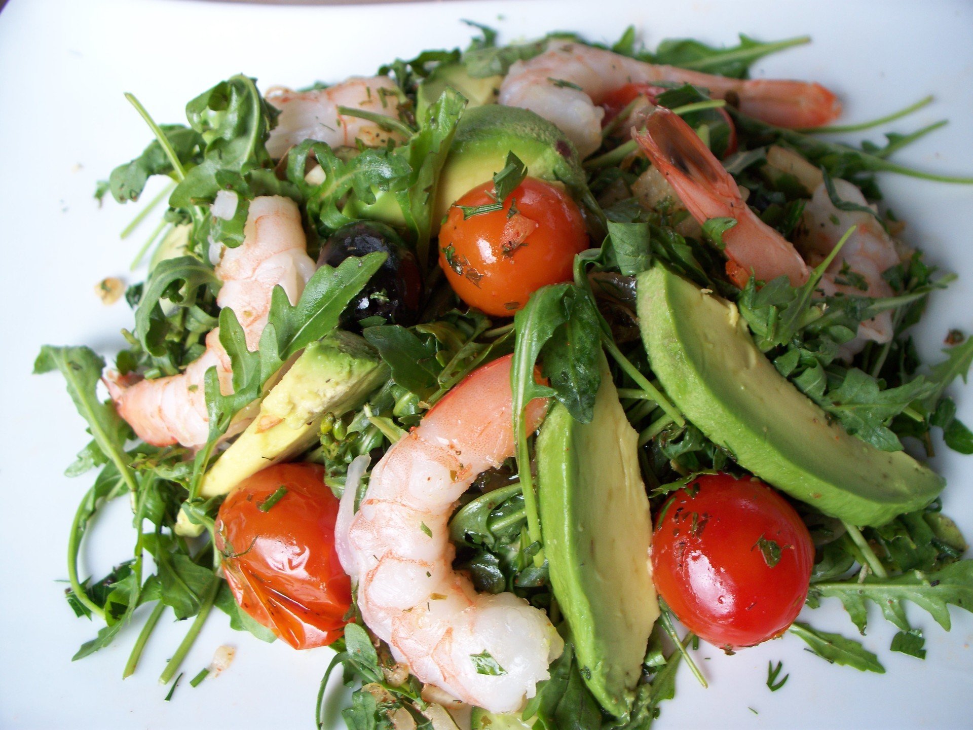 Салат креветки авокадо руккола черри