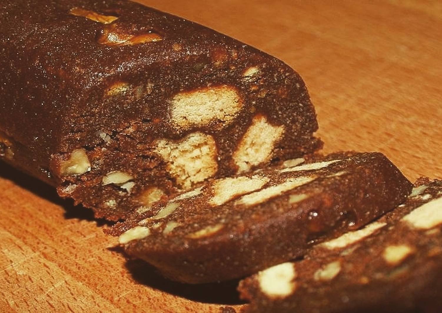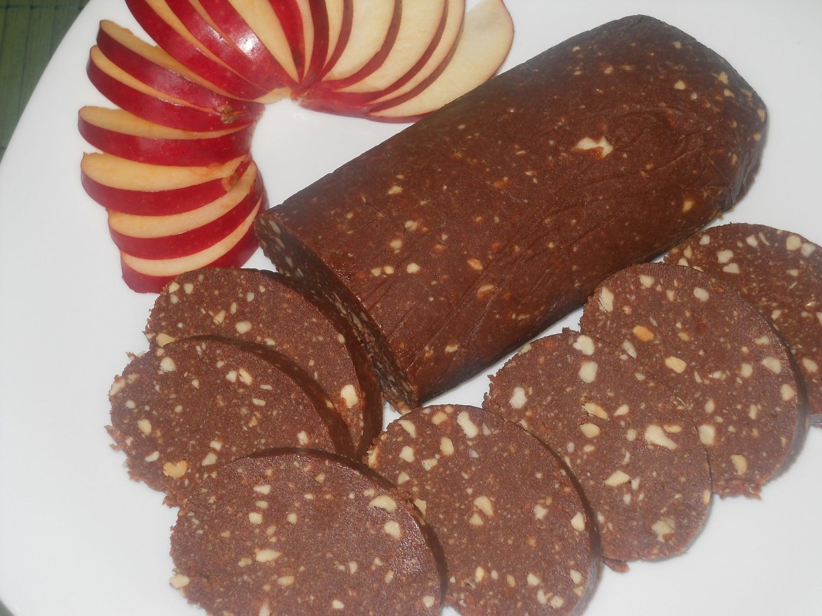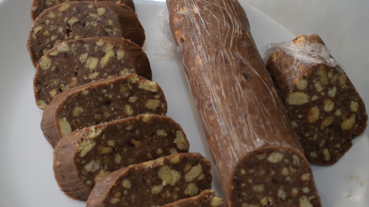 Шоколадная колбаса с печеньем и с орехами