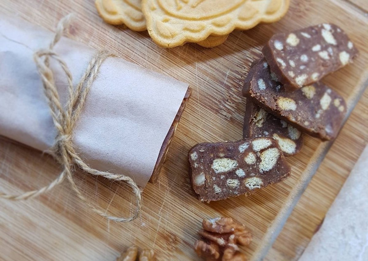 Сладкая колбаска из печенья с орехами