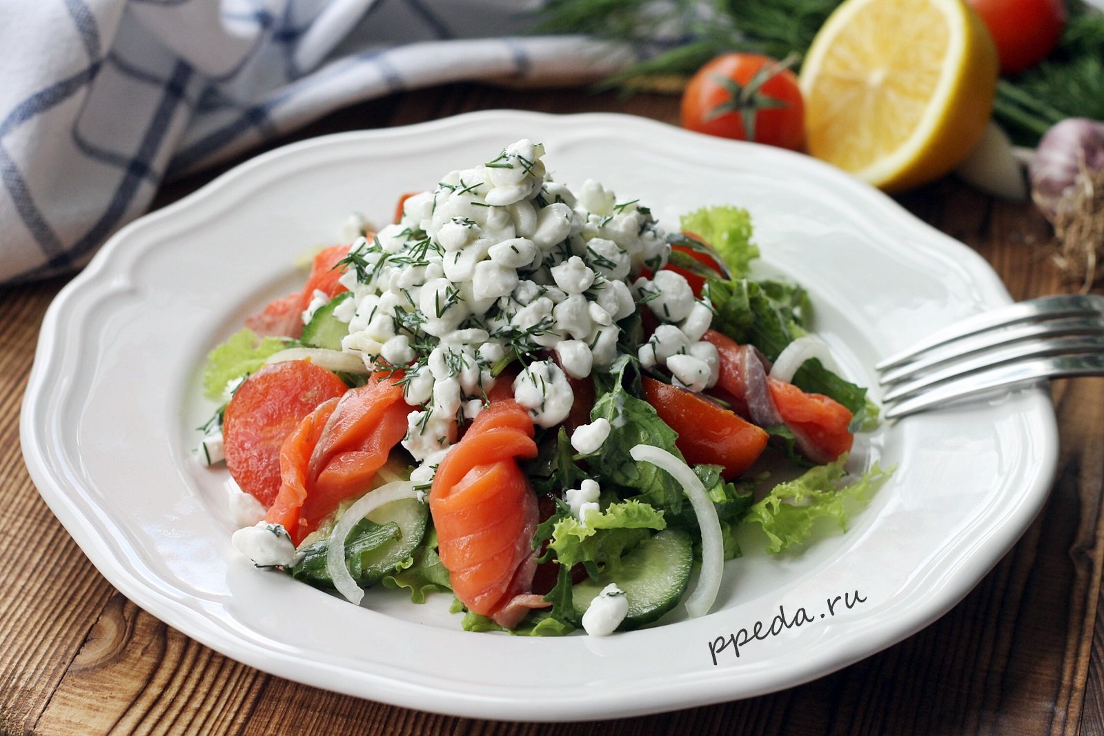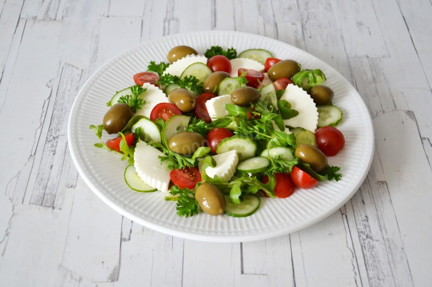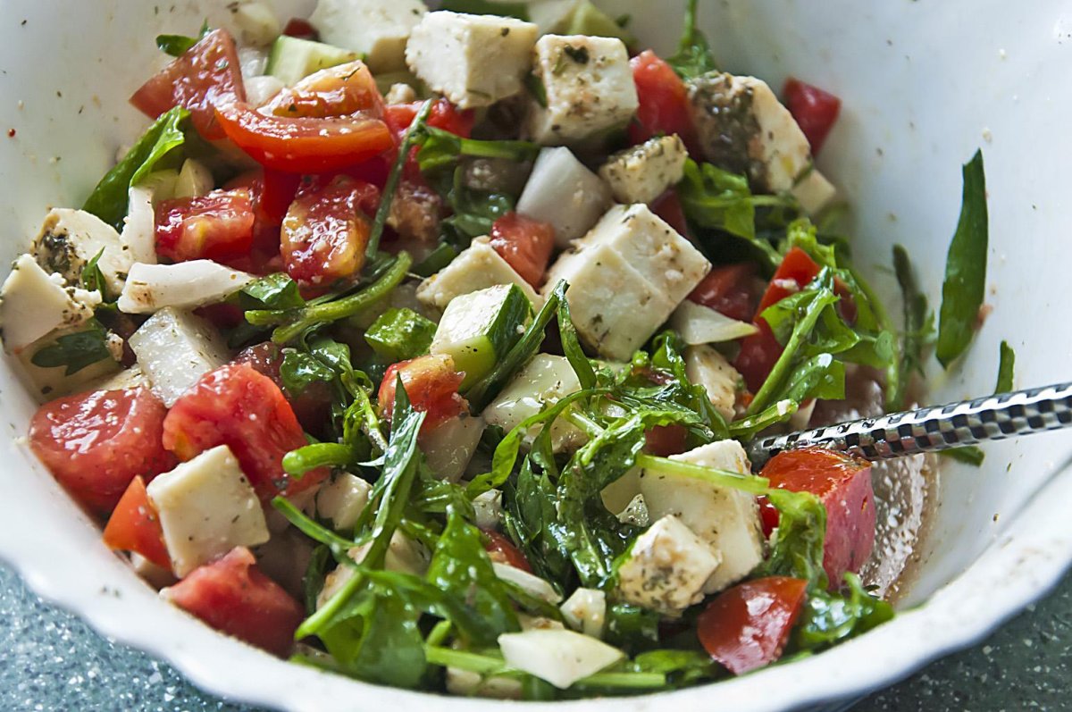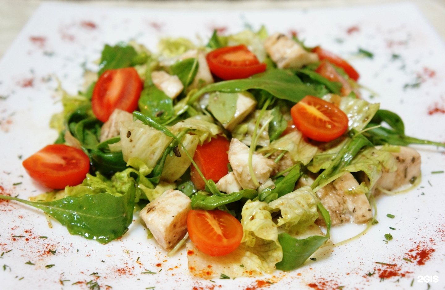 Салат с рукколой помидорами черри .сыром ,курицей.