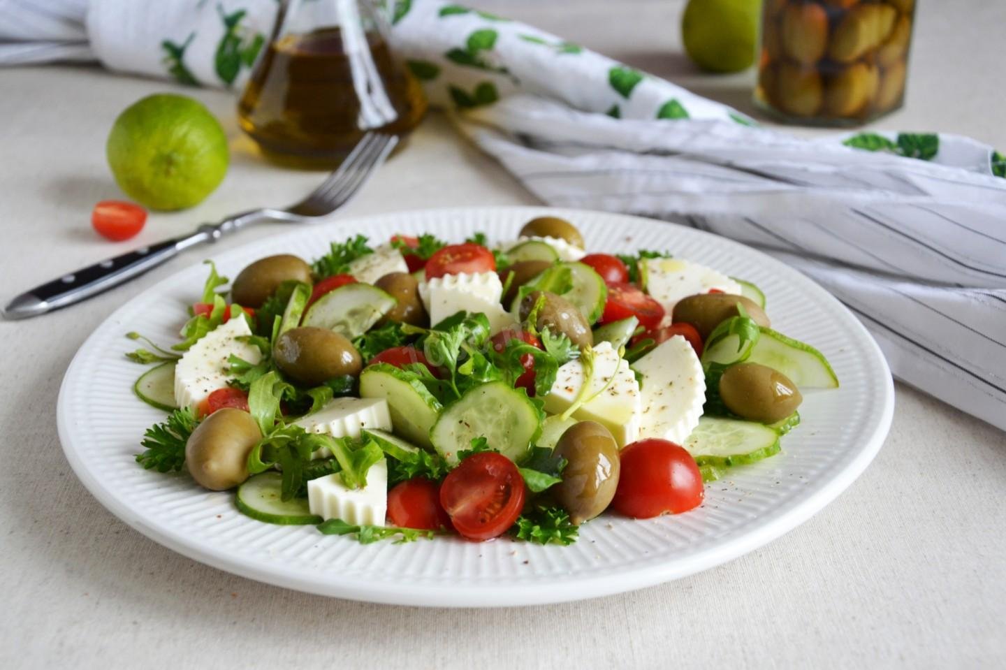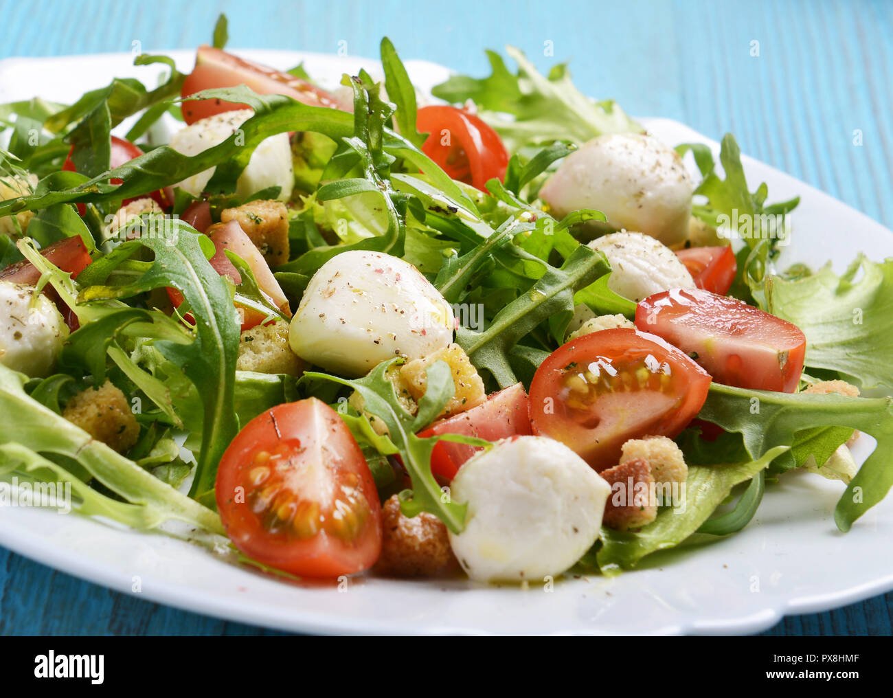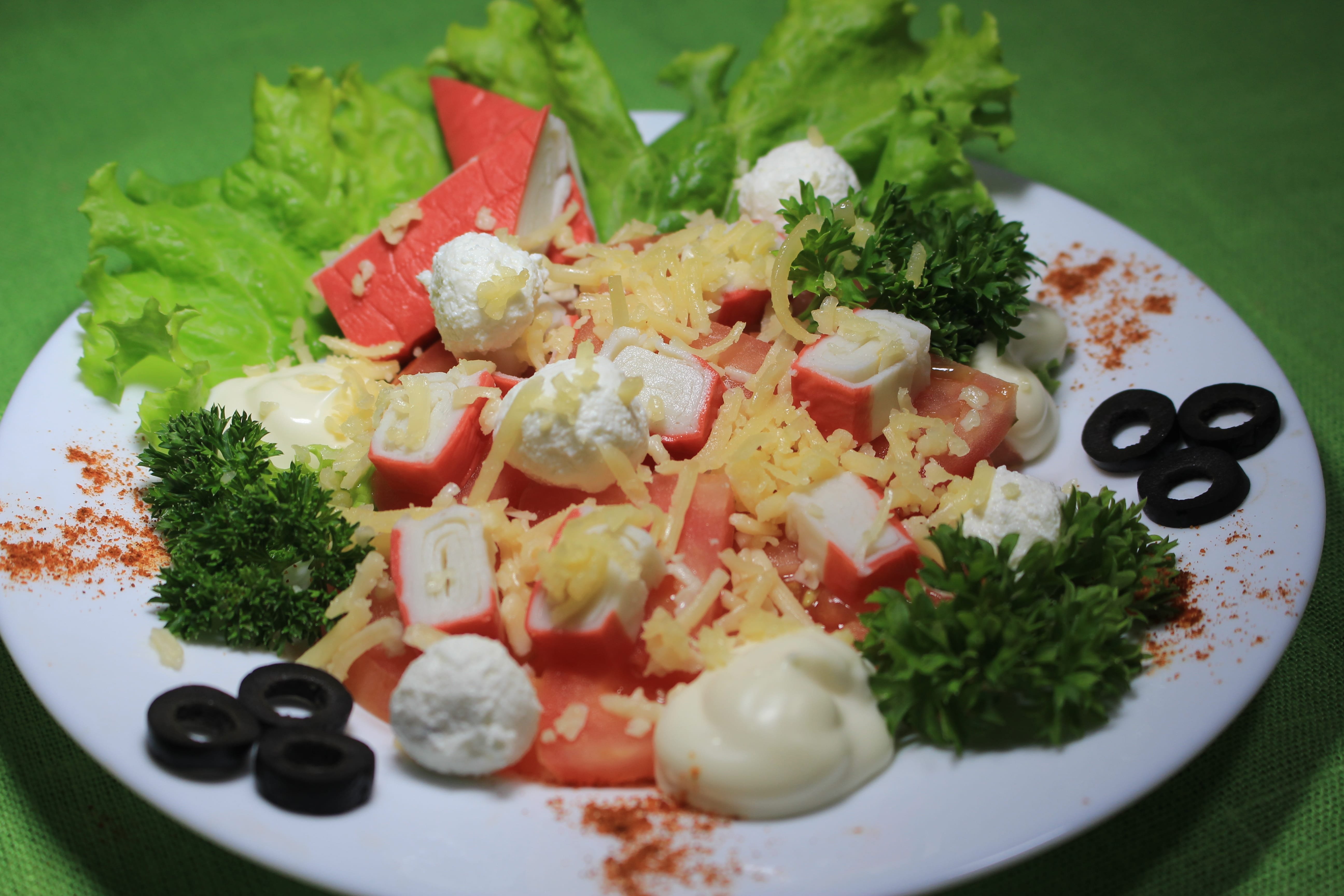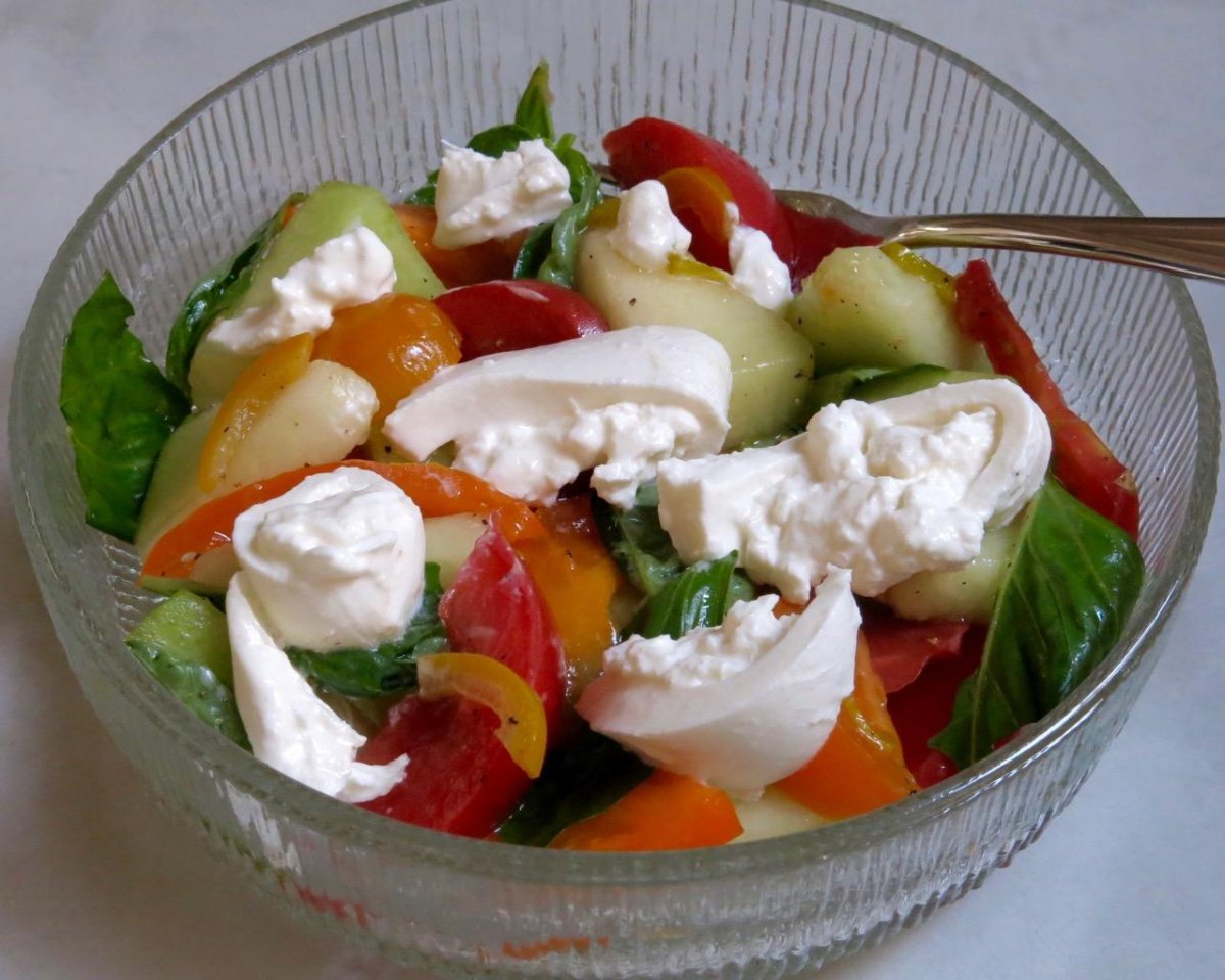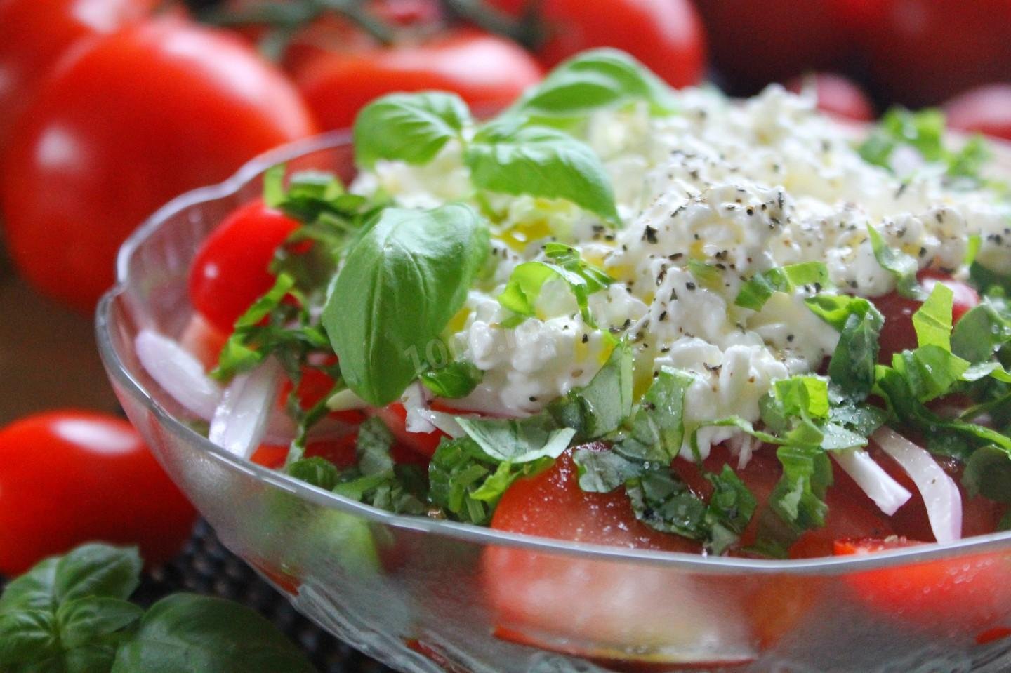 Салат с рукколой помидорами черри .сыром ,курицей.