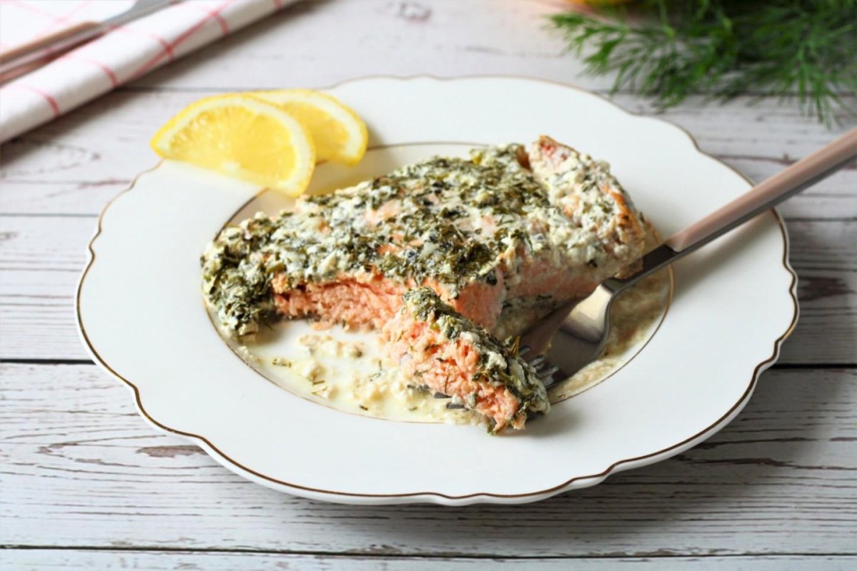 Кета в сливочном соусе со шпинатом