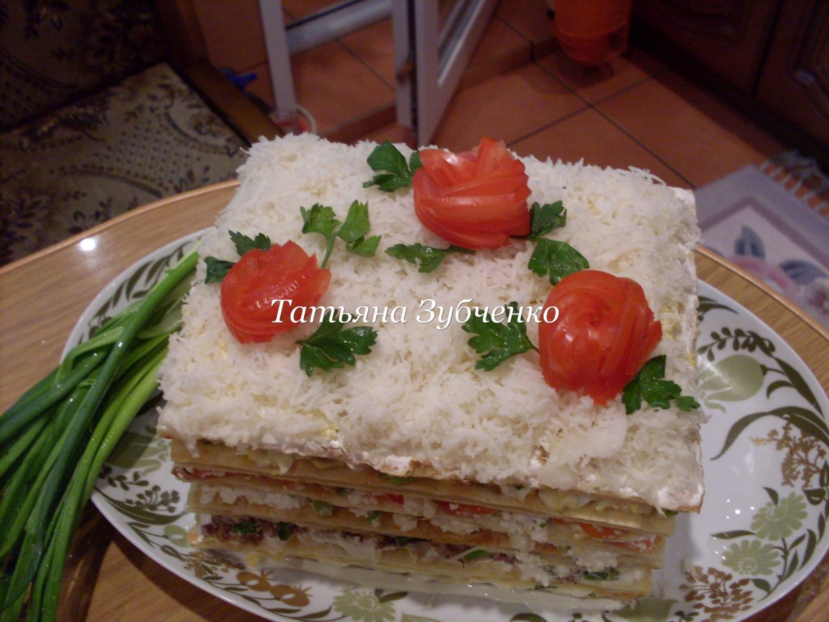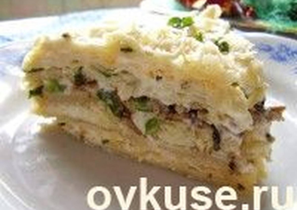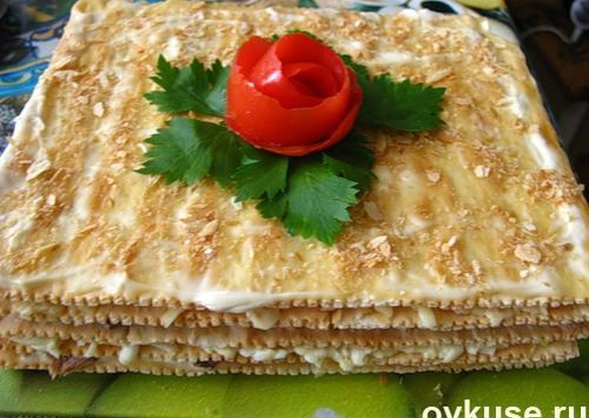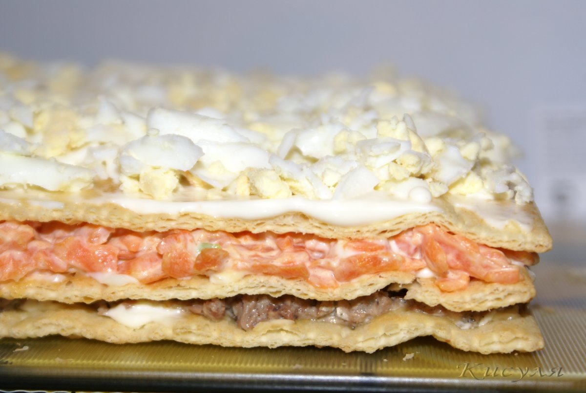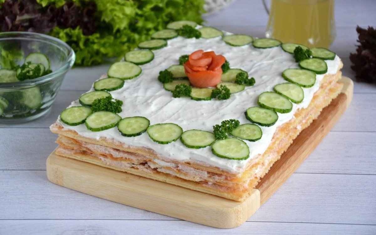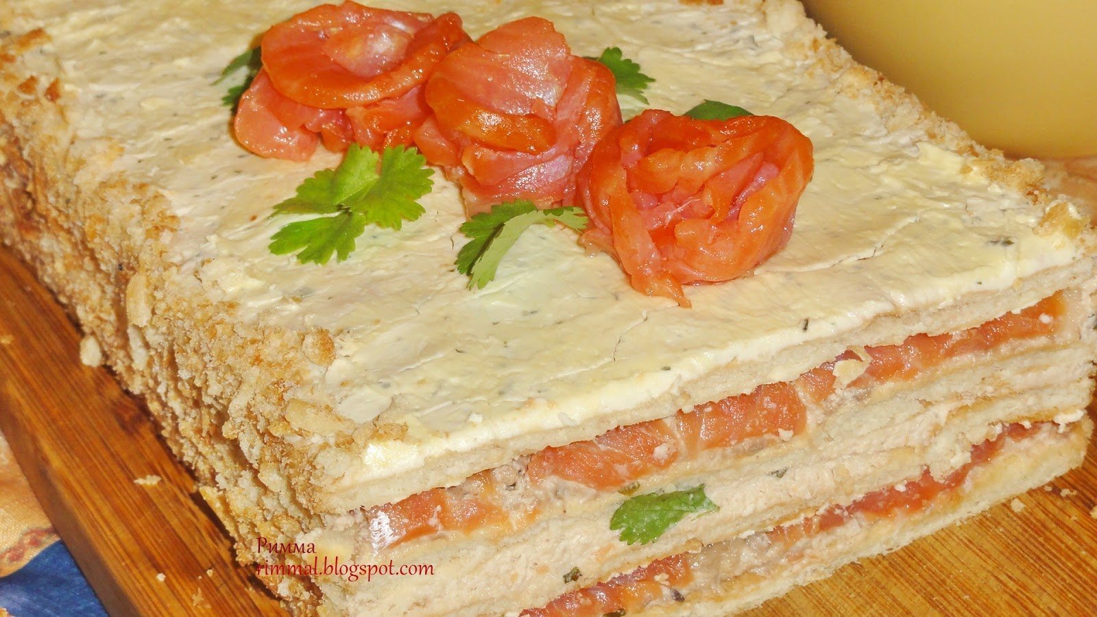 Торт закусочный Наполеон из готовых коржей с красной рыбой