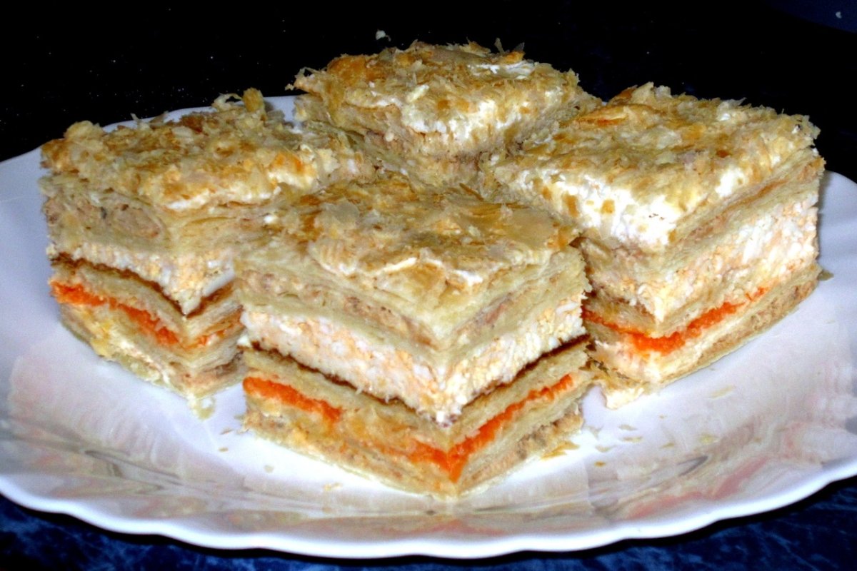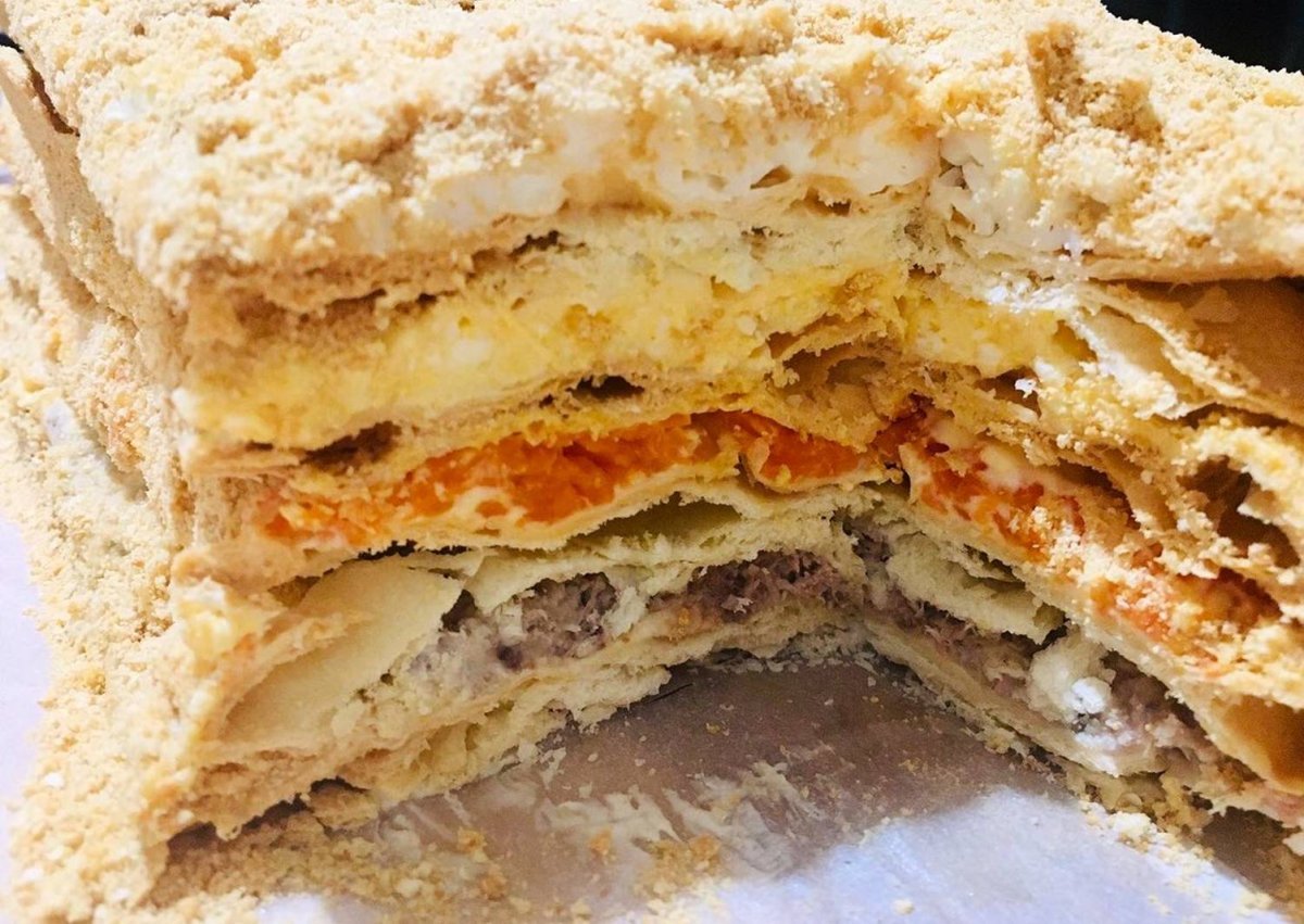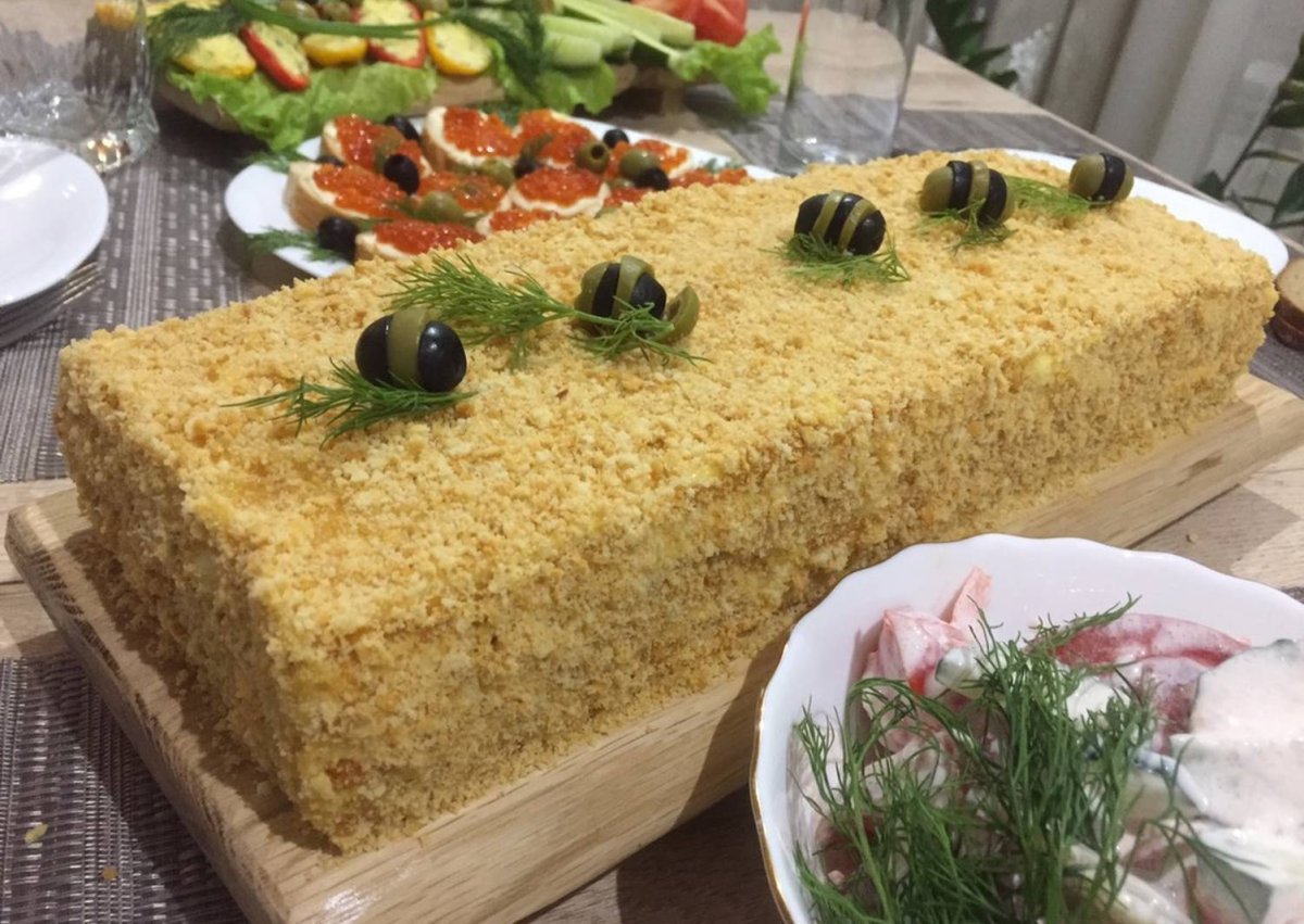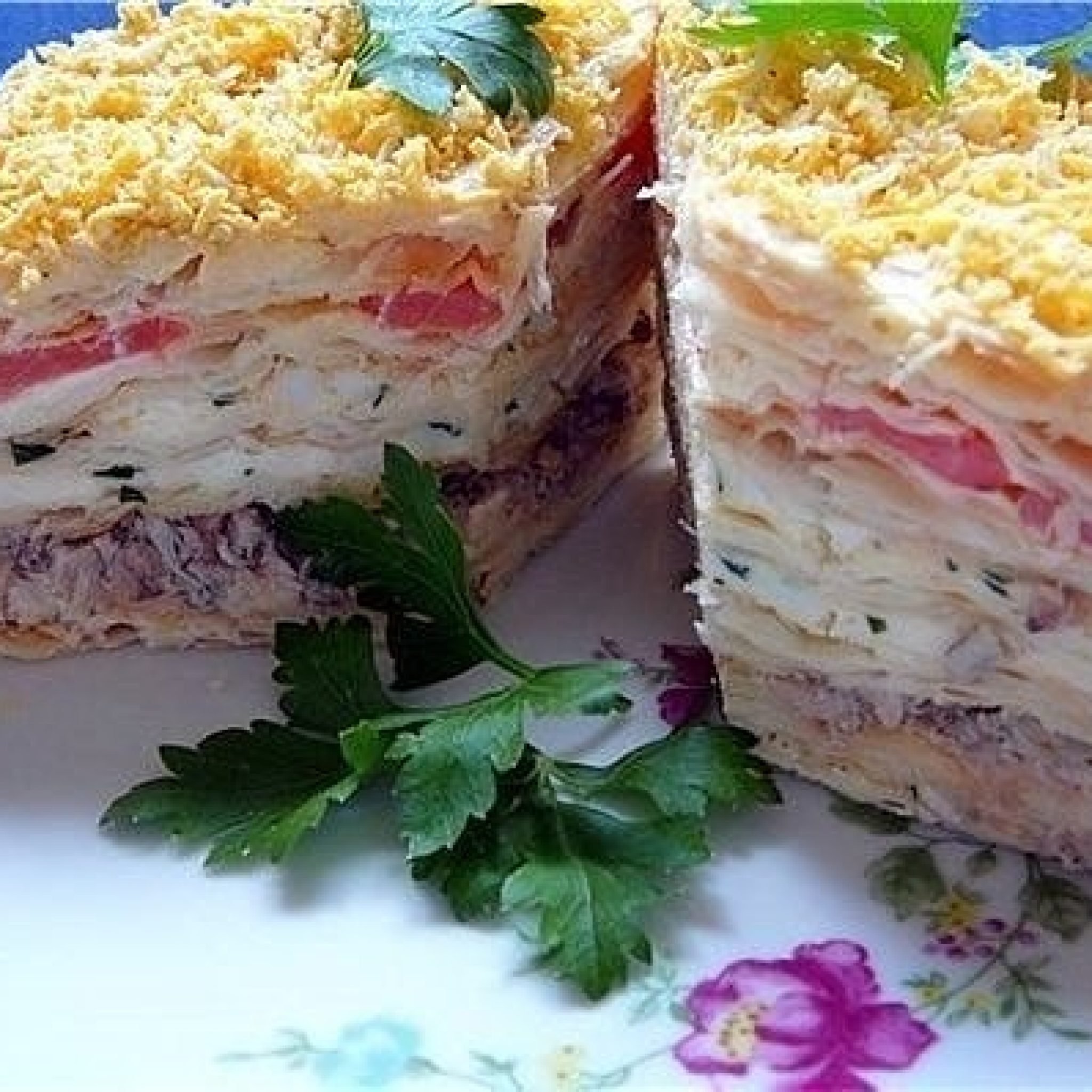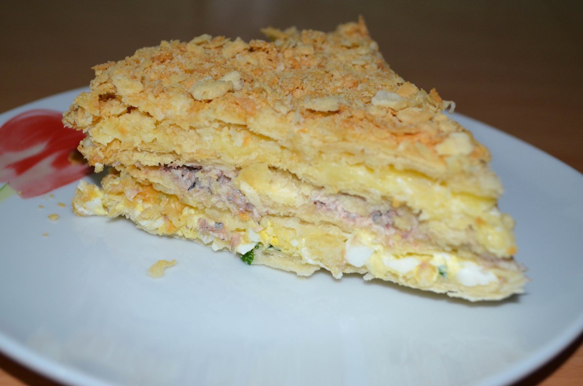 Торт закусочный Наполеон из готовых коржей с красной рыбой