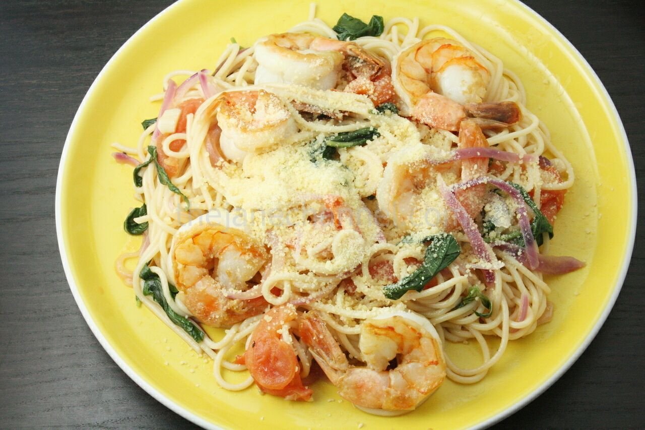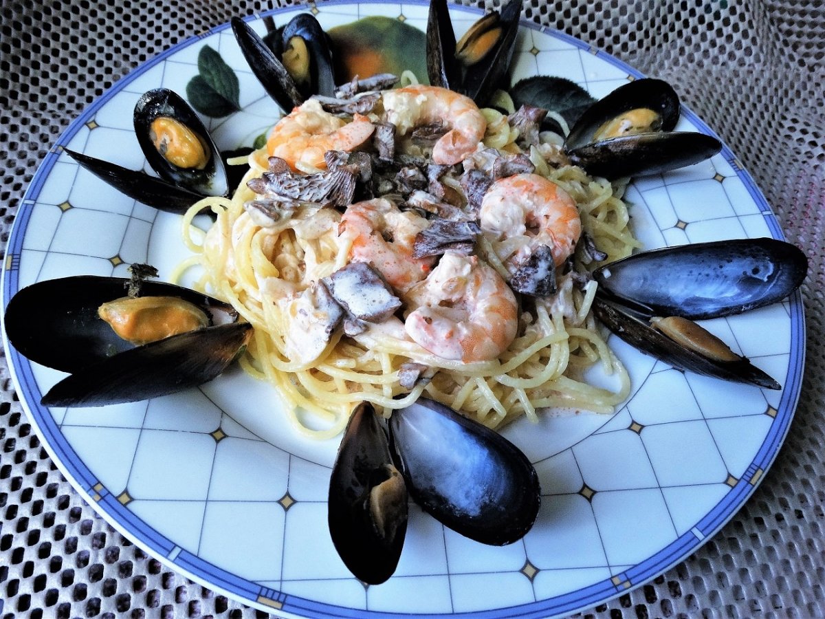 Паста с тигровыми креветками мидиями