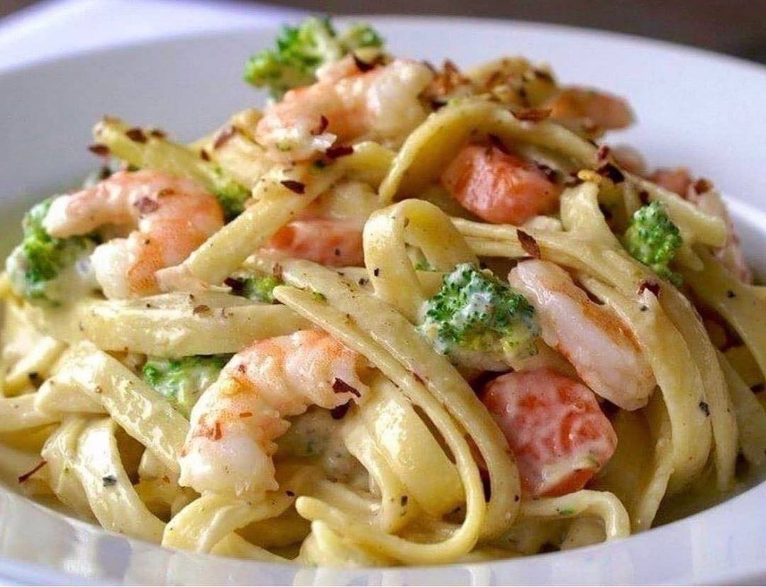 Паста с креветками и брокколи в сливочно-чесночном соусе