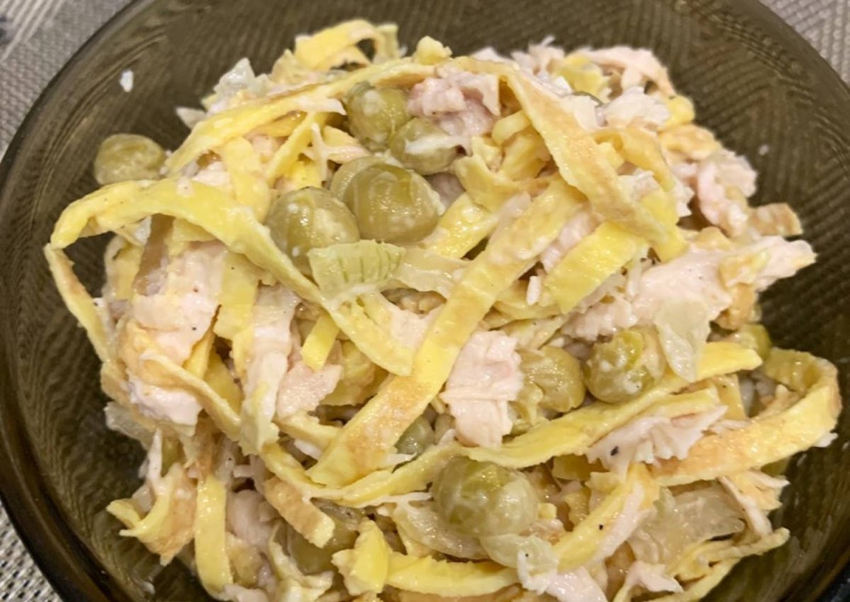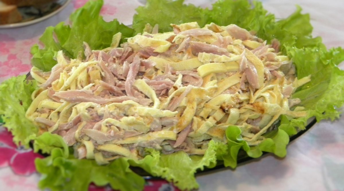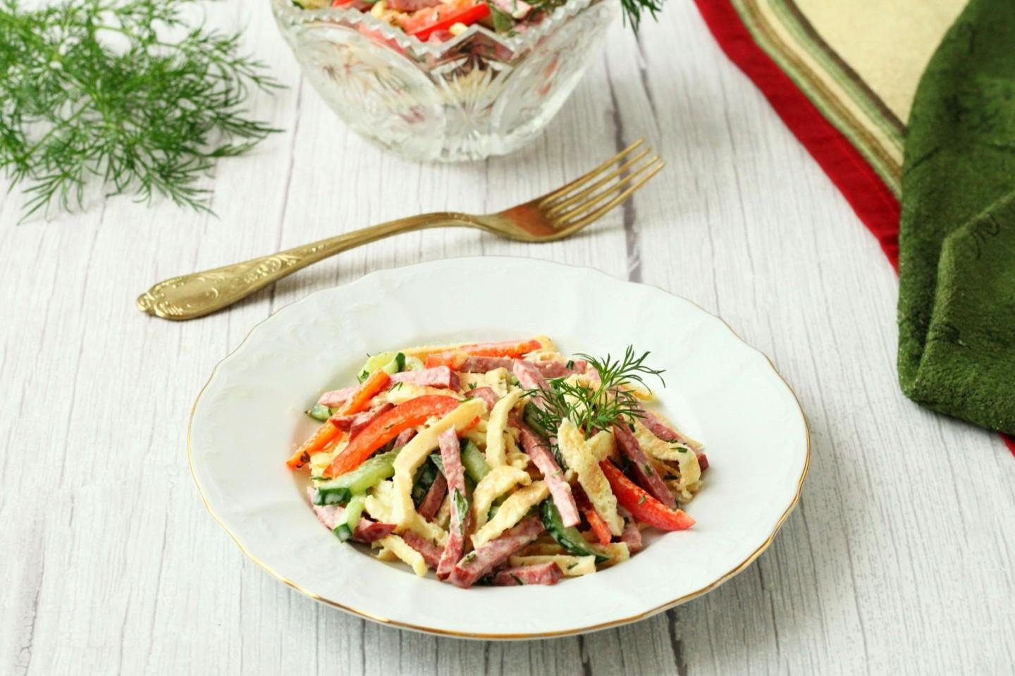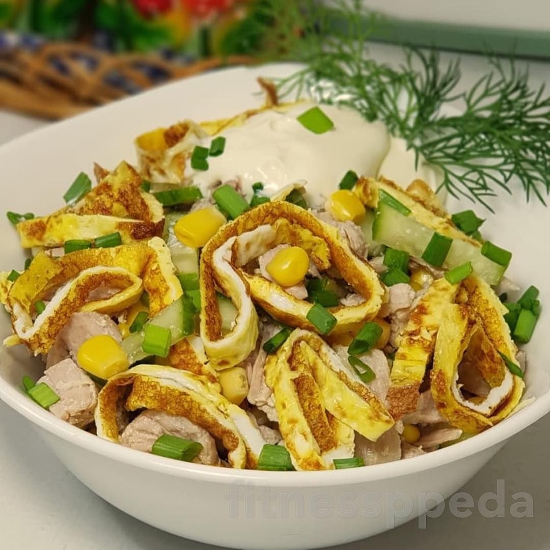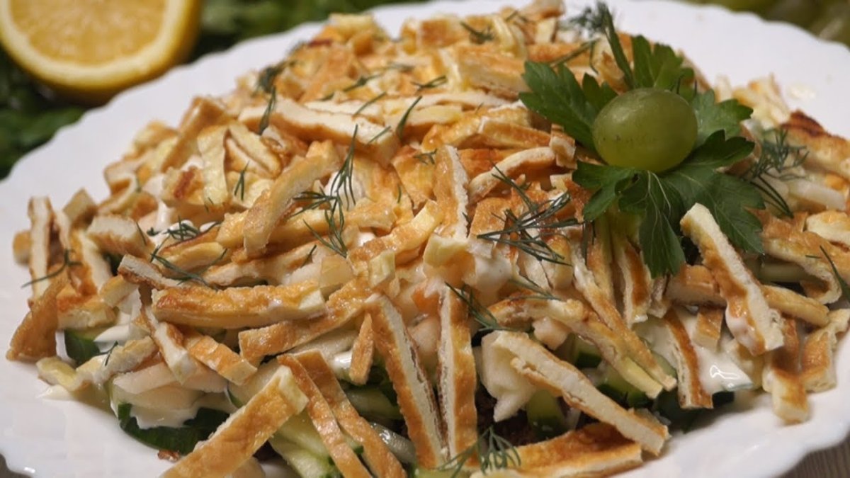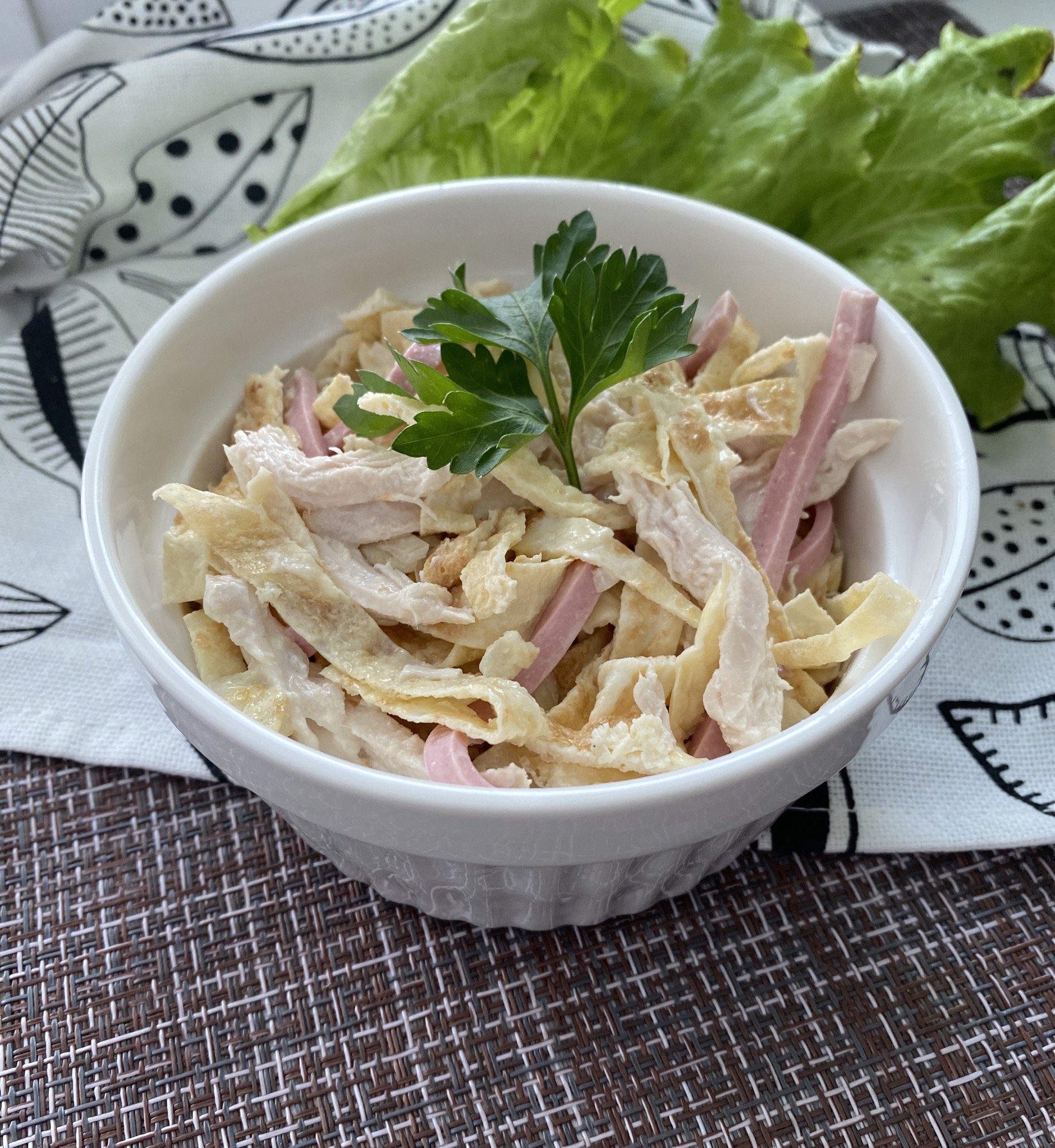 Салат с яичными блинчиками и копченой курицей и огурцом
