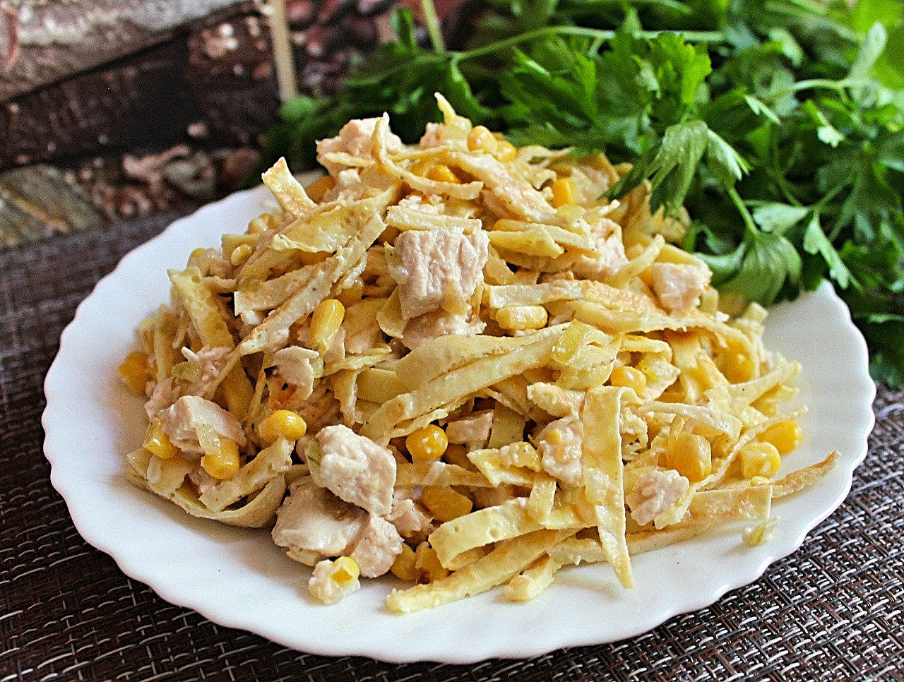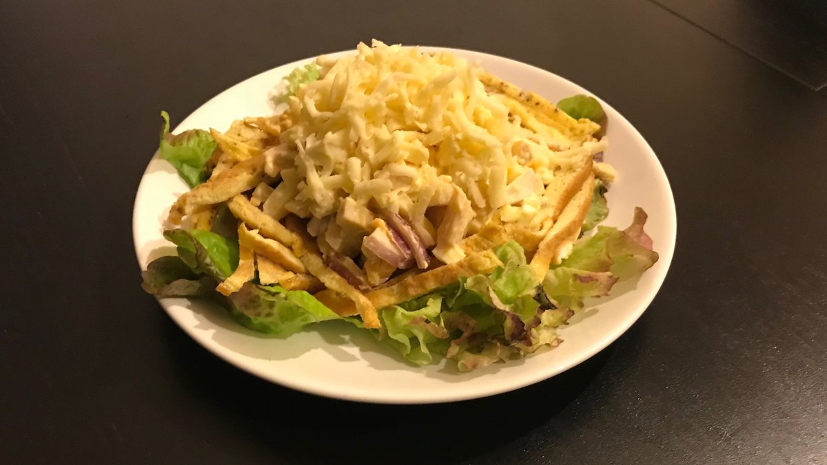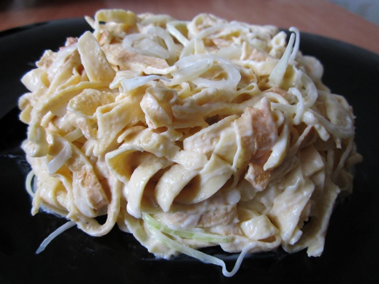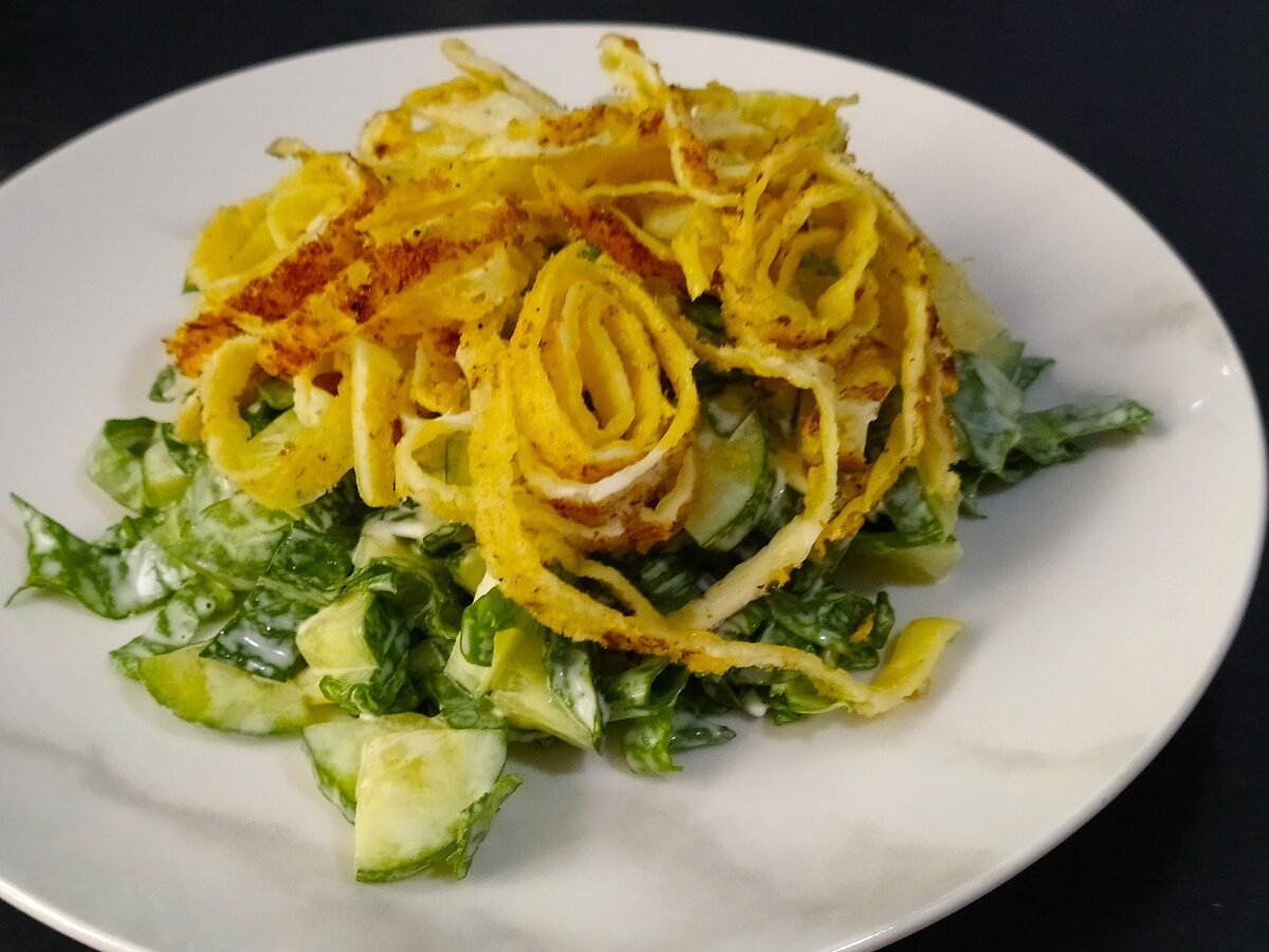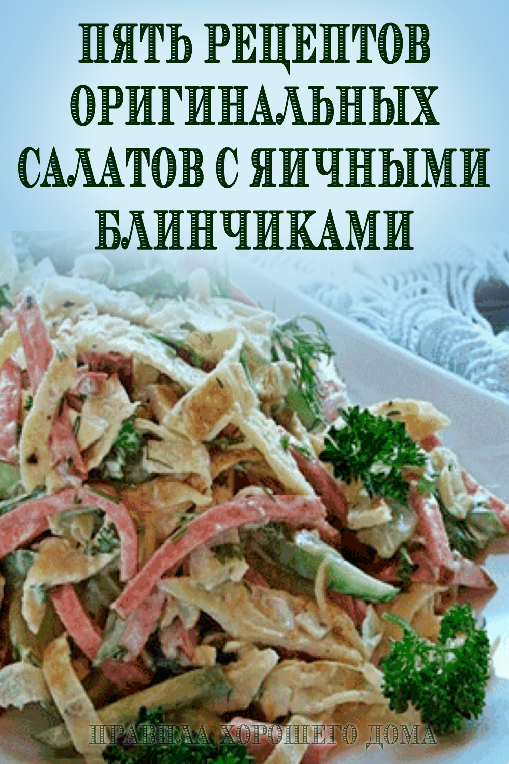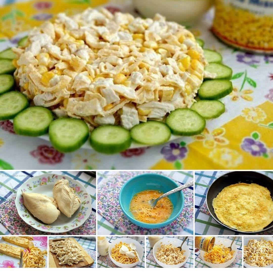 Салат с яичными блинчиками и копченой курицей и огурцом