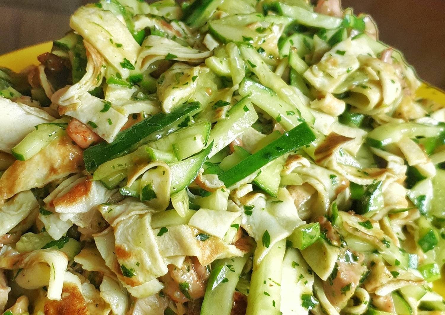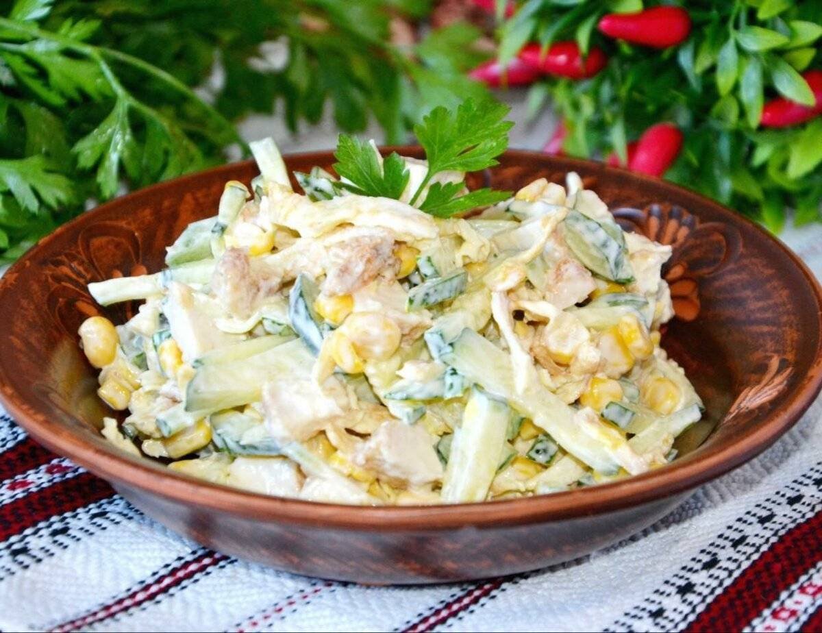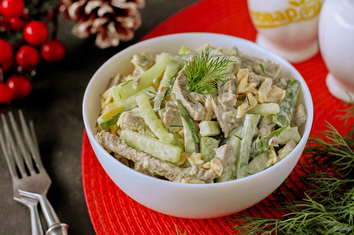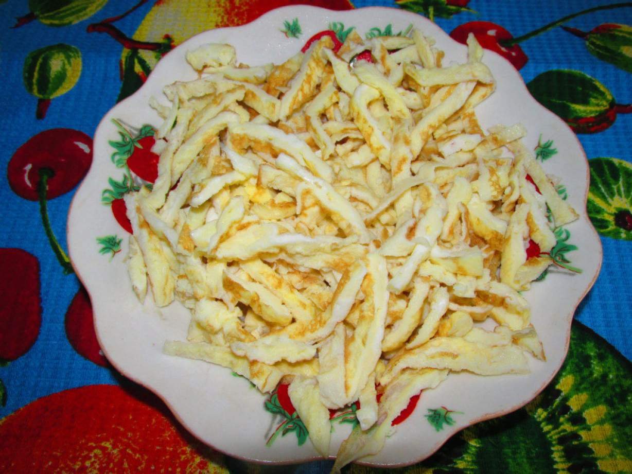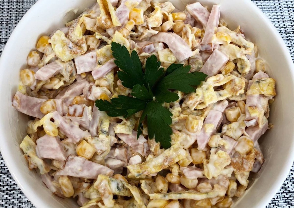 Салат с яичными блинчиками и копченой курицей и огурцом