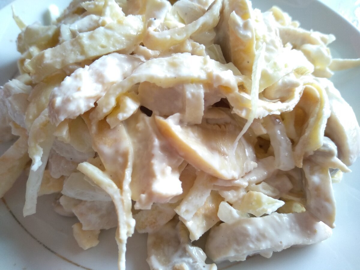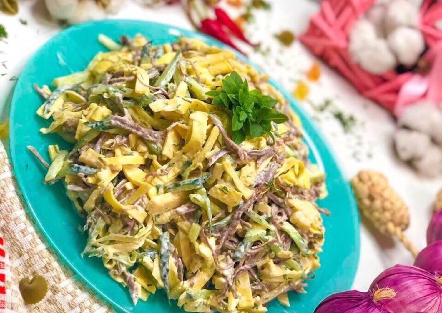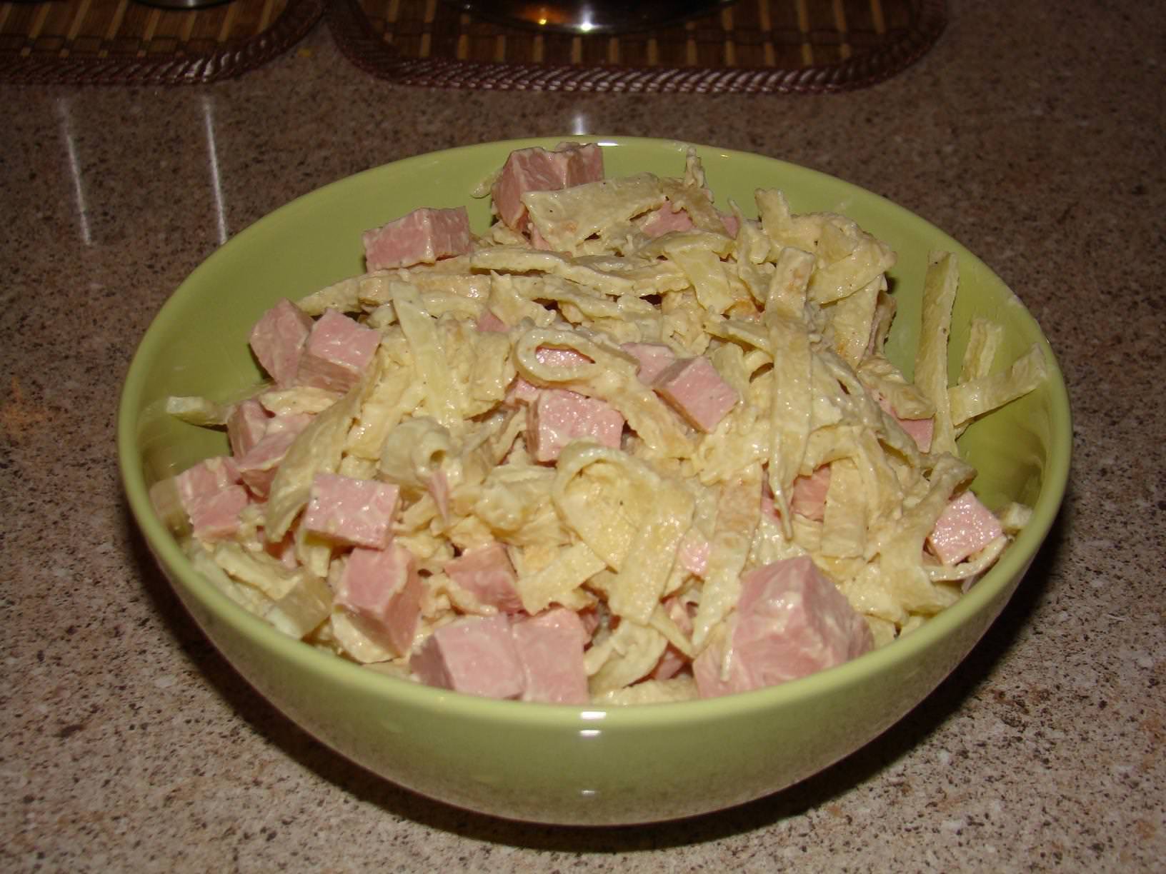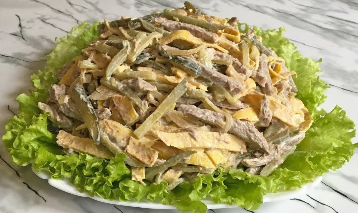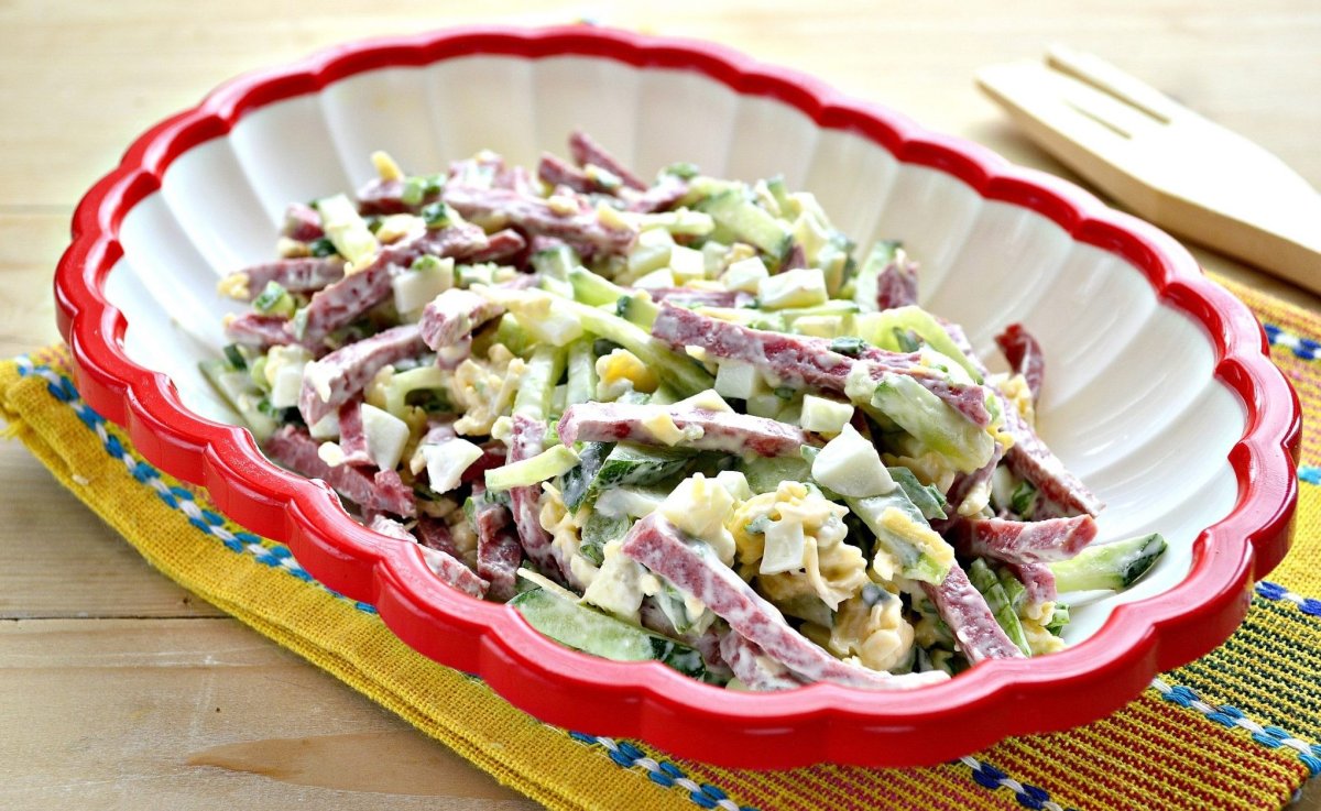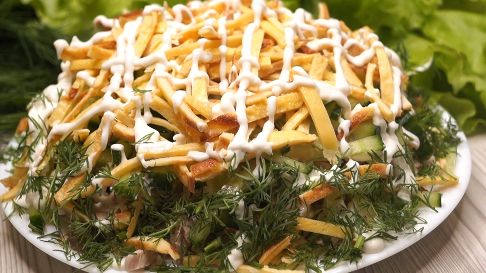 Салат с яичными блинчиками и копченой курицей и огурцом