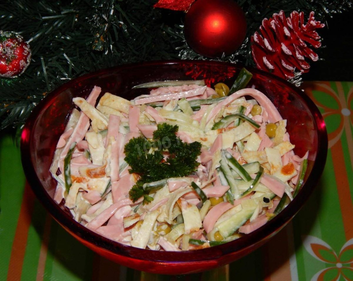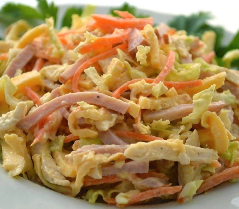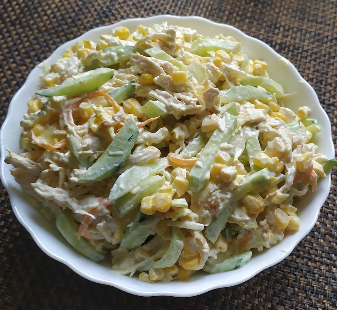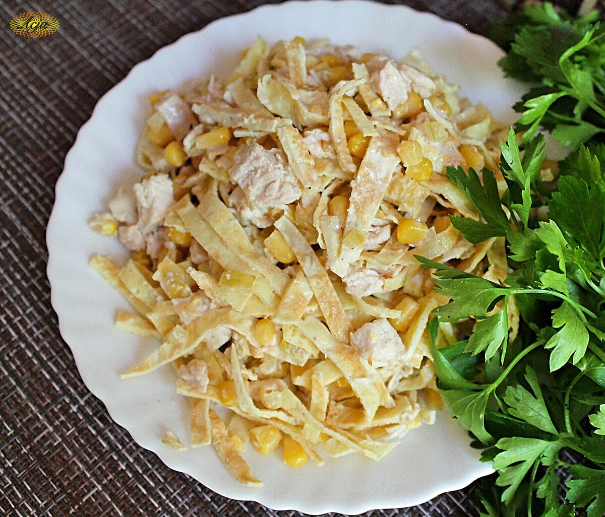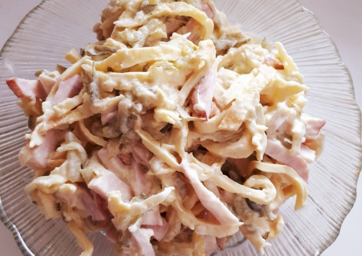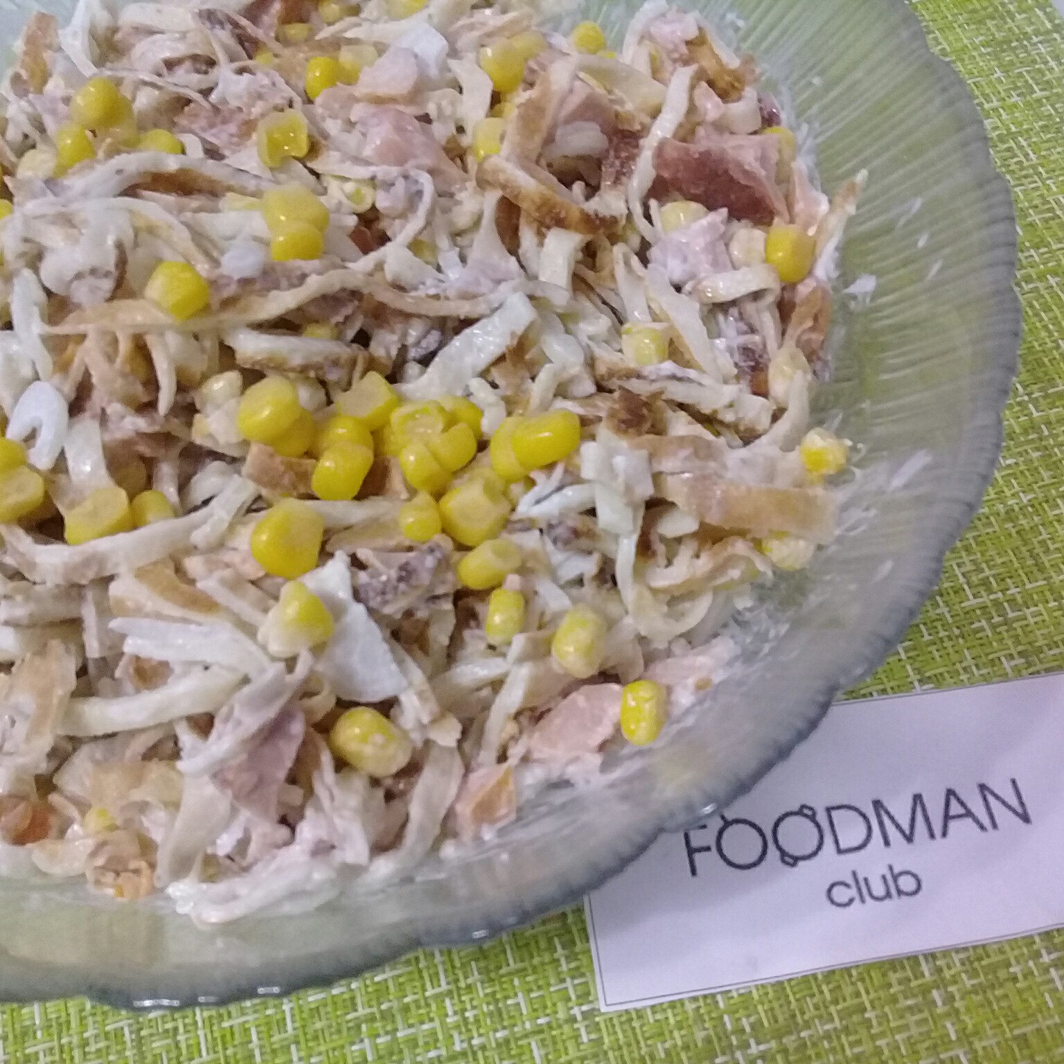Салат с яичными блинчиками и копченой курицей и огурцом