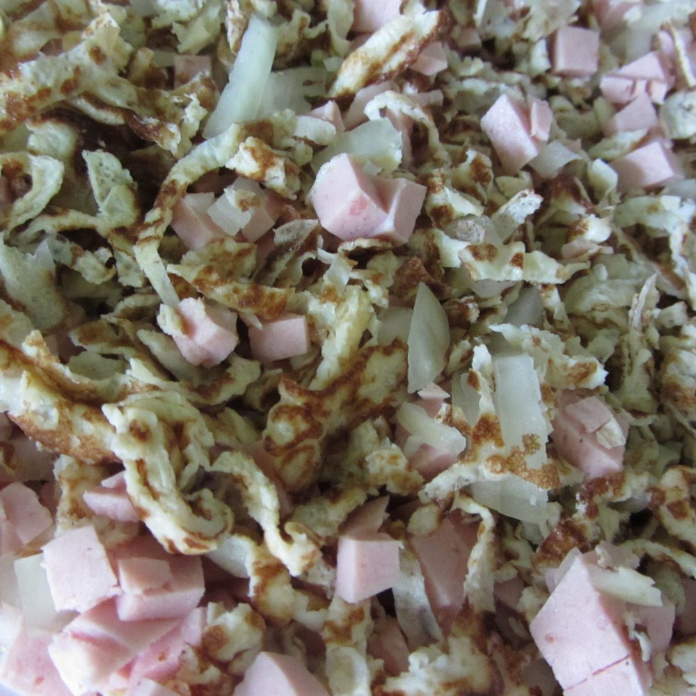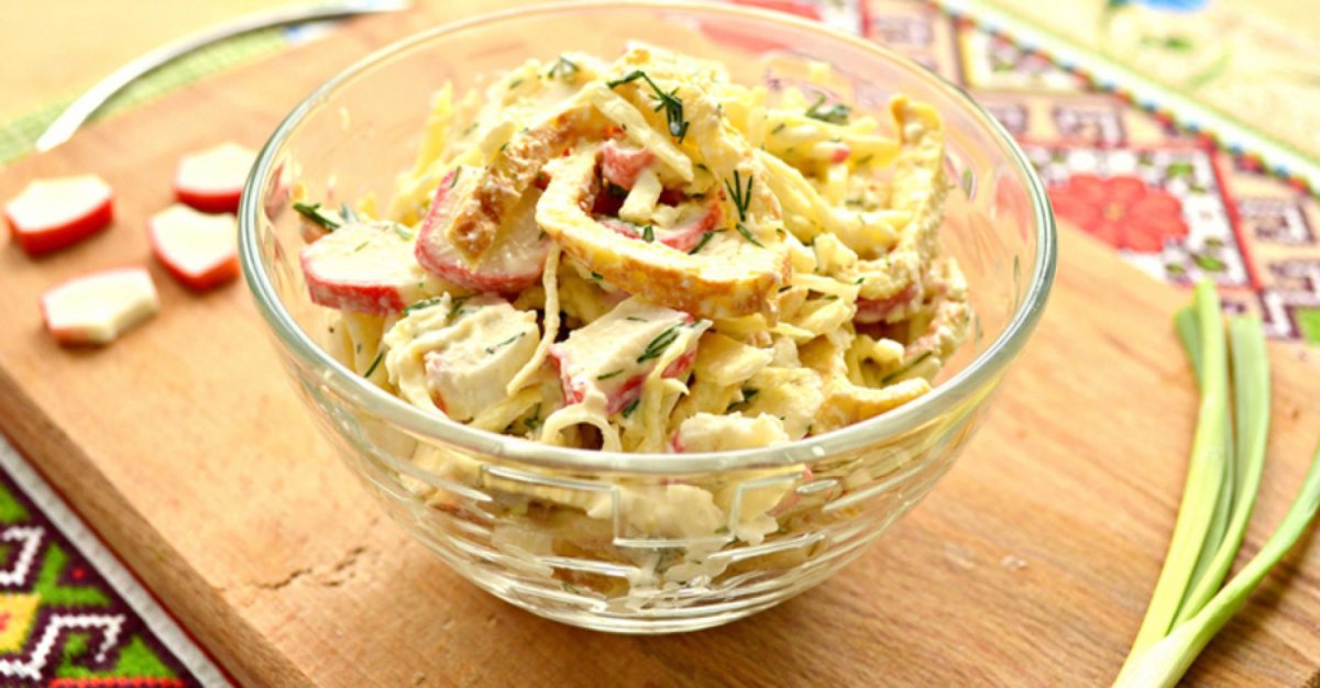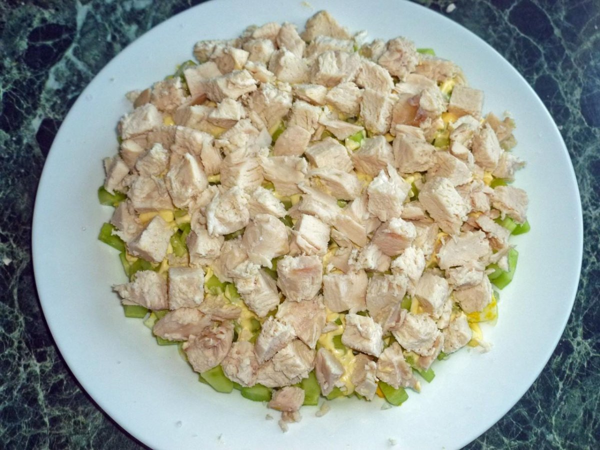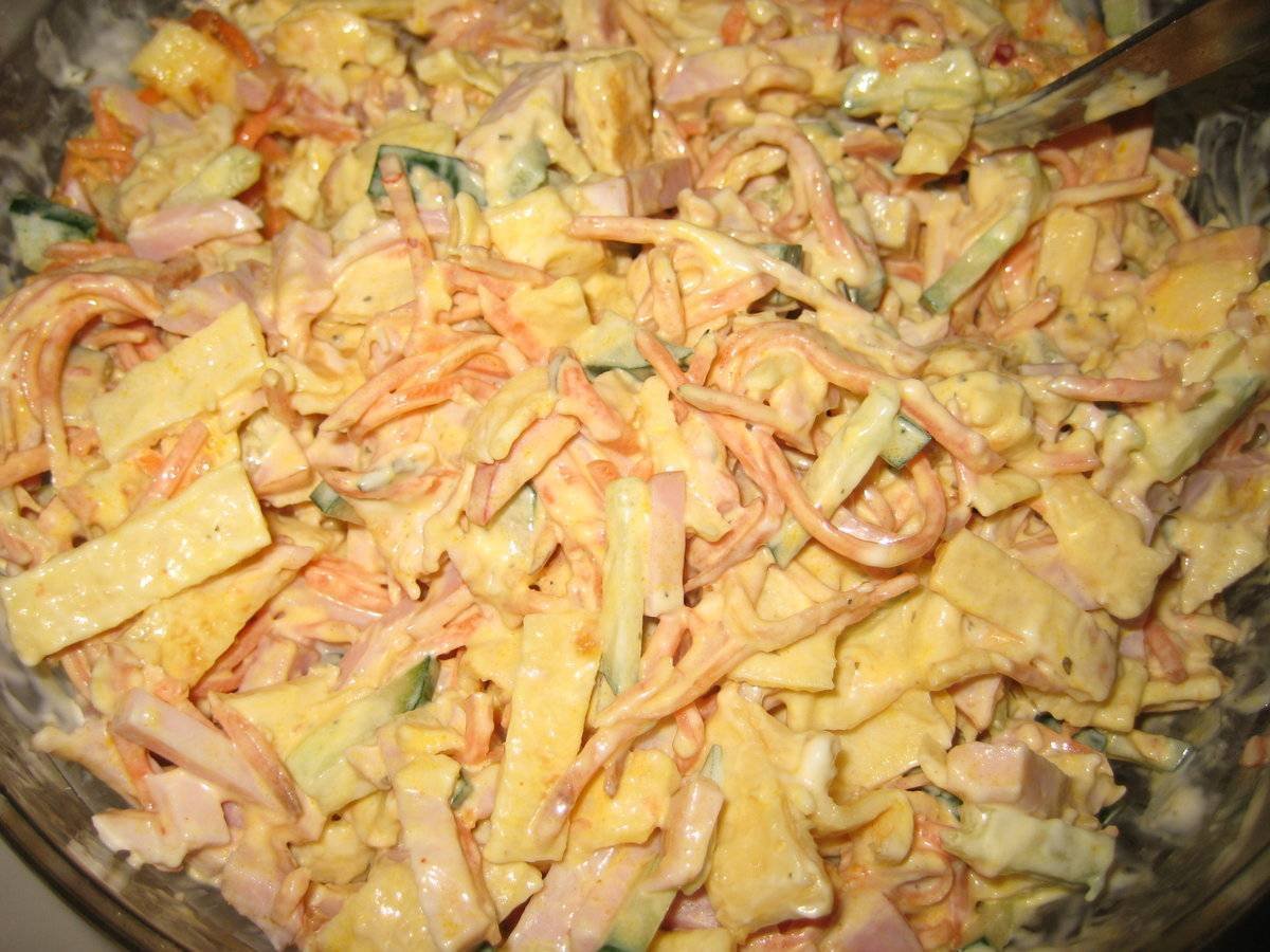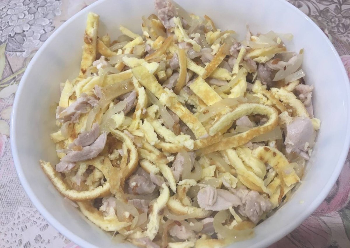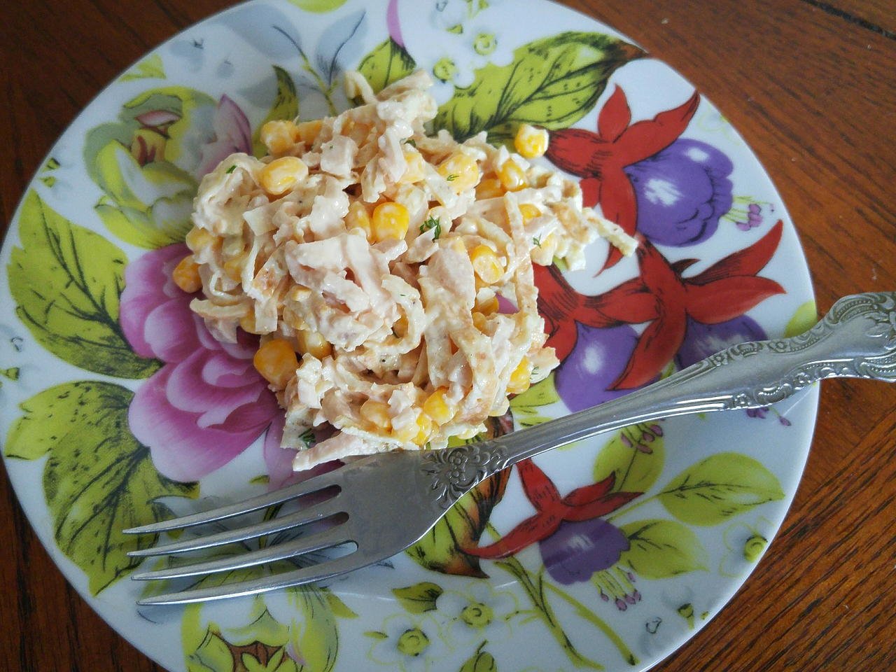 Салат с яичными блинчиками и копченой курицей и огурцом