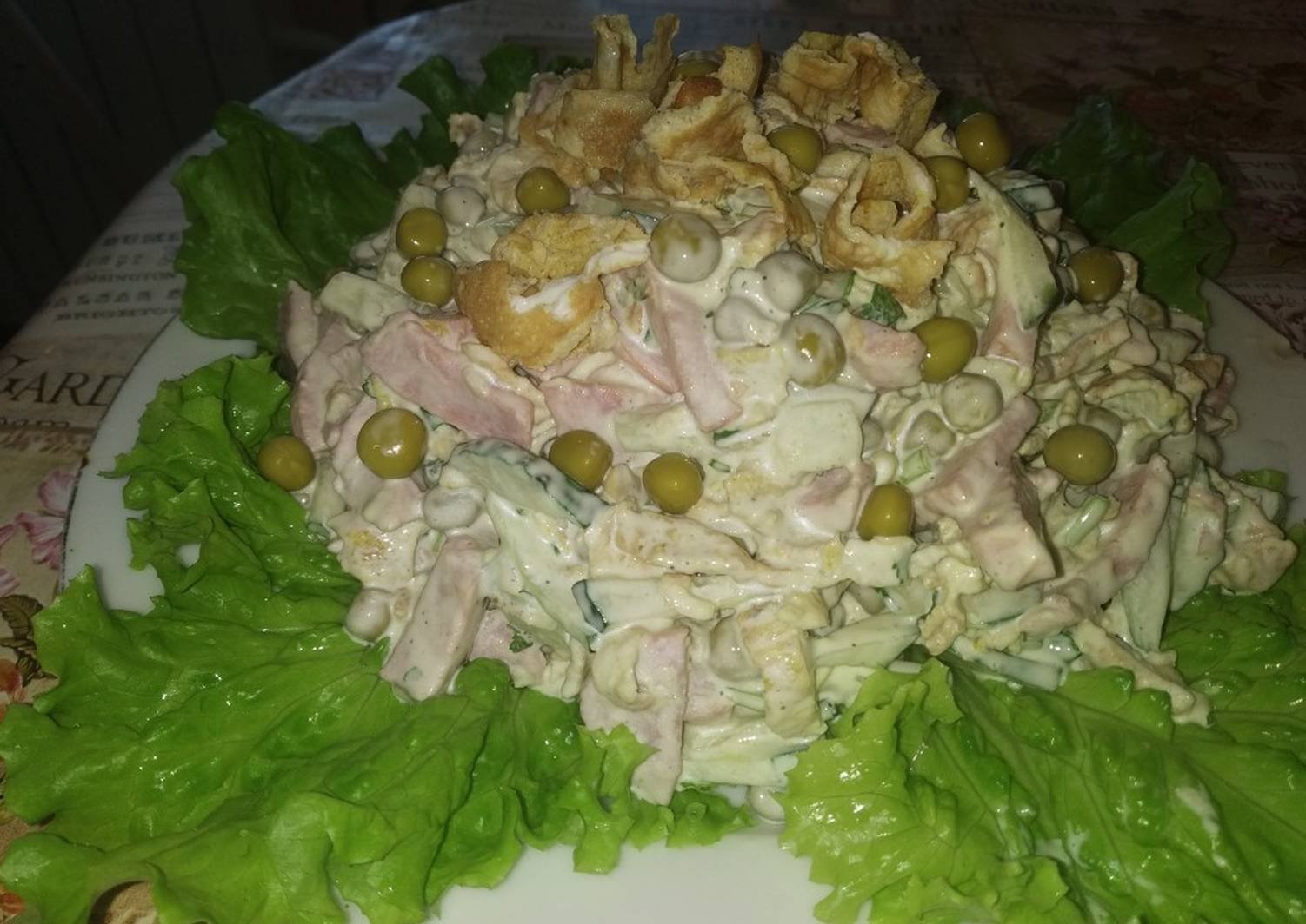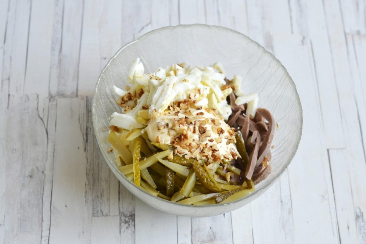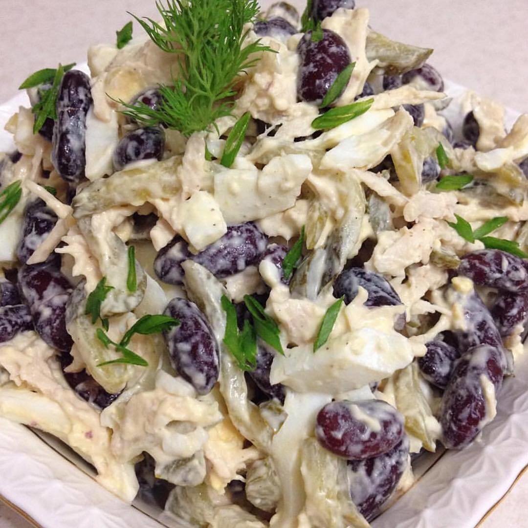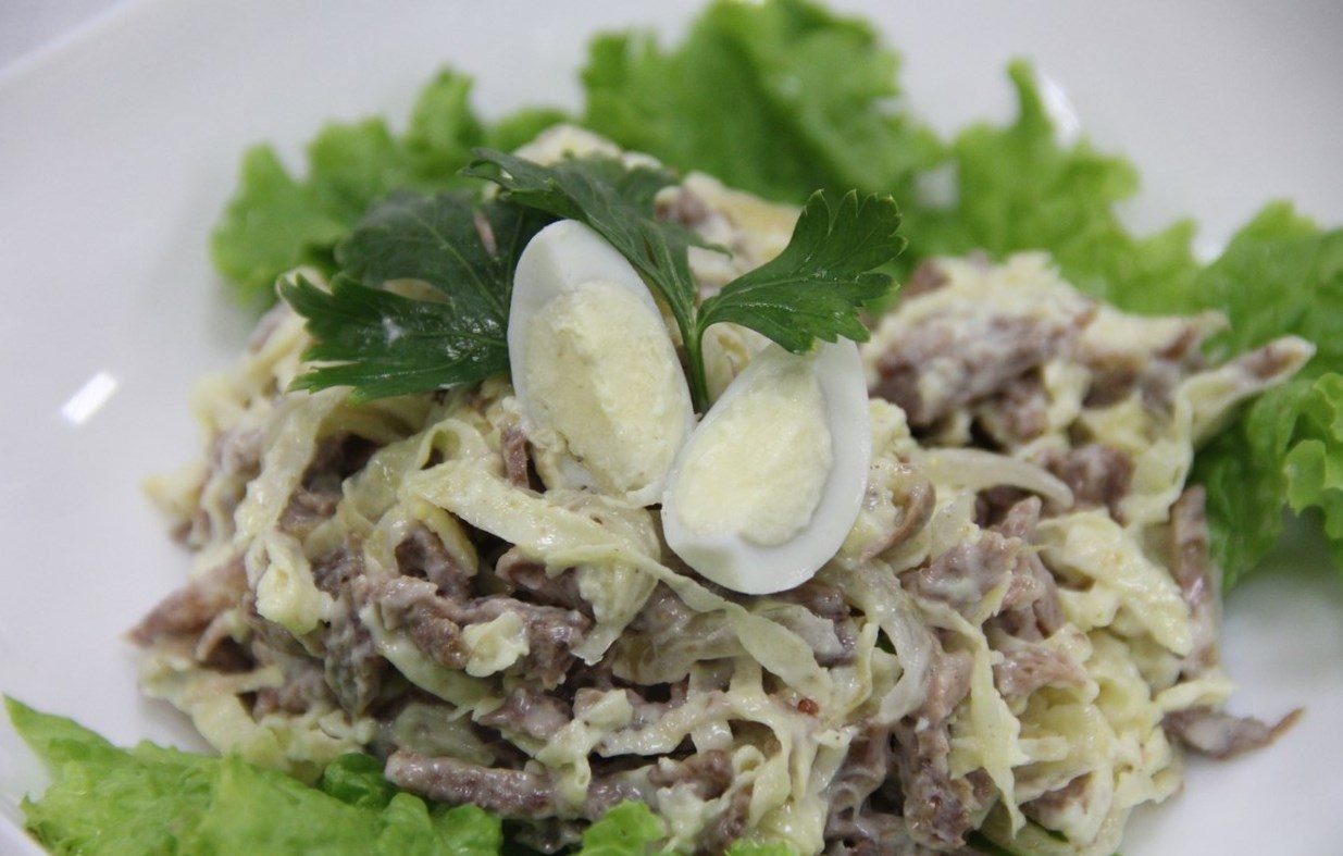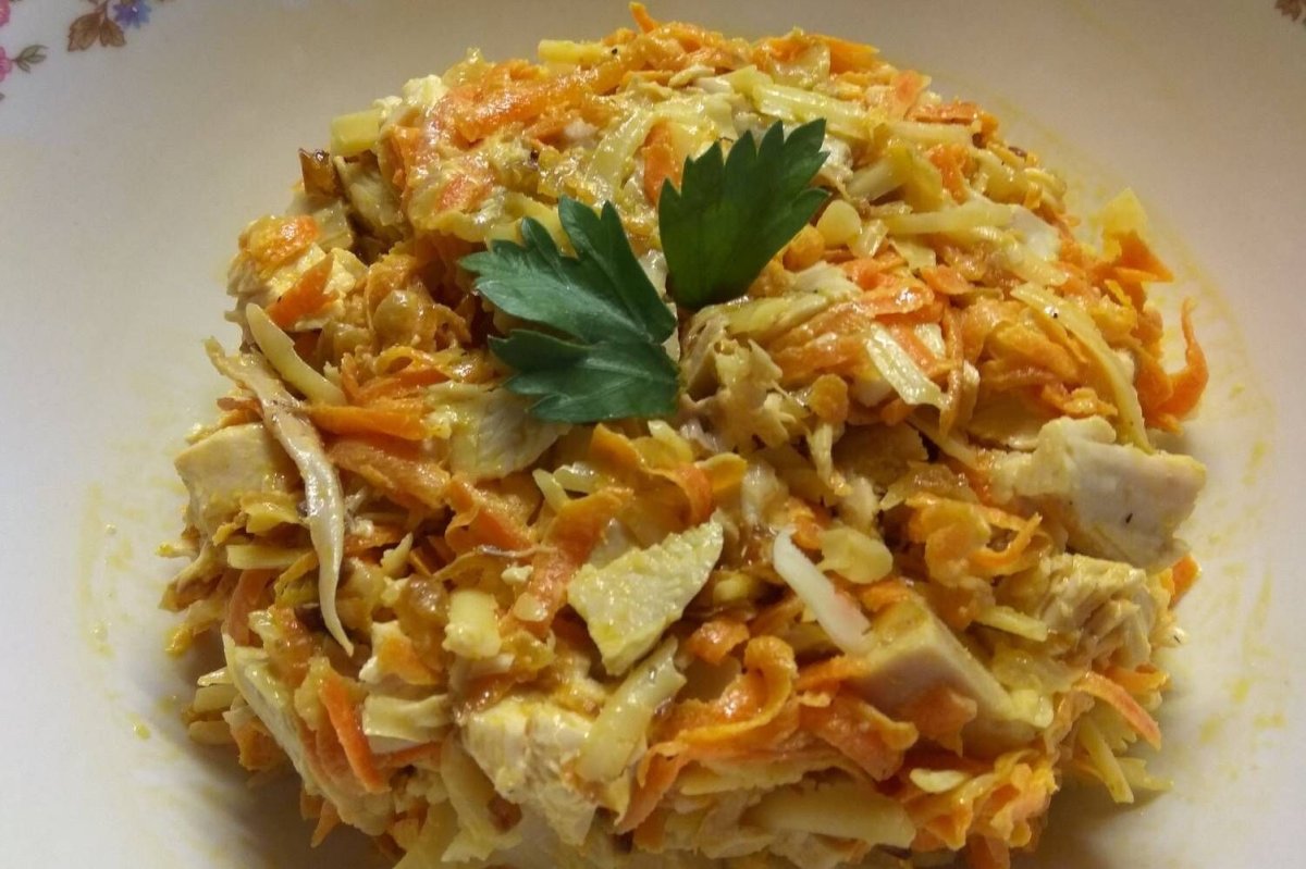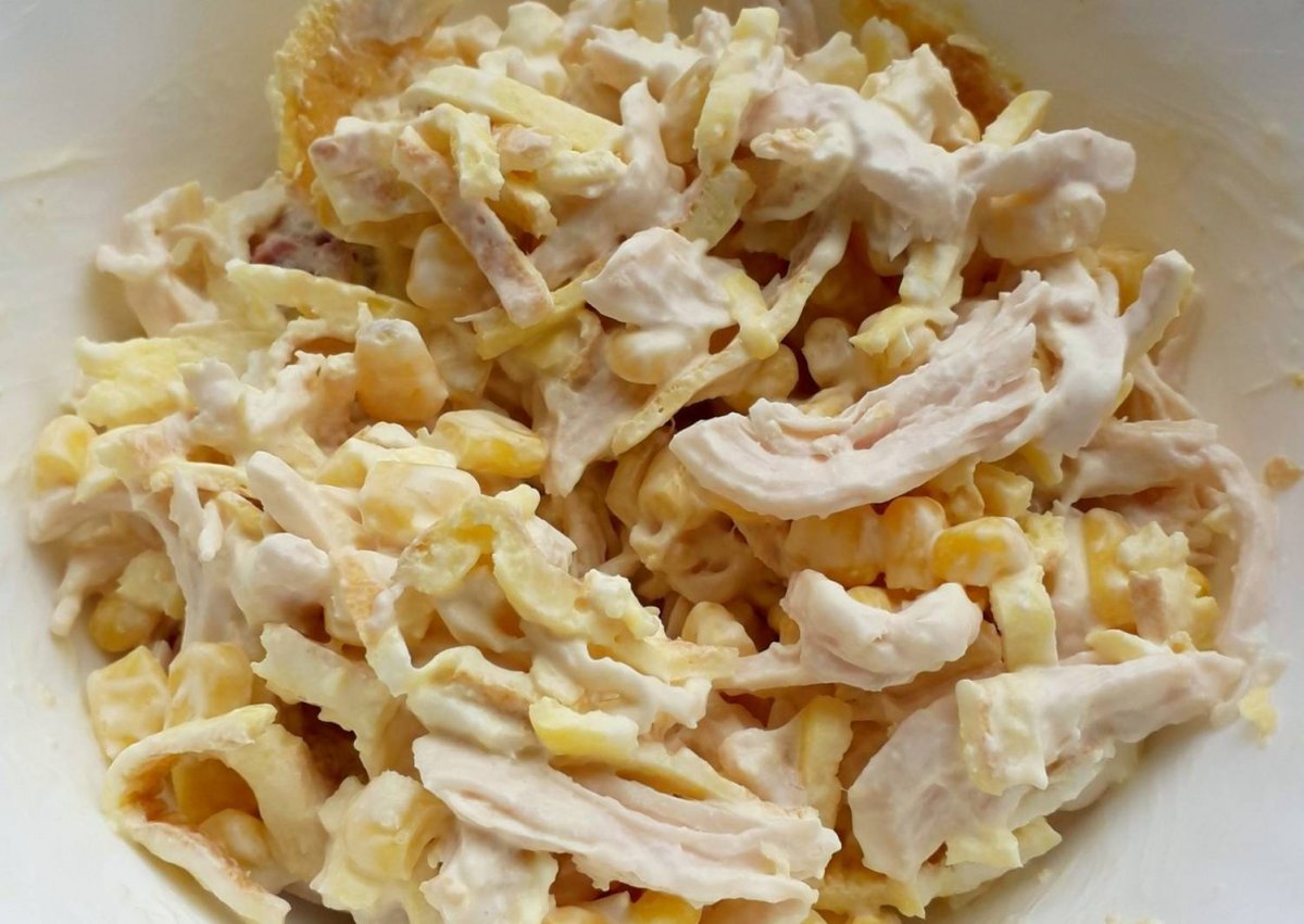 Салат с яичными блинчиками и копченой курицей и огурцом
