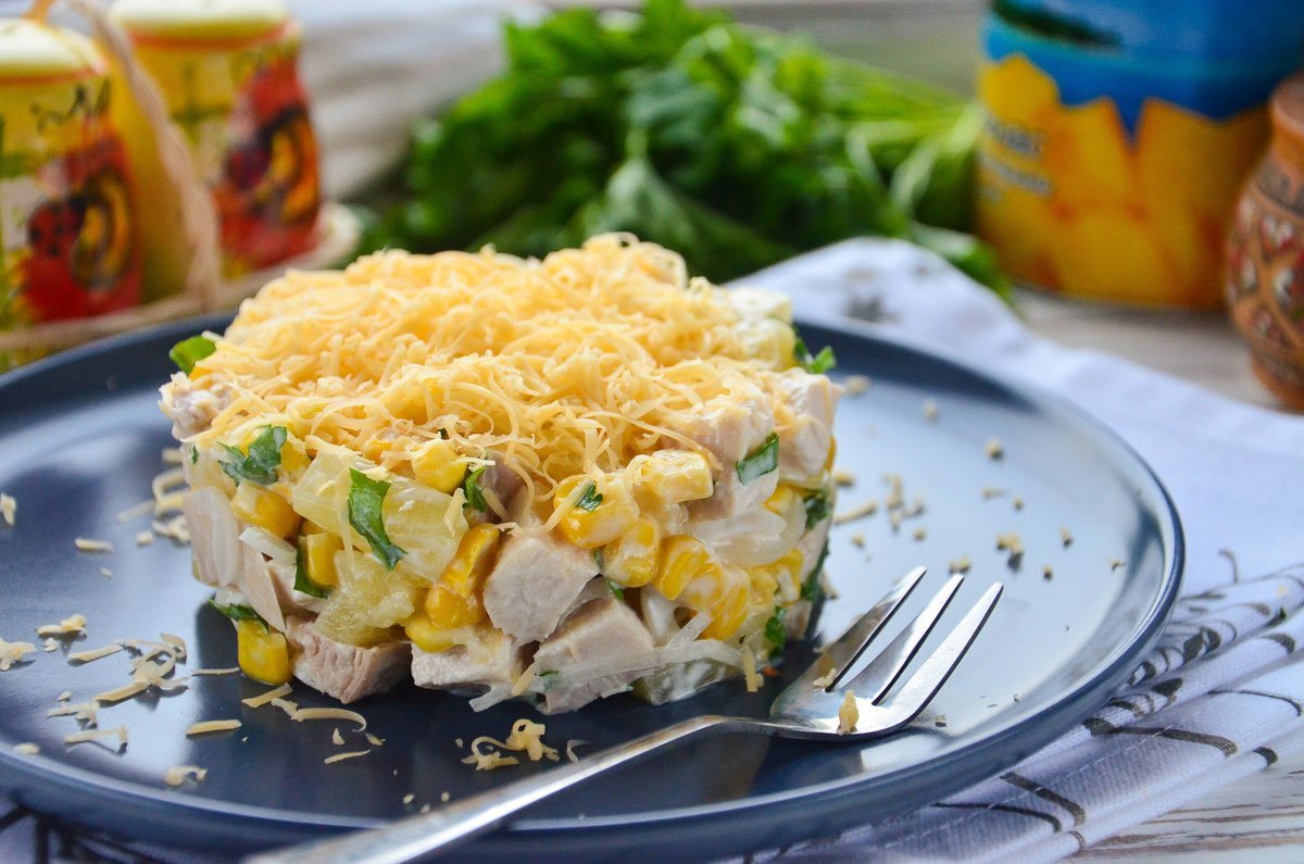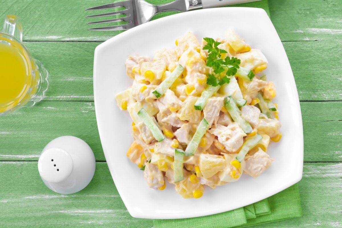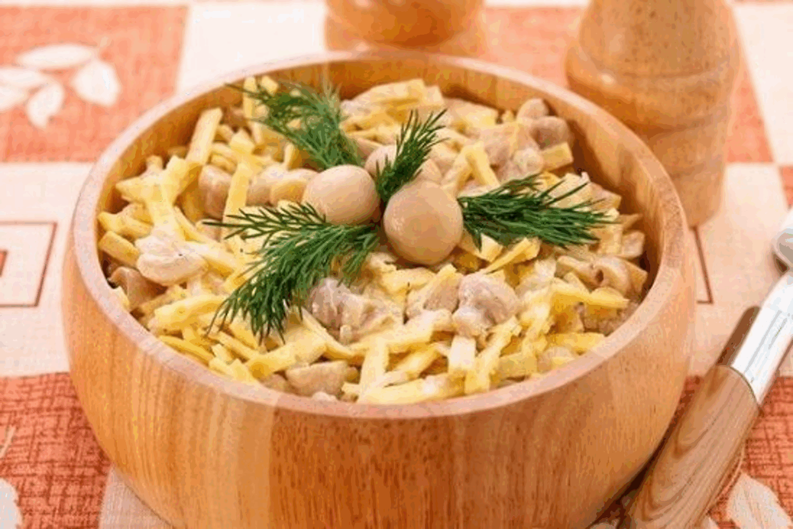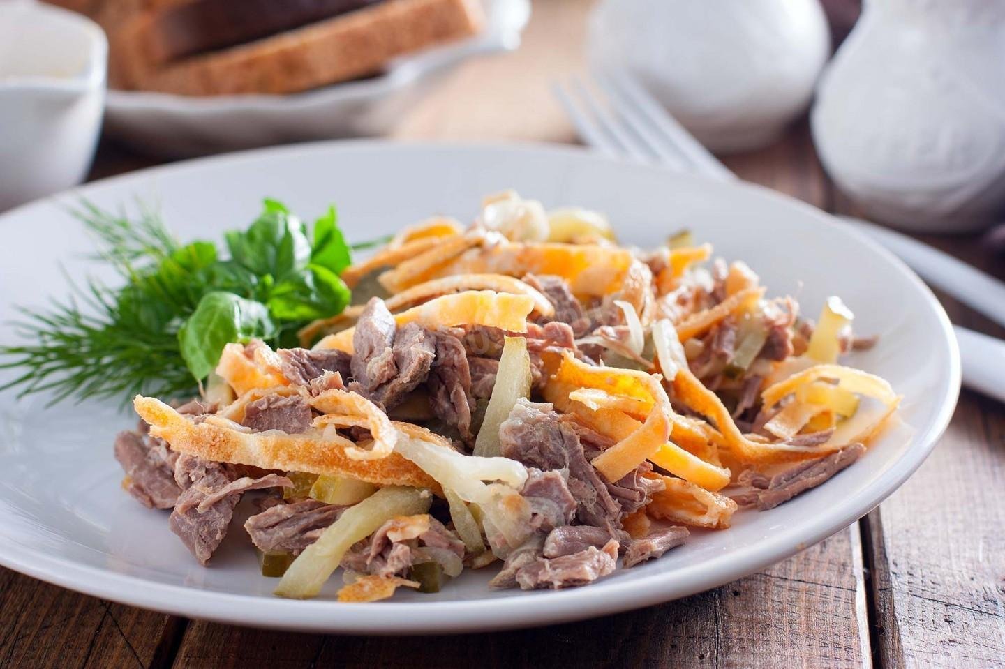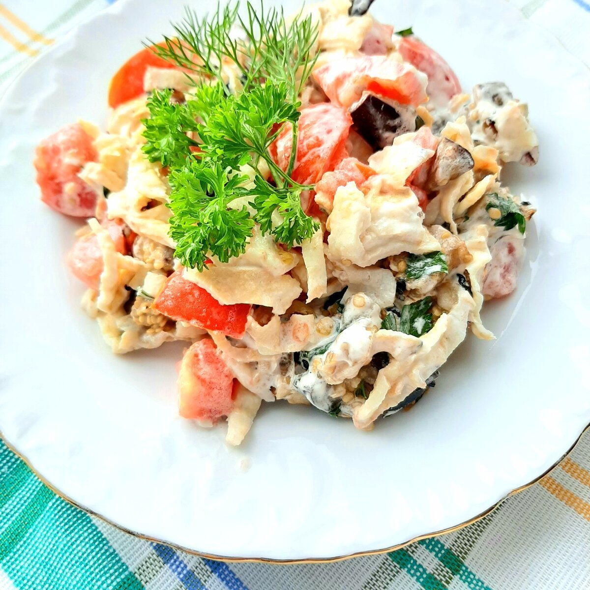 Салат с яичными блинчиками и копченой курицей и огурцом