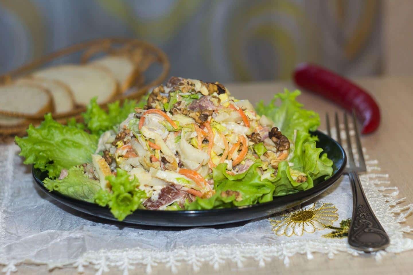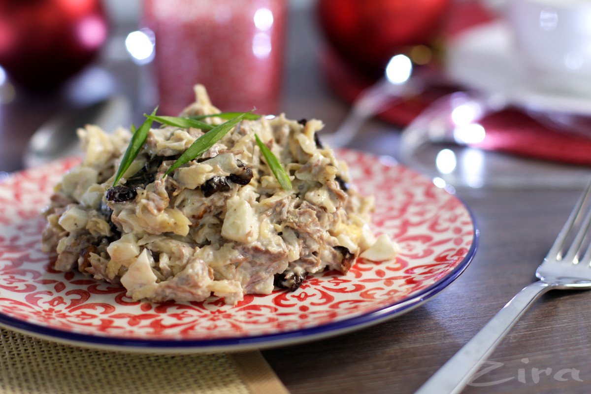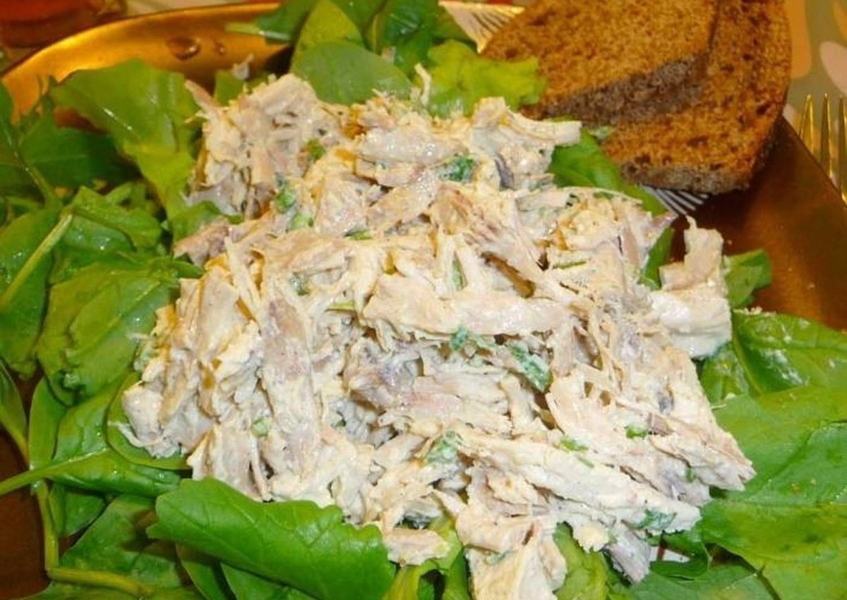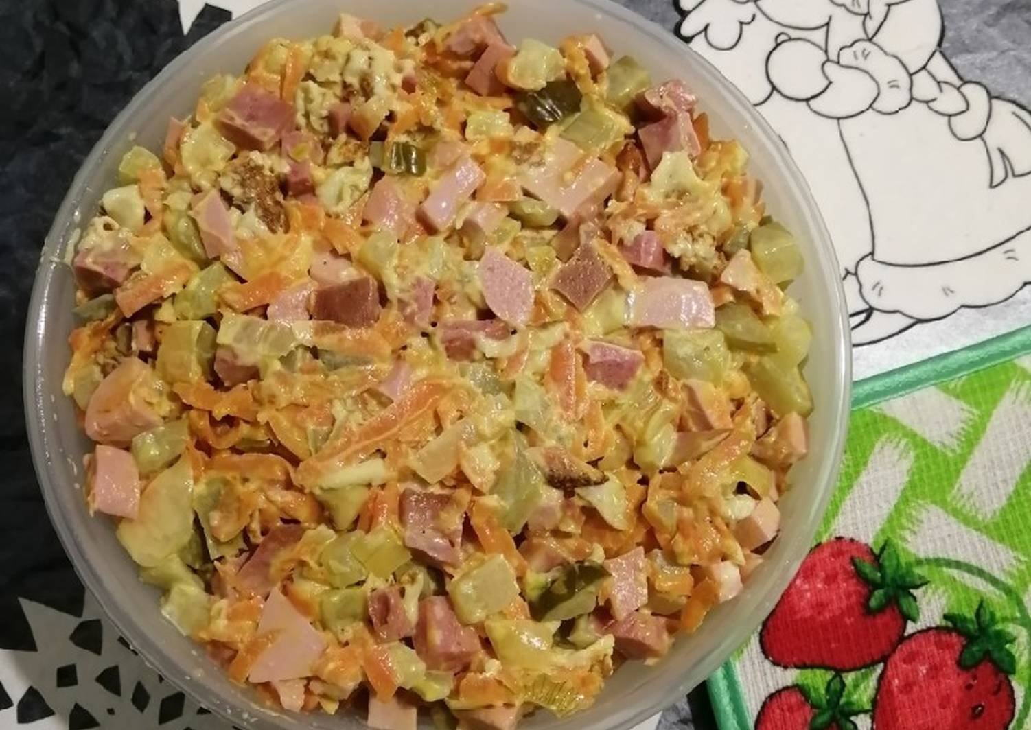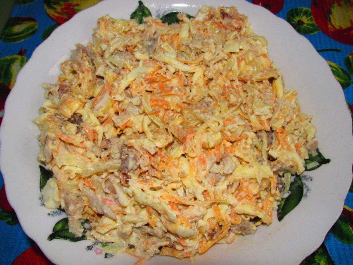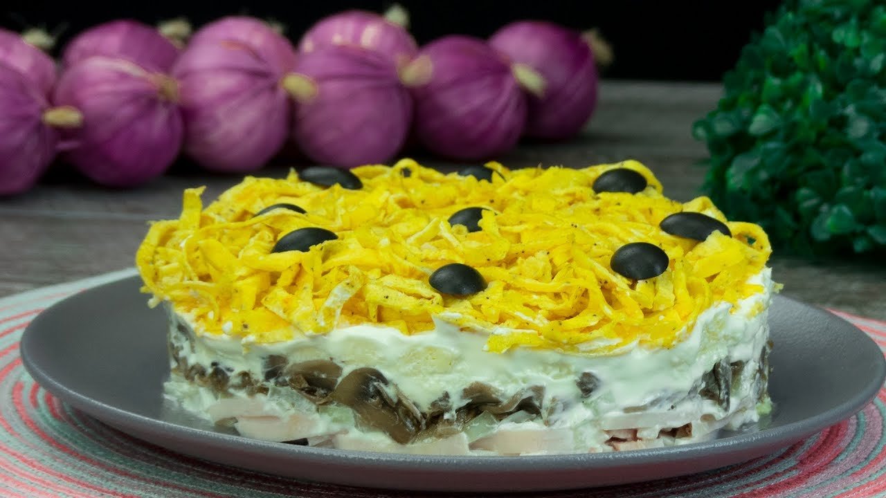 Салат с яичными блинчиками и копченой курицей и огурцом