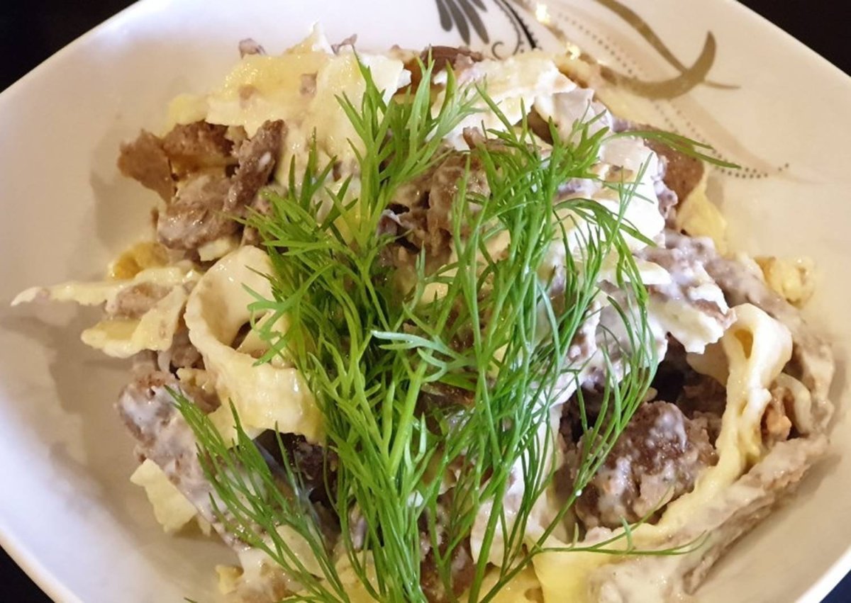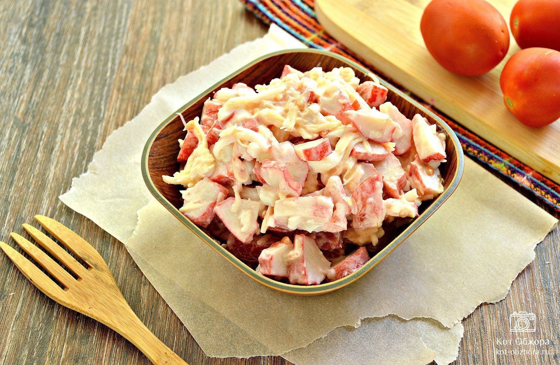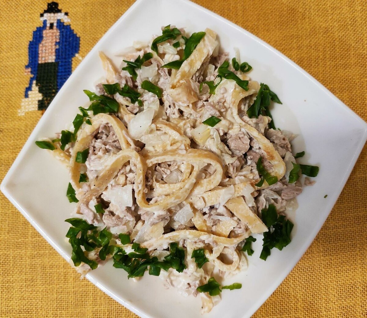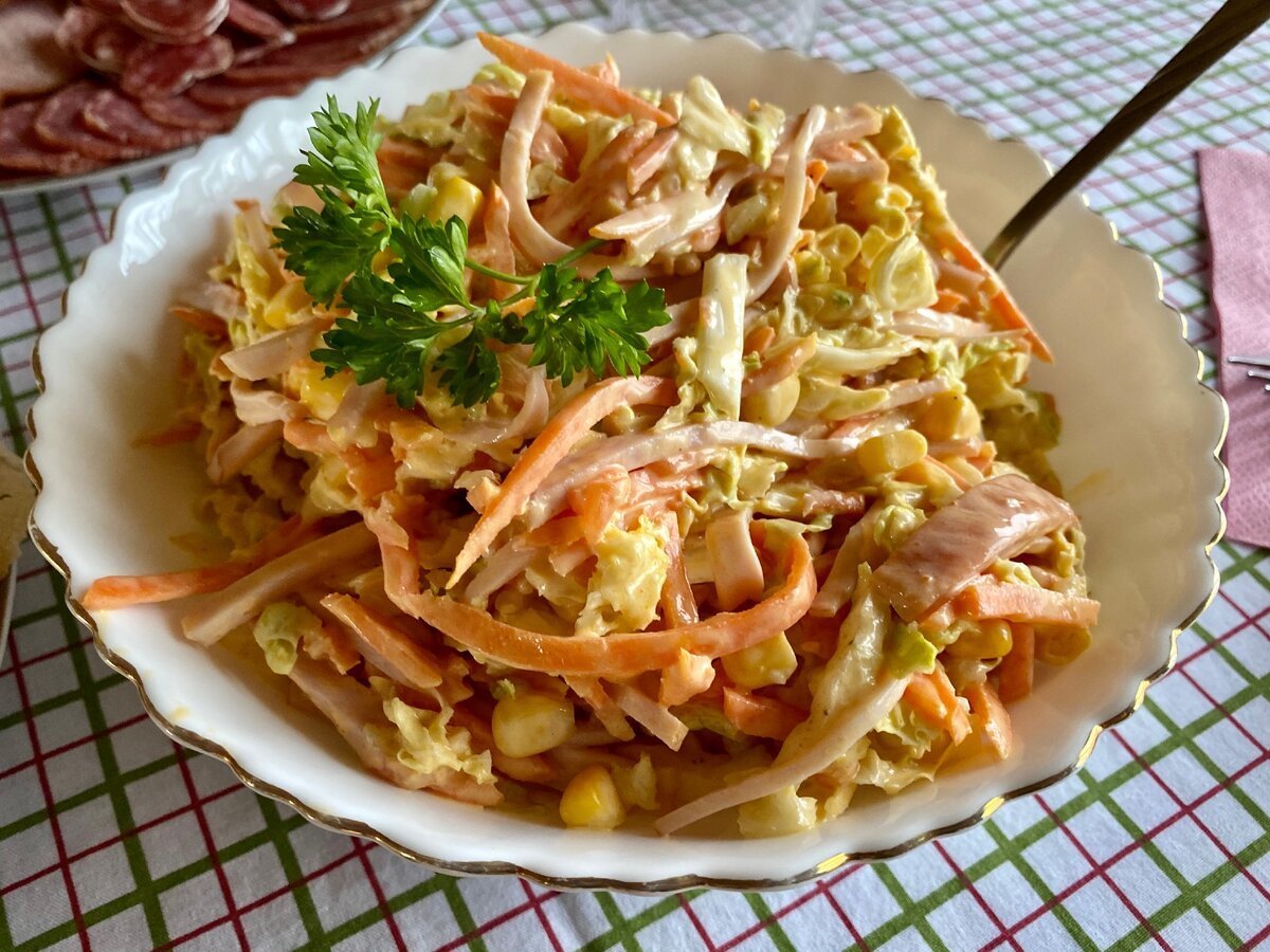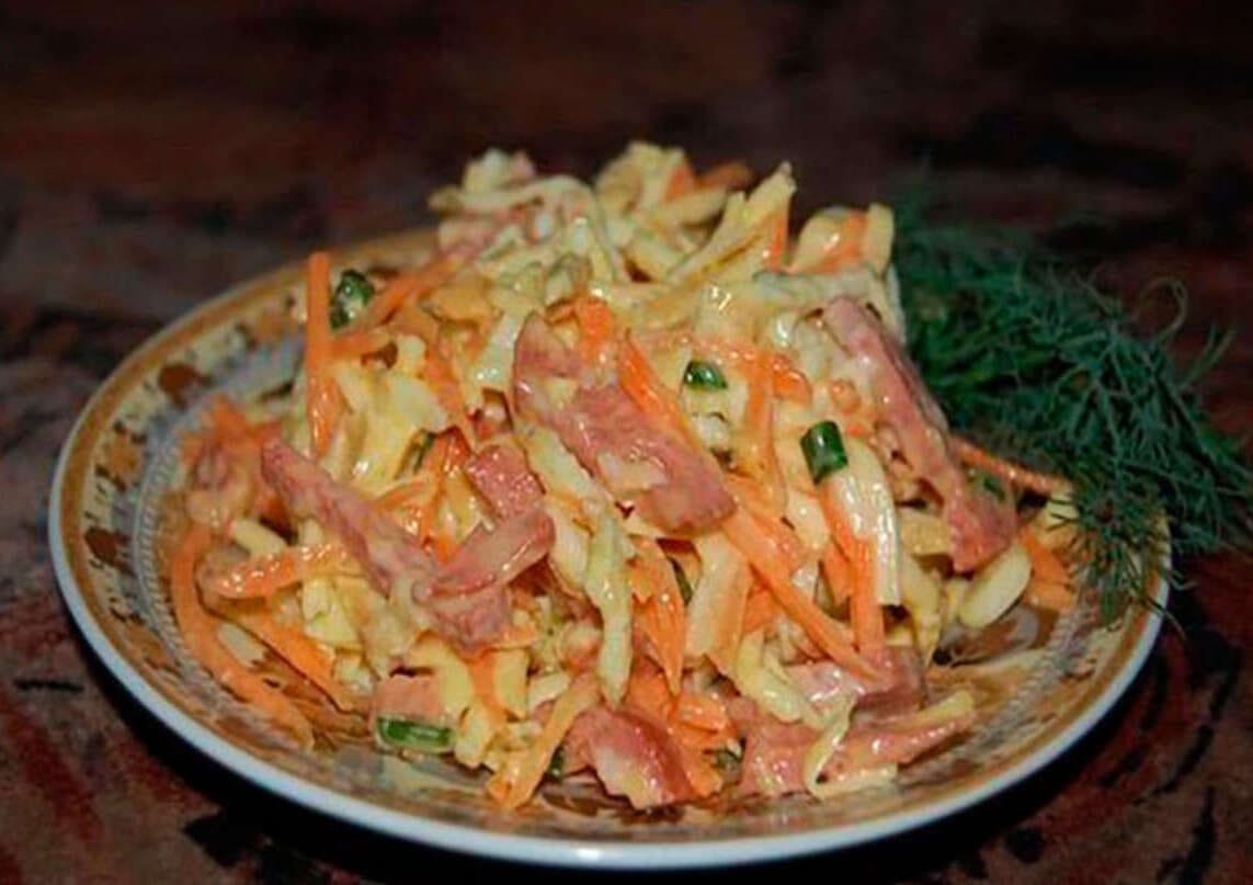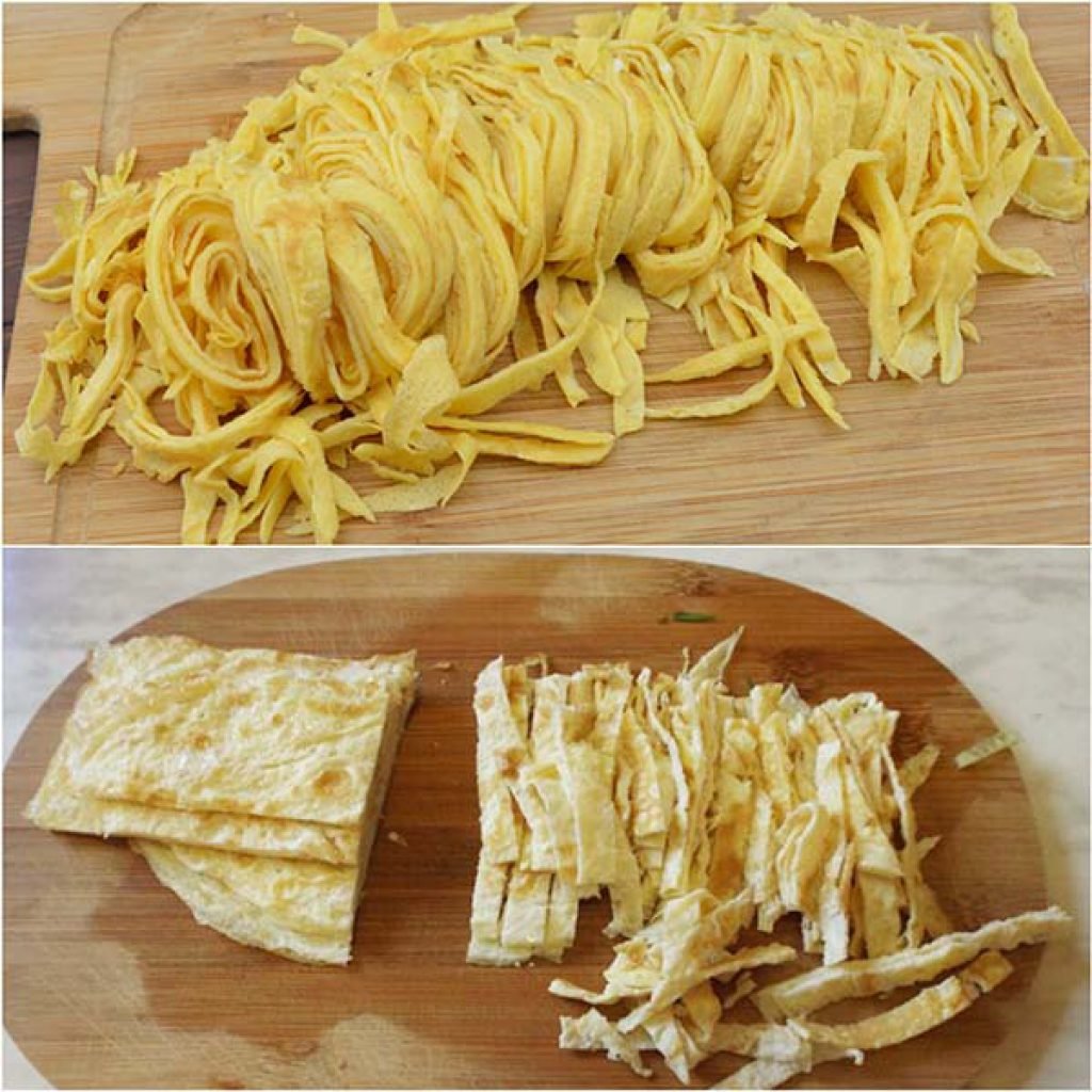 Салат с яичными блинчиками и копченой курицей и огурцом