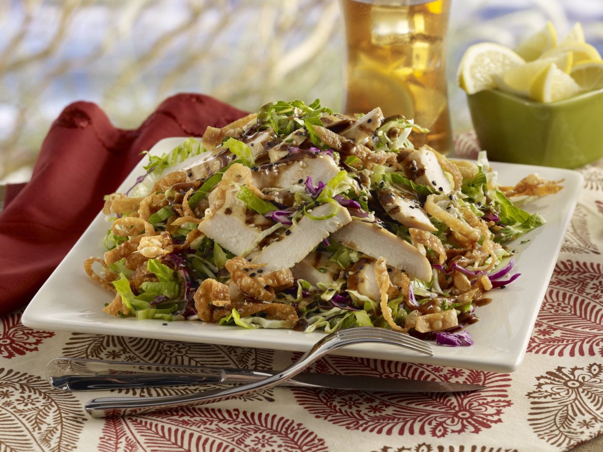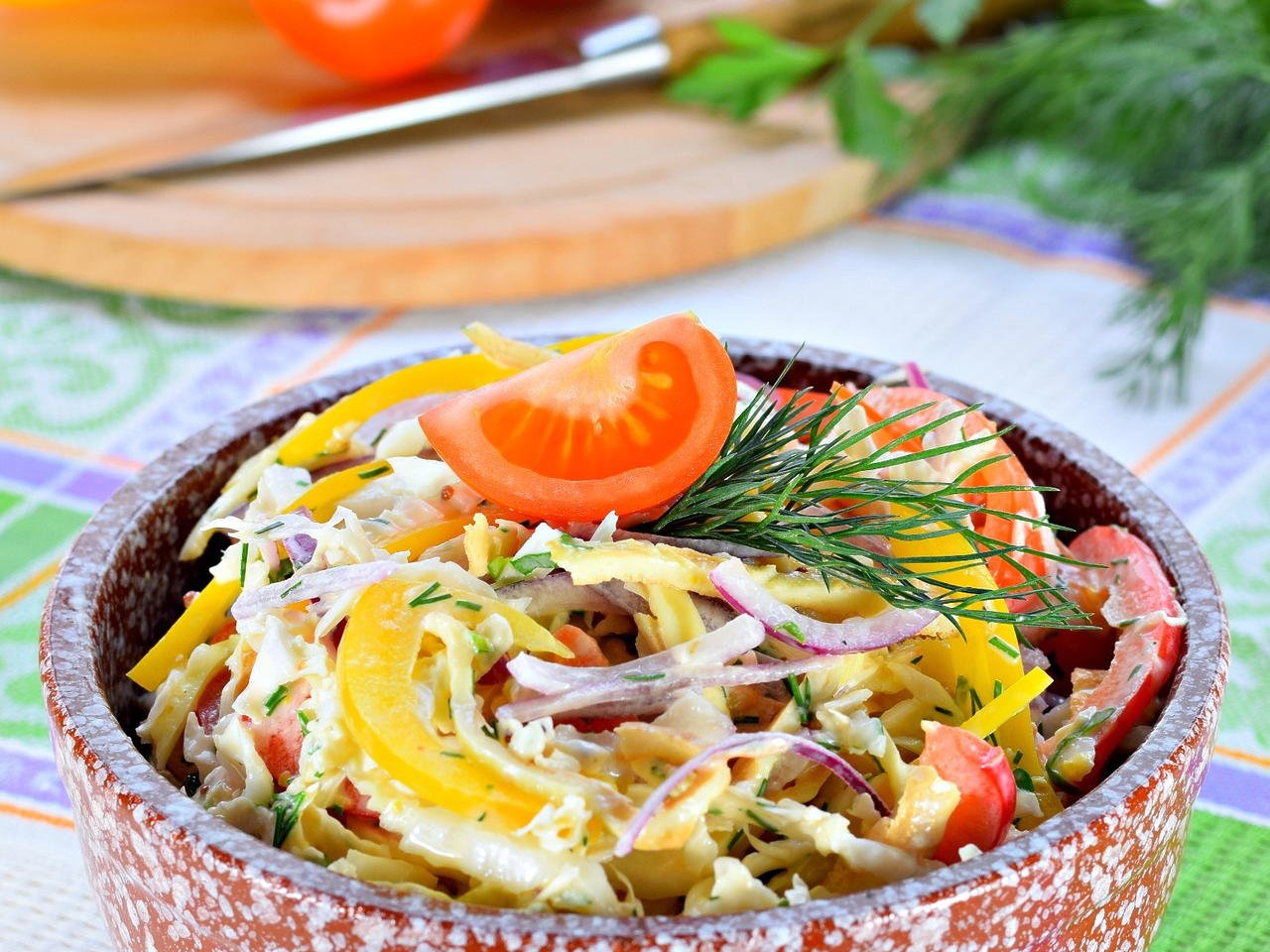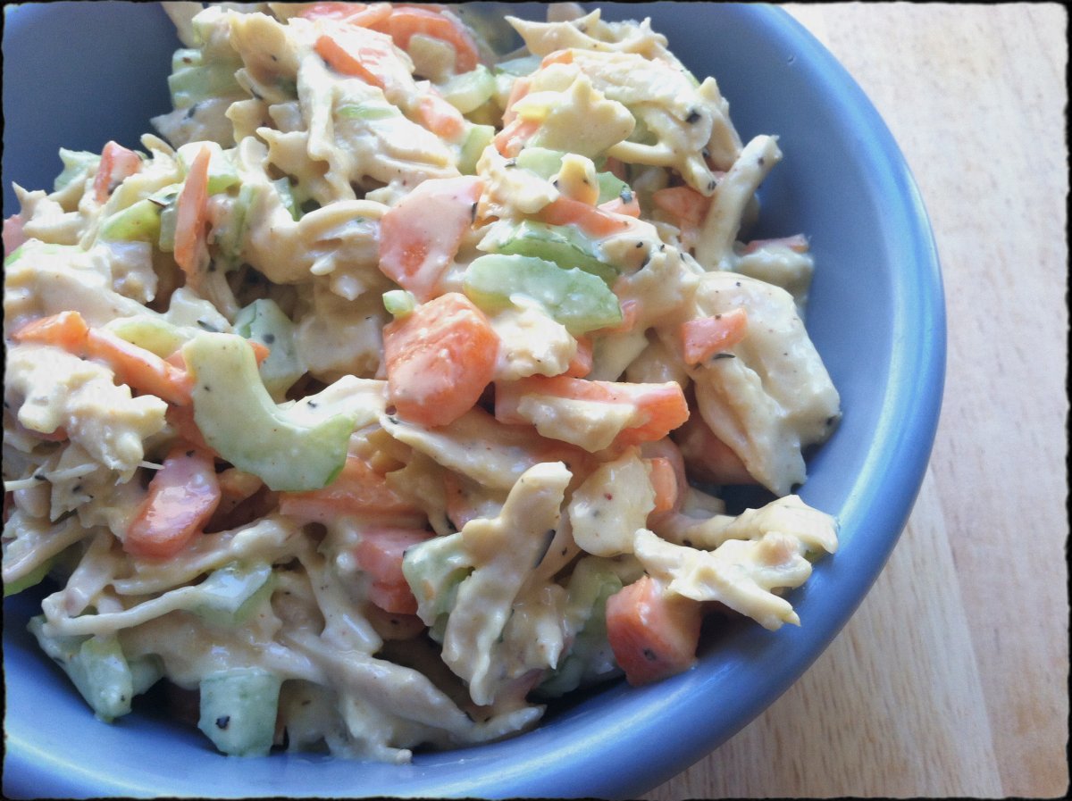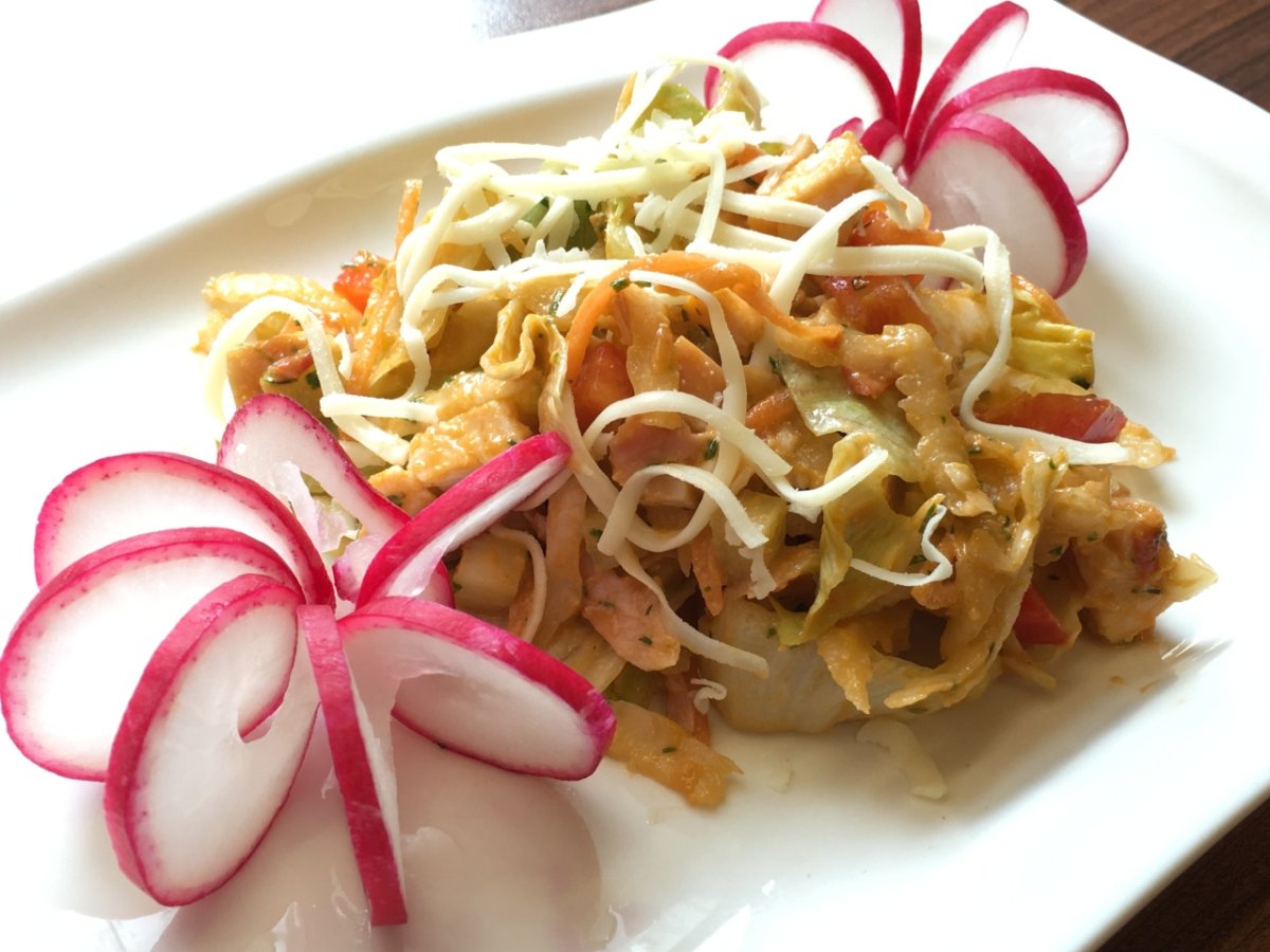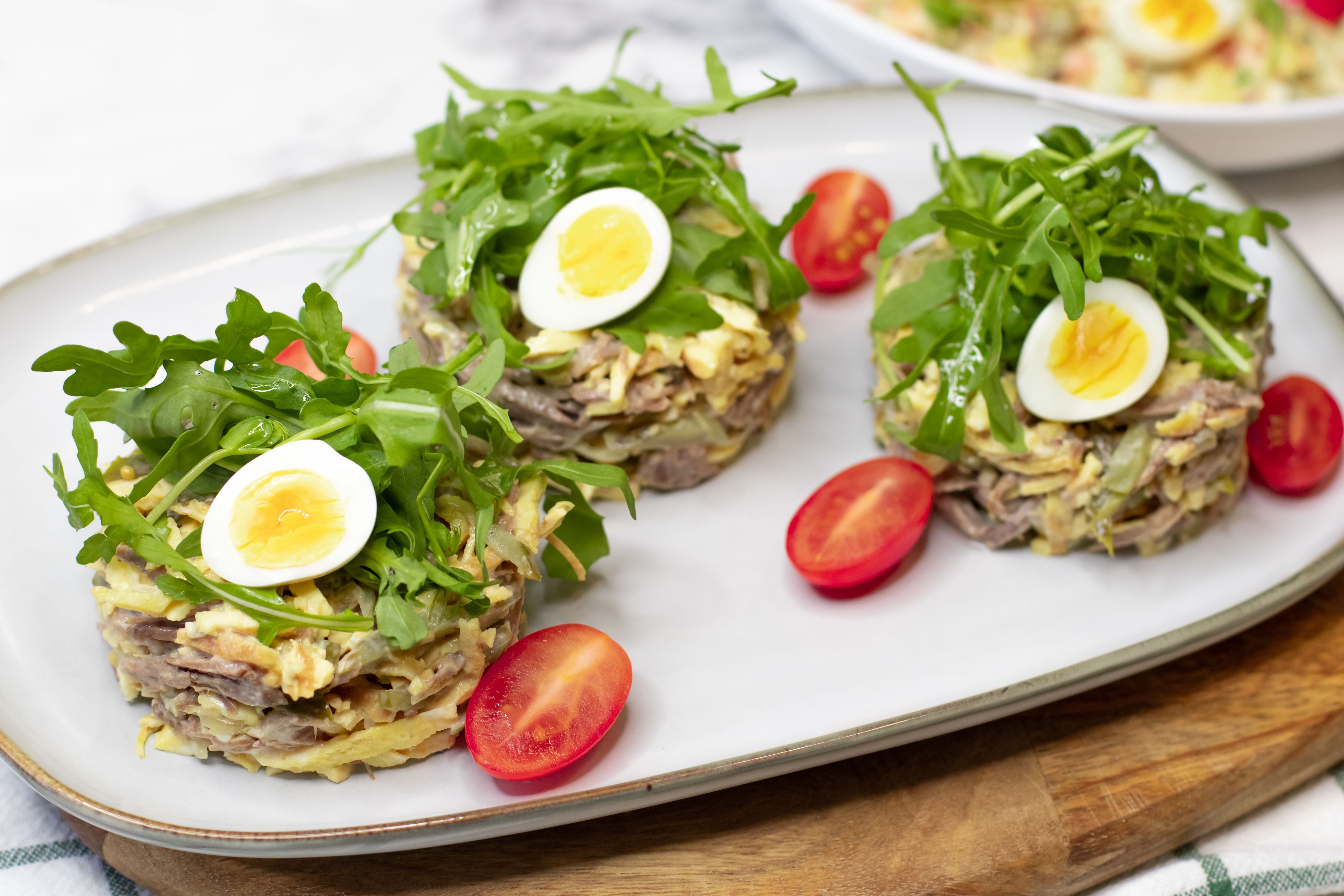 Салат с яичными блинчиками и копченой курицей и огурцом