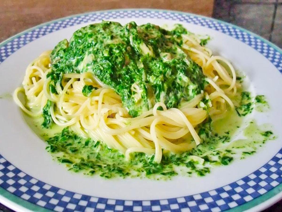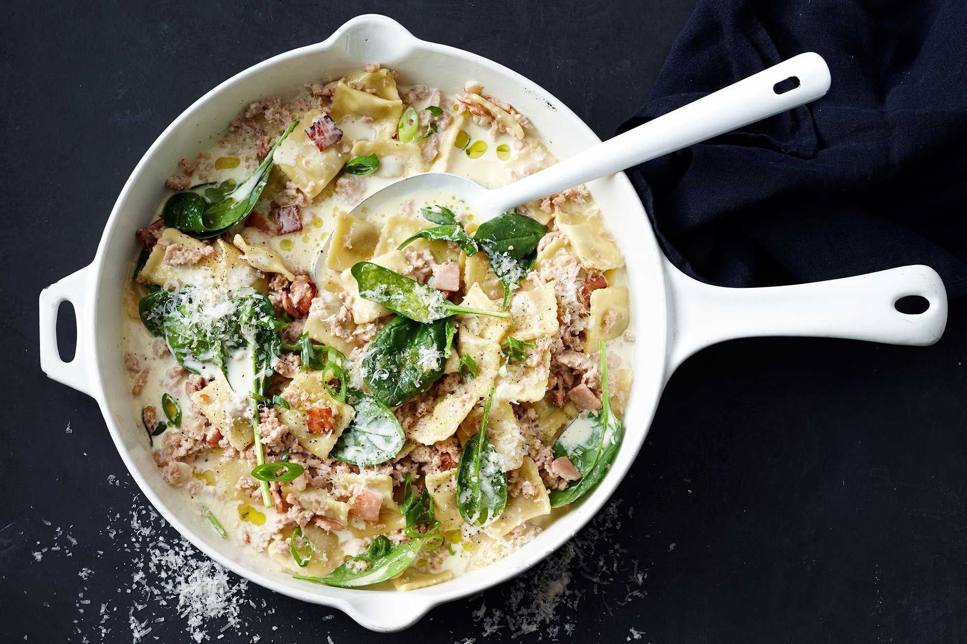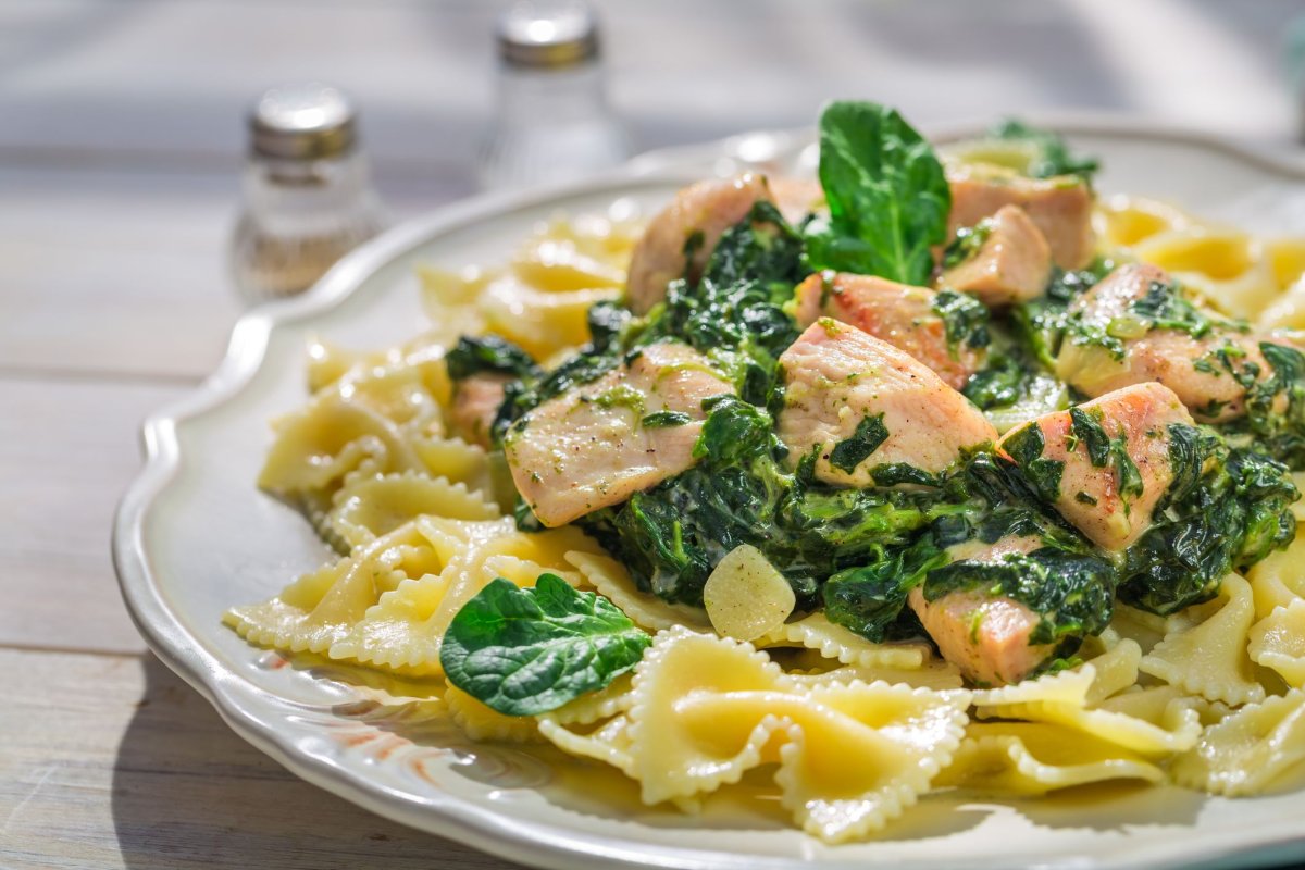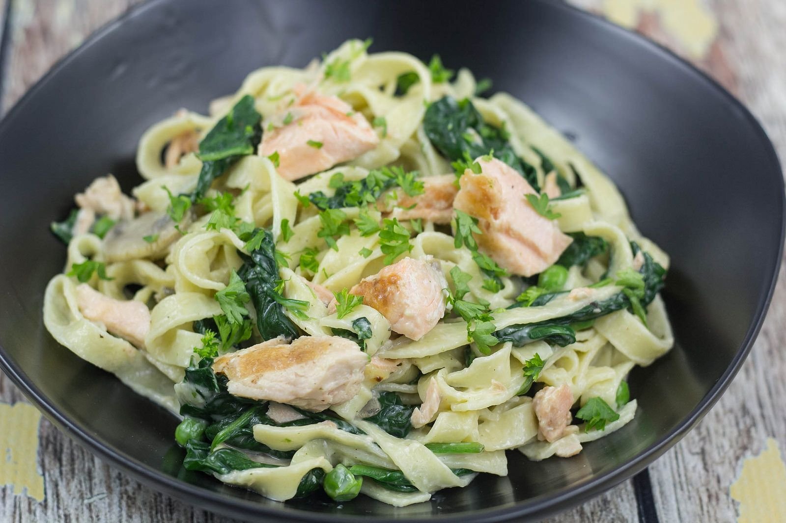 Паста с красной рыбой и шпинатом в сливочном соусе