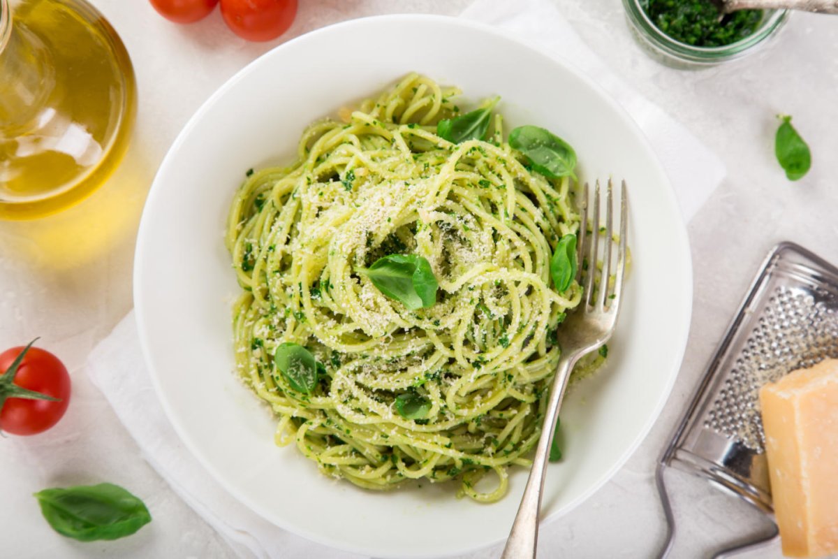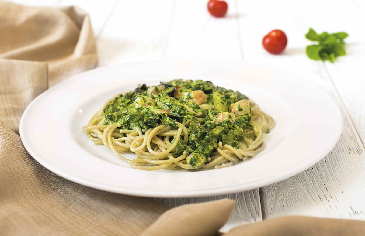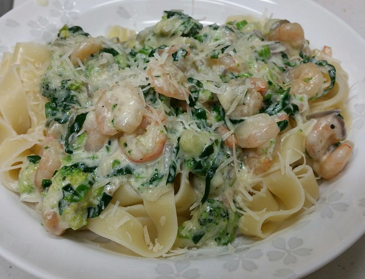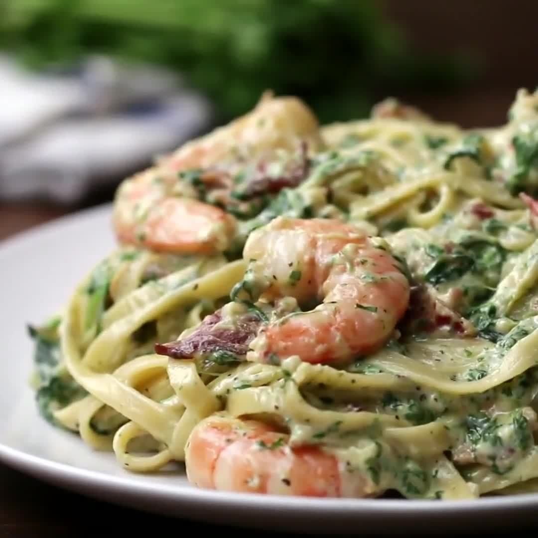 Фарфалле паста с креветками в сливочном соусе со шпинатом