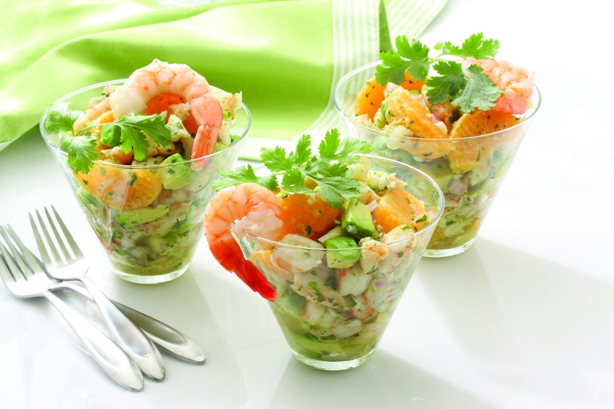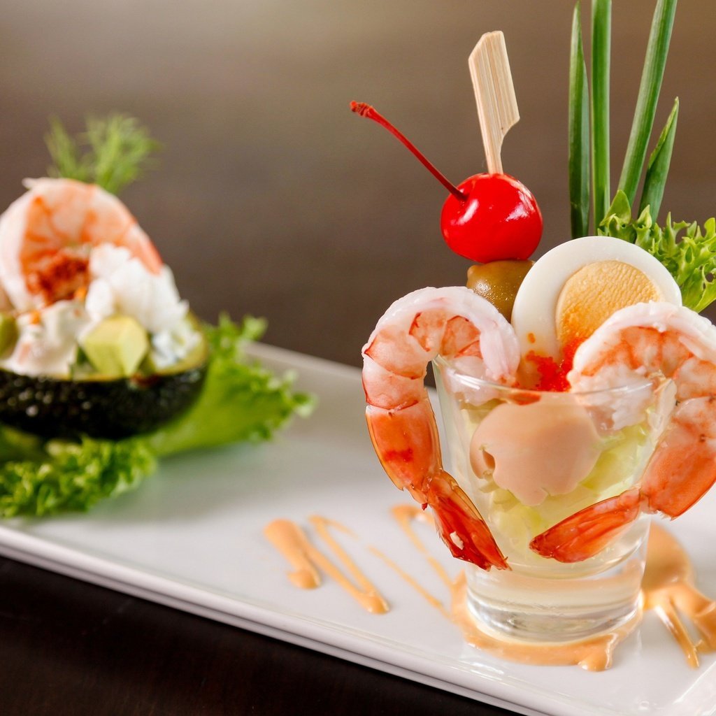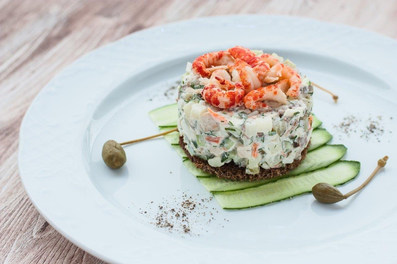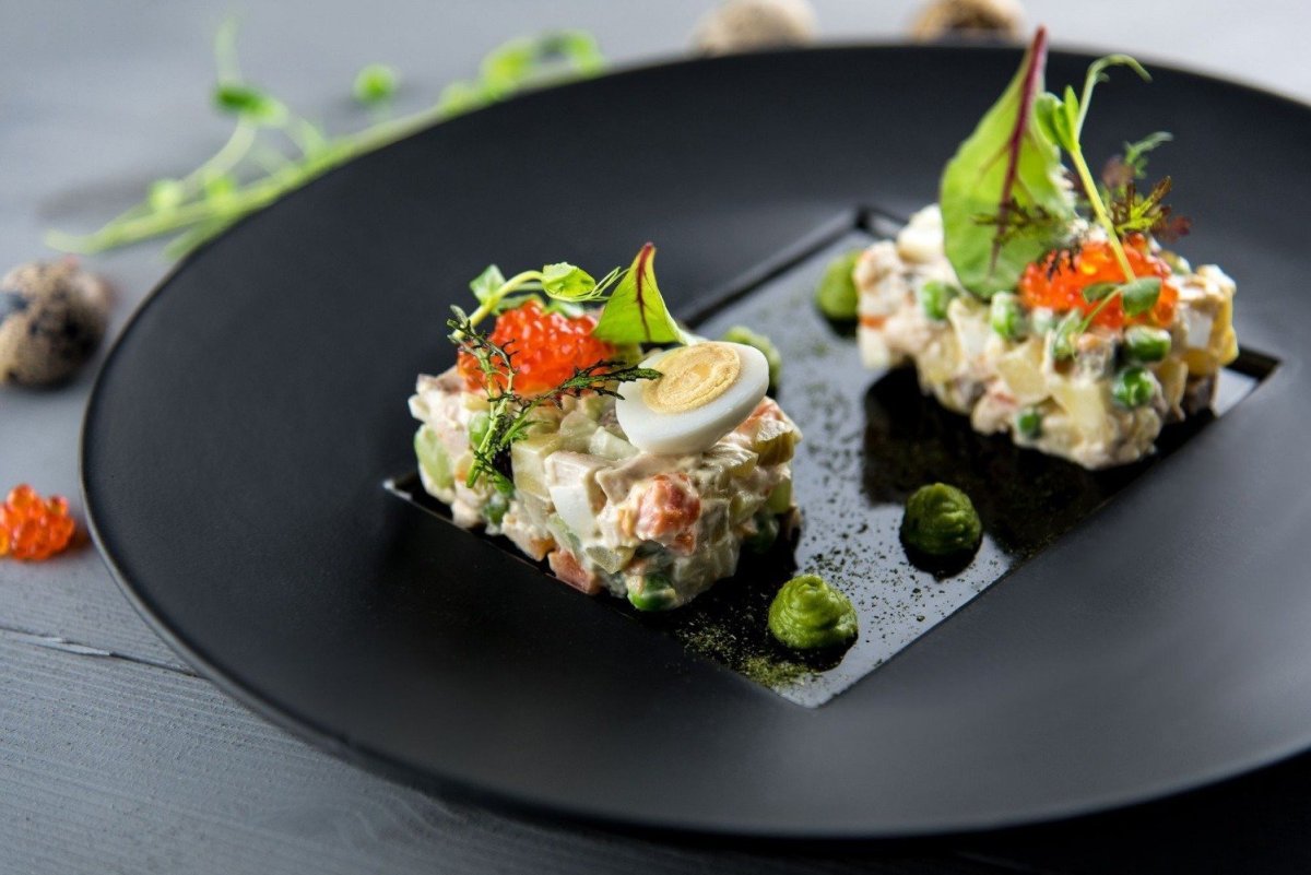 Ресторанная подача Оливье с тигровой креветкой