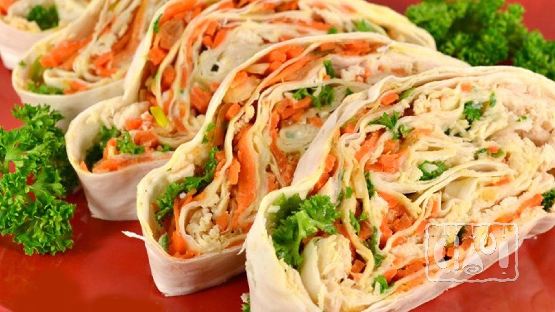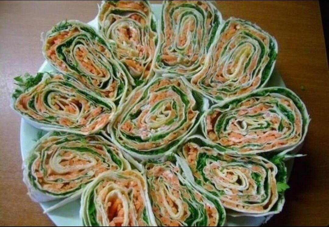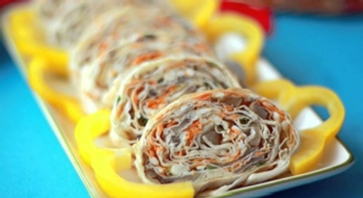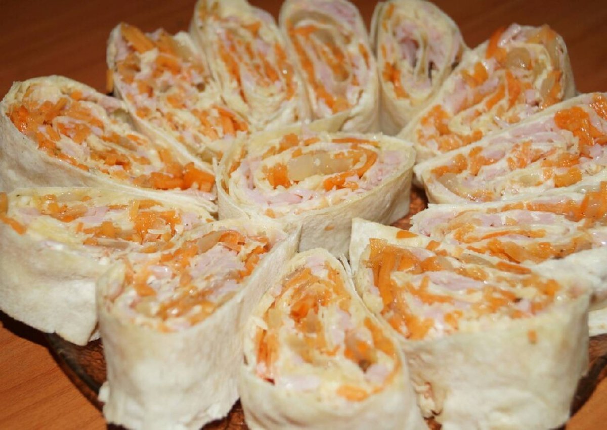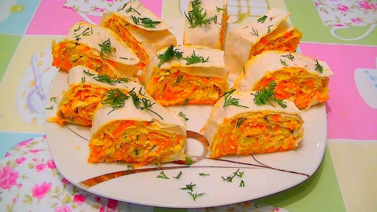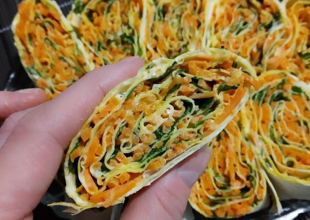 Рулет из лаваша с корейской морковью и сыром и зеленью