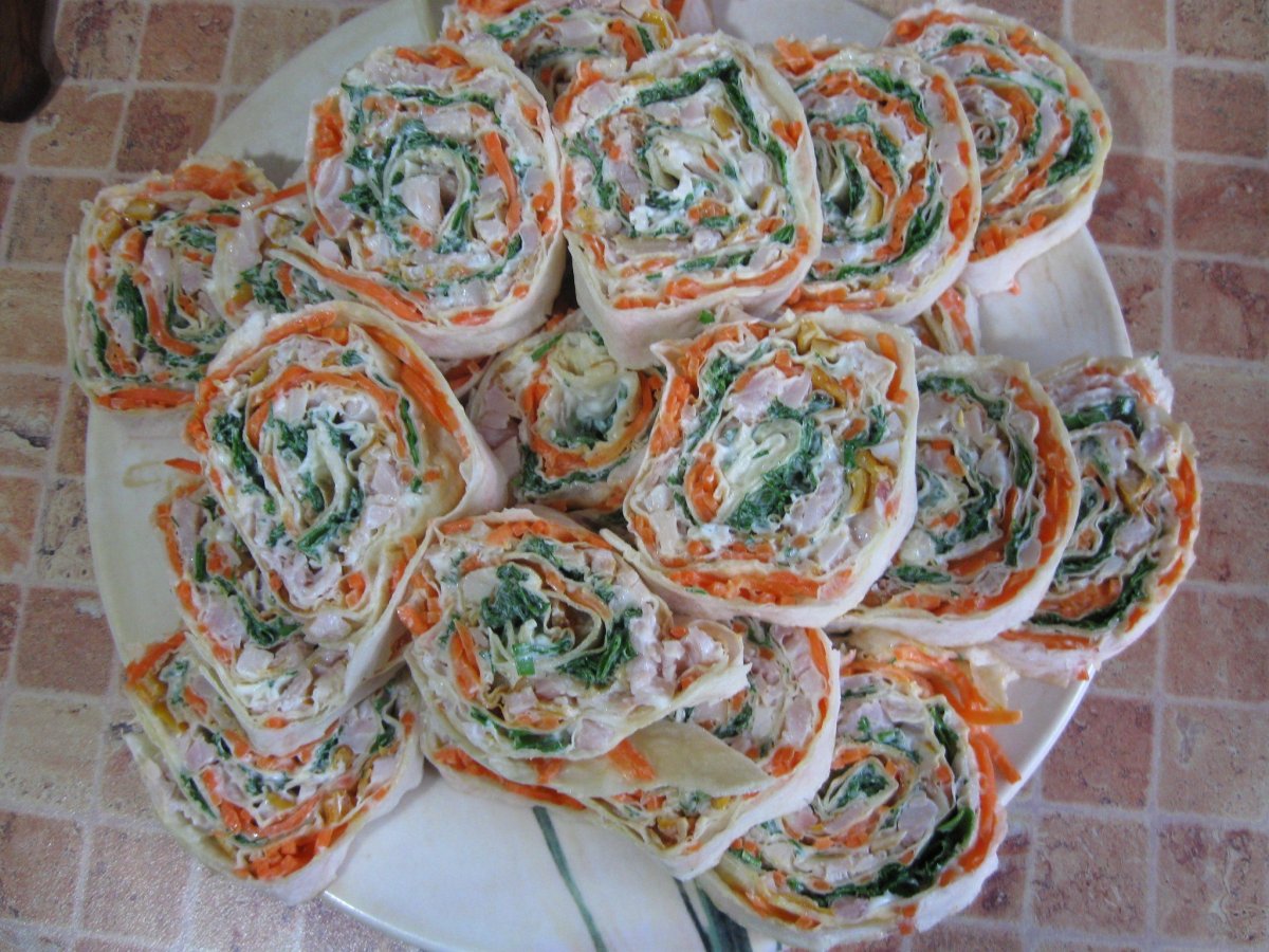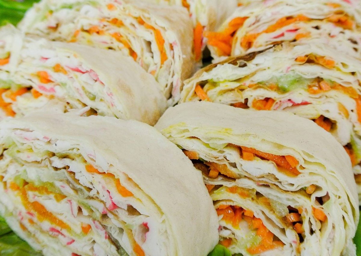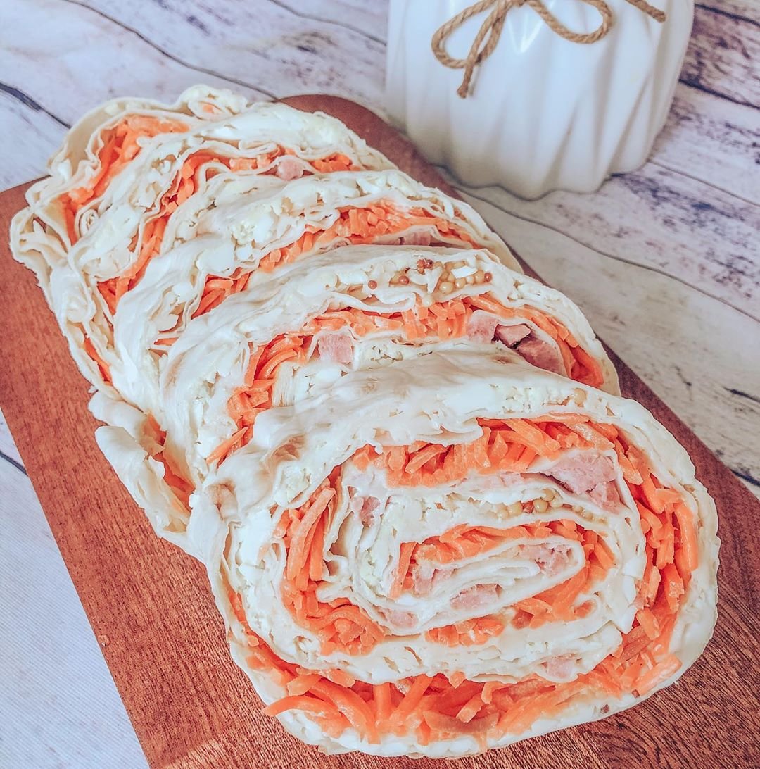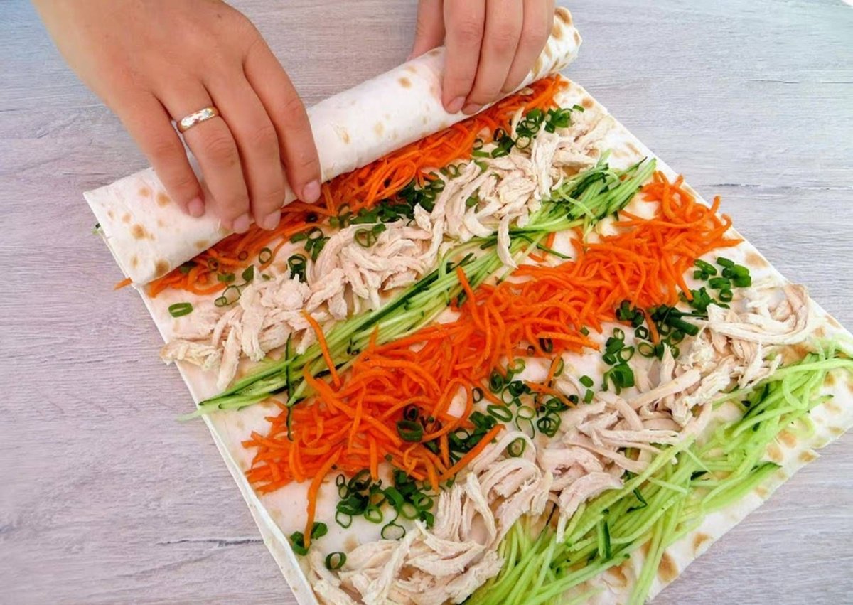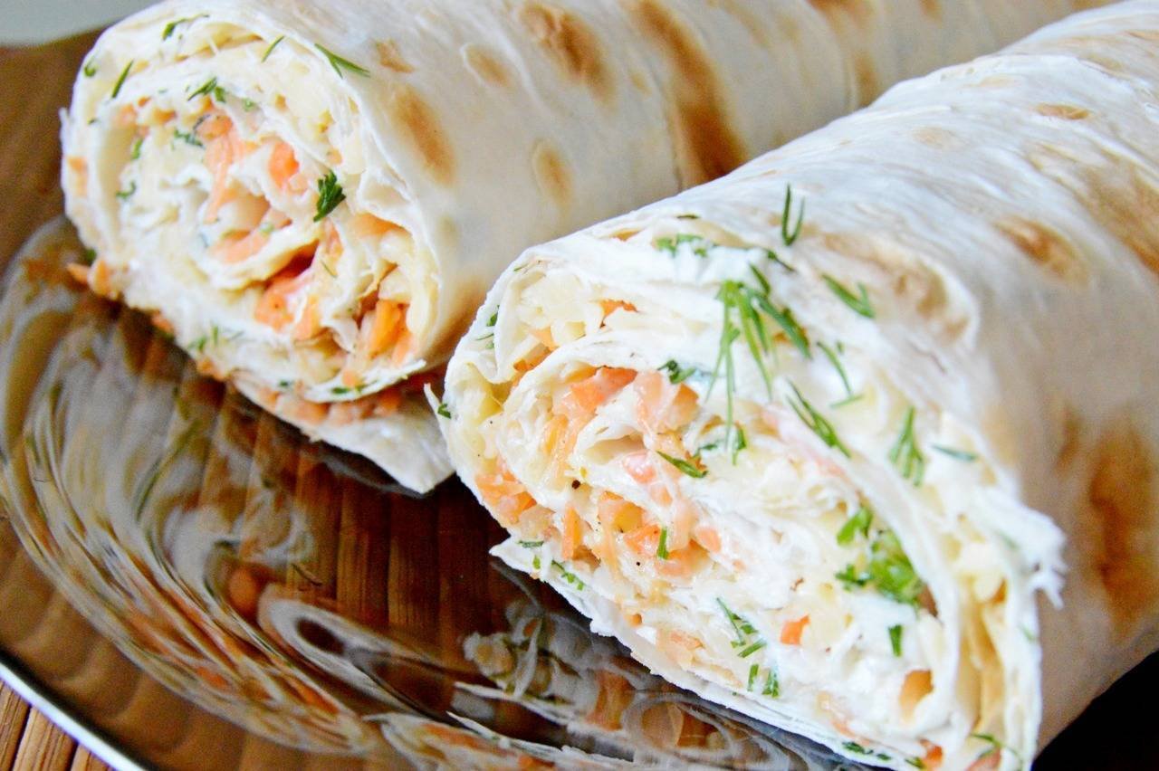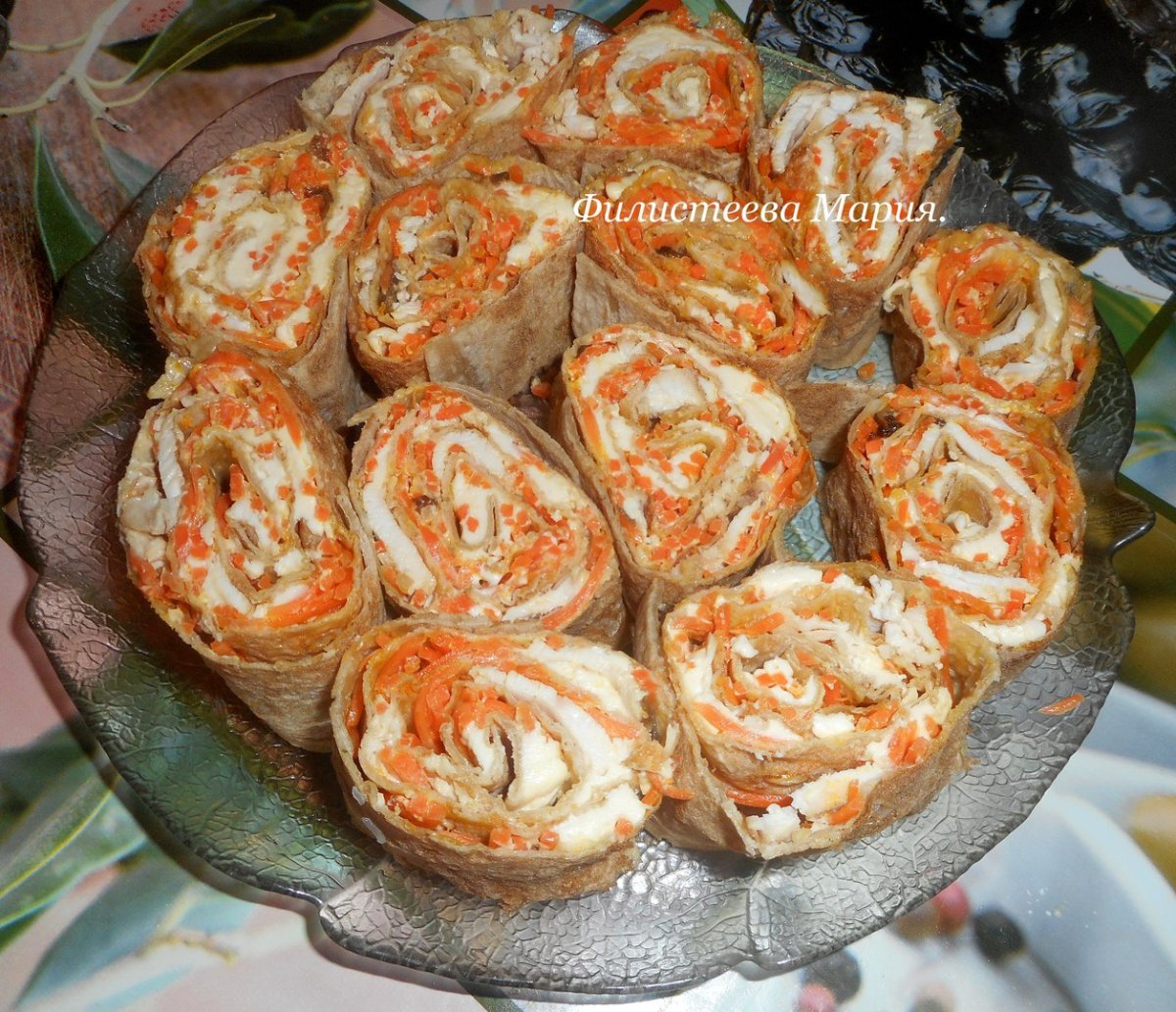 Рулет из лаваша с корейской морковью и сыром и зеленью