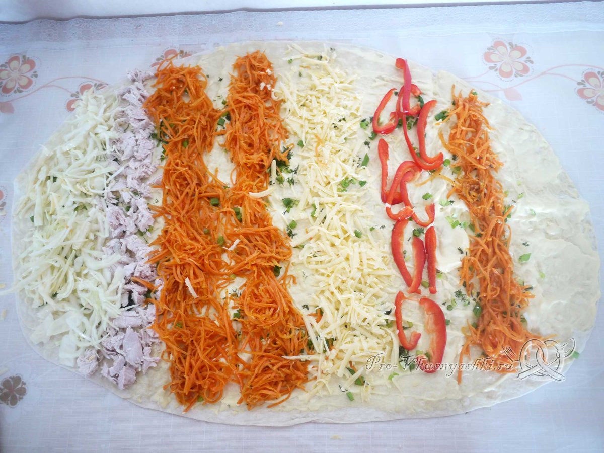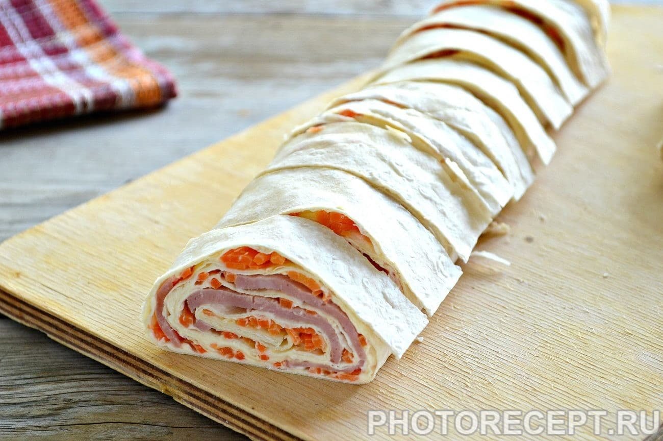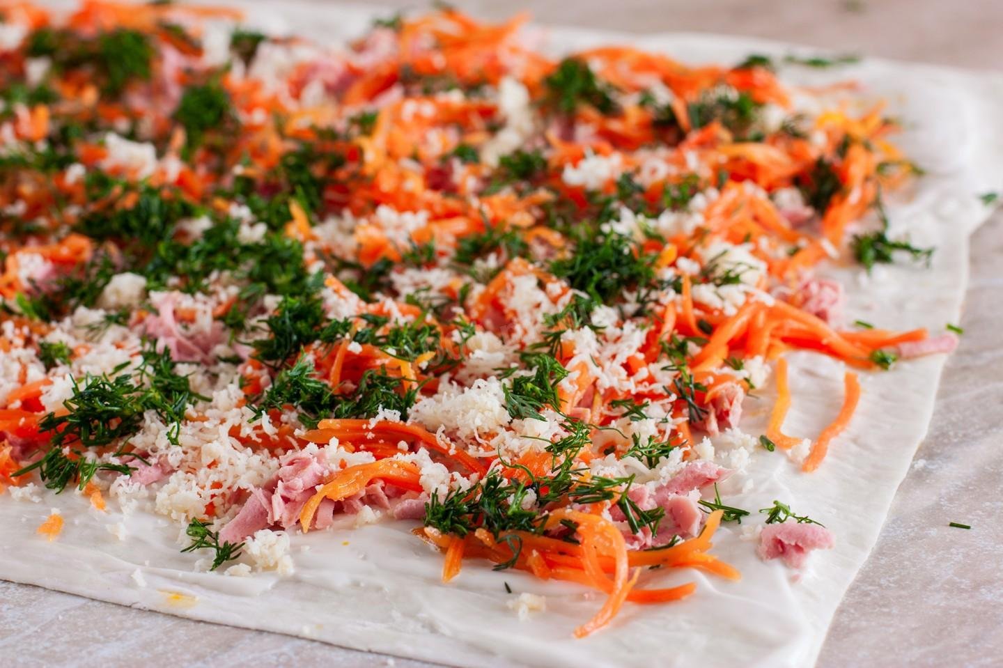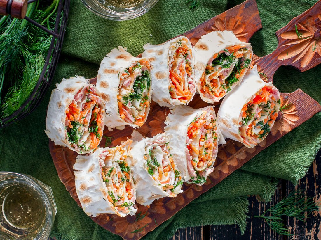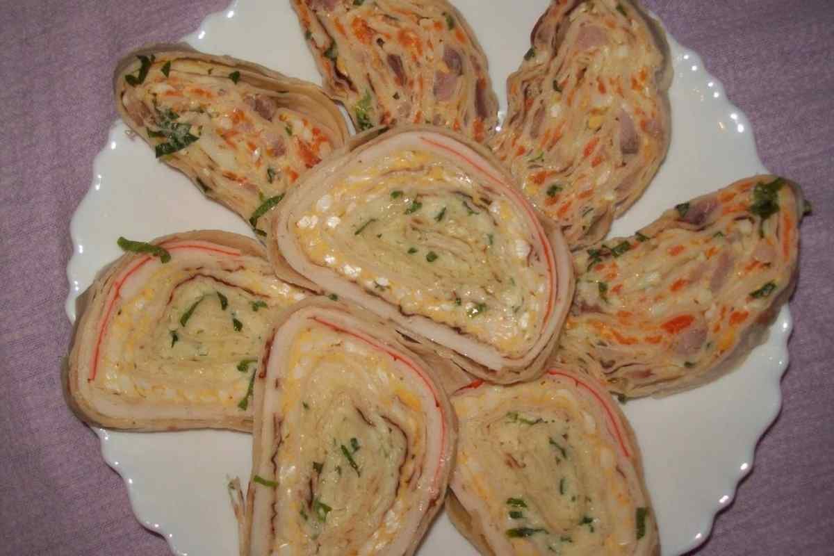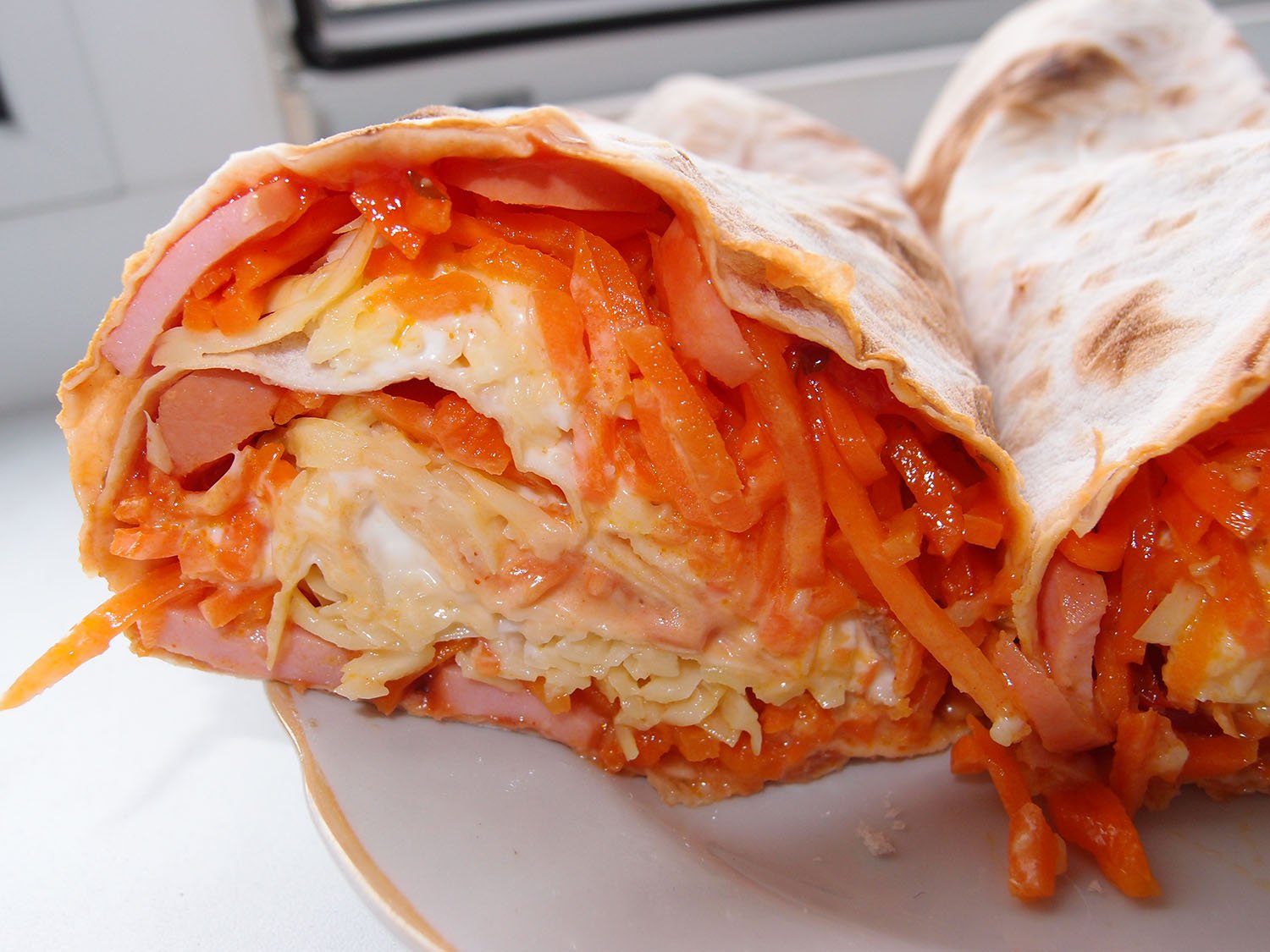 Рулет из лаваша с корейской морковью и сыром и зеленью